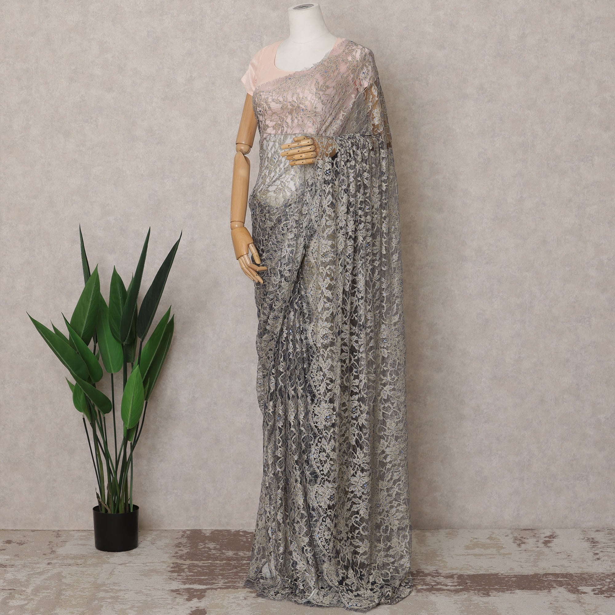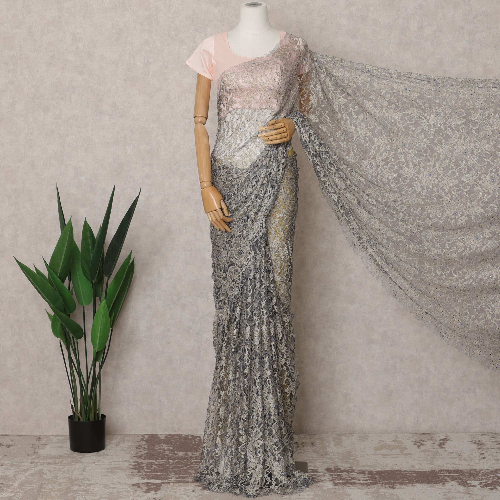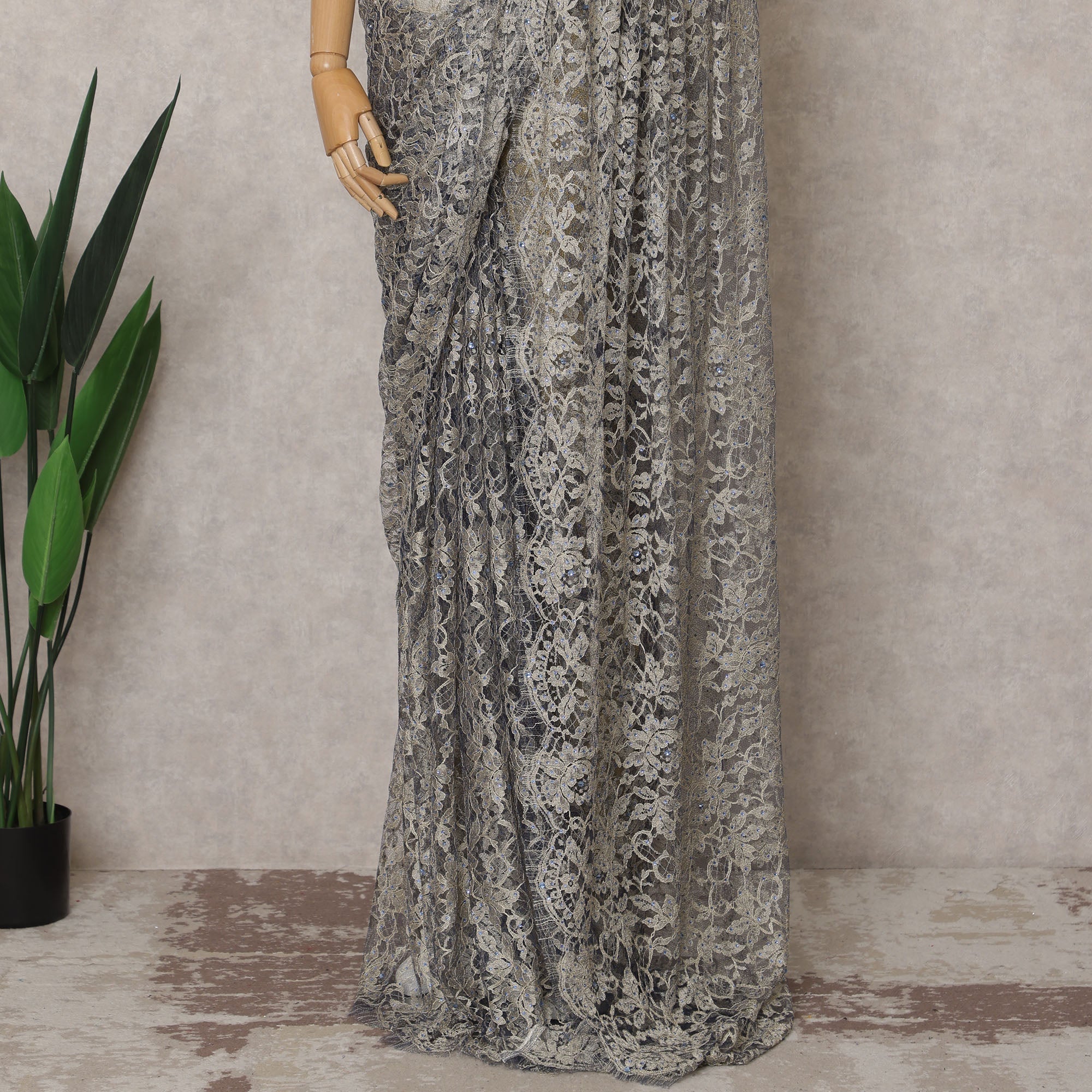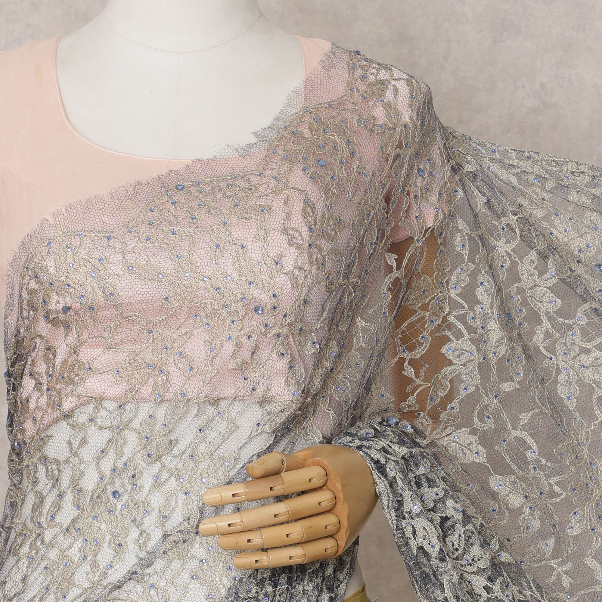 ساري فرنسي فاخر من قماش دانتيل شانتيلي ثنائي اللون باللون الأزرق الذهبي الباهت مع تطريز حجري - طول 5.5 متر وعرض 110 سم - مستورد من فرنسا - D22944