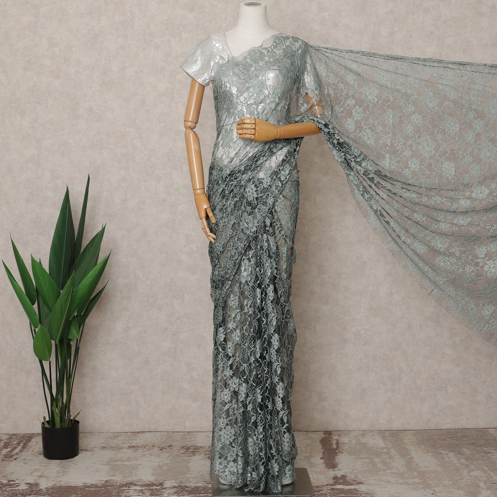 Radiate understated sophistication with this Dusty Green Premium French Chantilly Lace Saree Fabric, a timeless masterpiece that reflects the finesse of authentic French craftsmanship. Imported from France, this 5.5-meter lace fabric is adorned with intricate floral motifs delicately woven into a fine net base, creating a perfect balance of elegance and charm. The soft dusty green hue exudes subtle grace and modern allure, making it an excellent choice for bridal sarees, festive ensembles, or designer couture creations. Crafted from premium Chantilly lace, it offers a lightweight, breathable texture with a smooth, flowing drape that enhances every silhouette beautifully. The detailed scalloped edges add an artistic designer finish, symbolizing the precision and beauty of European weaving tradition. Designed without a blouse piece, it allows creative flexibility to pair with metallic, pastel, or contrasting tones for a personalized couture look. To retain its luxurious texture and delicate detailing, dry clean only. Shop online now to experience the unmatched allure of genuine French lace that defines elegance in every weave.
