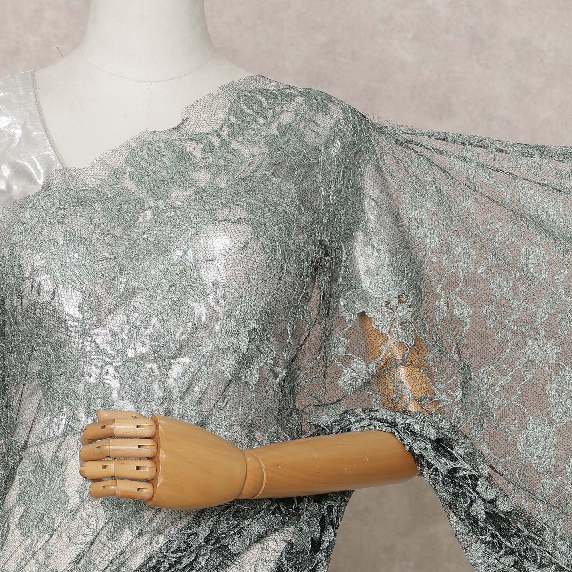 Premium French Chantilly lace fabric in an elegant dusty green shade.