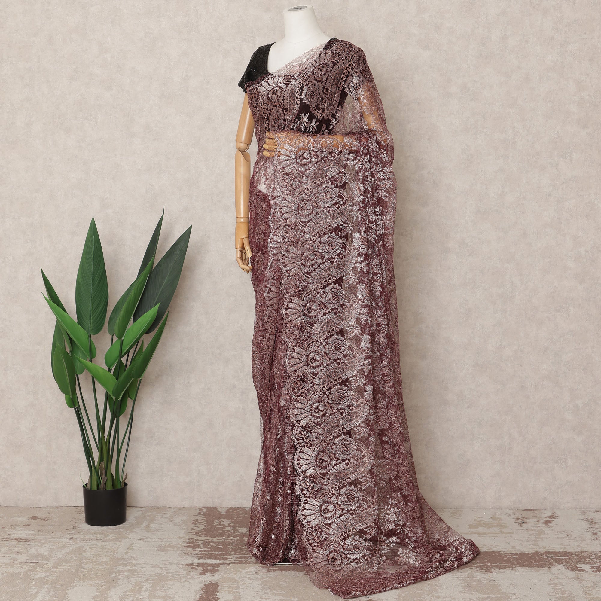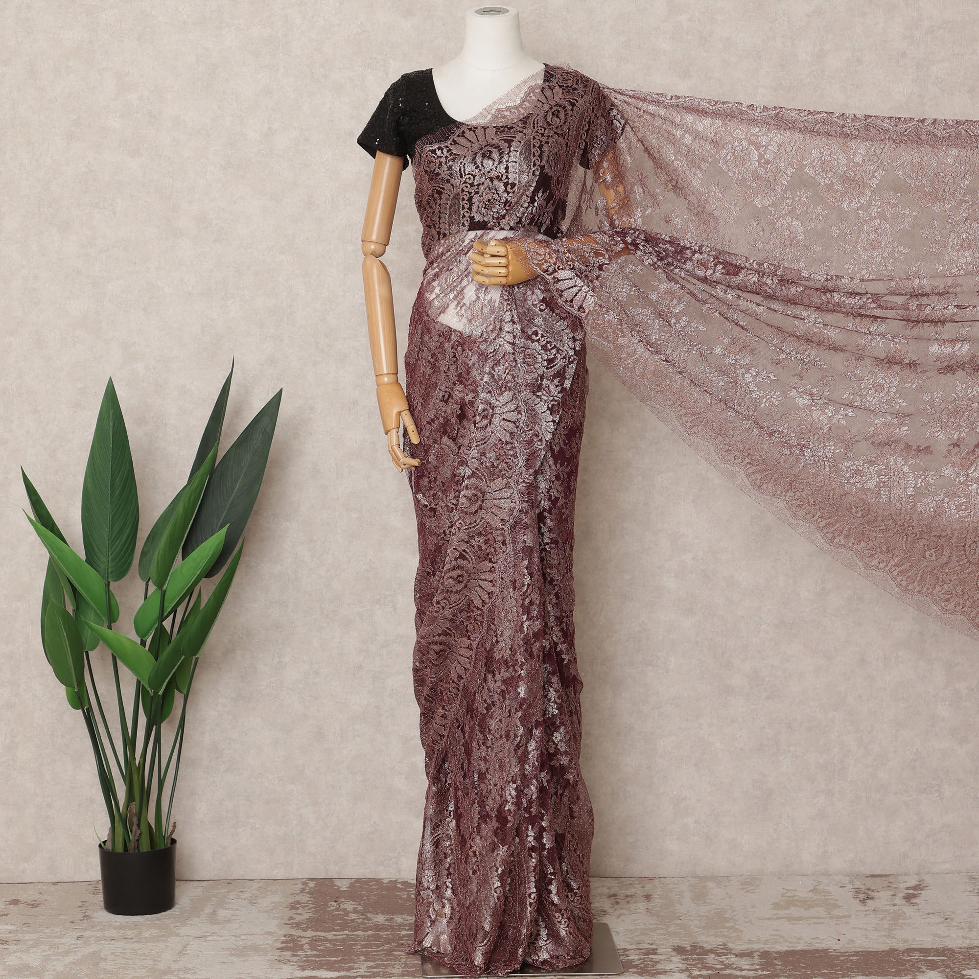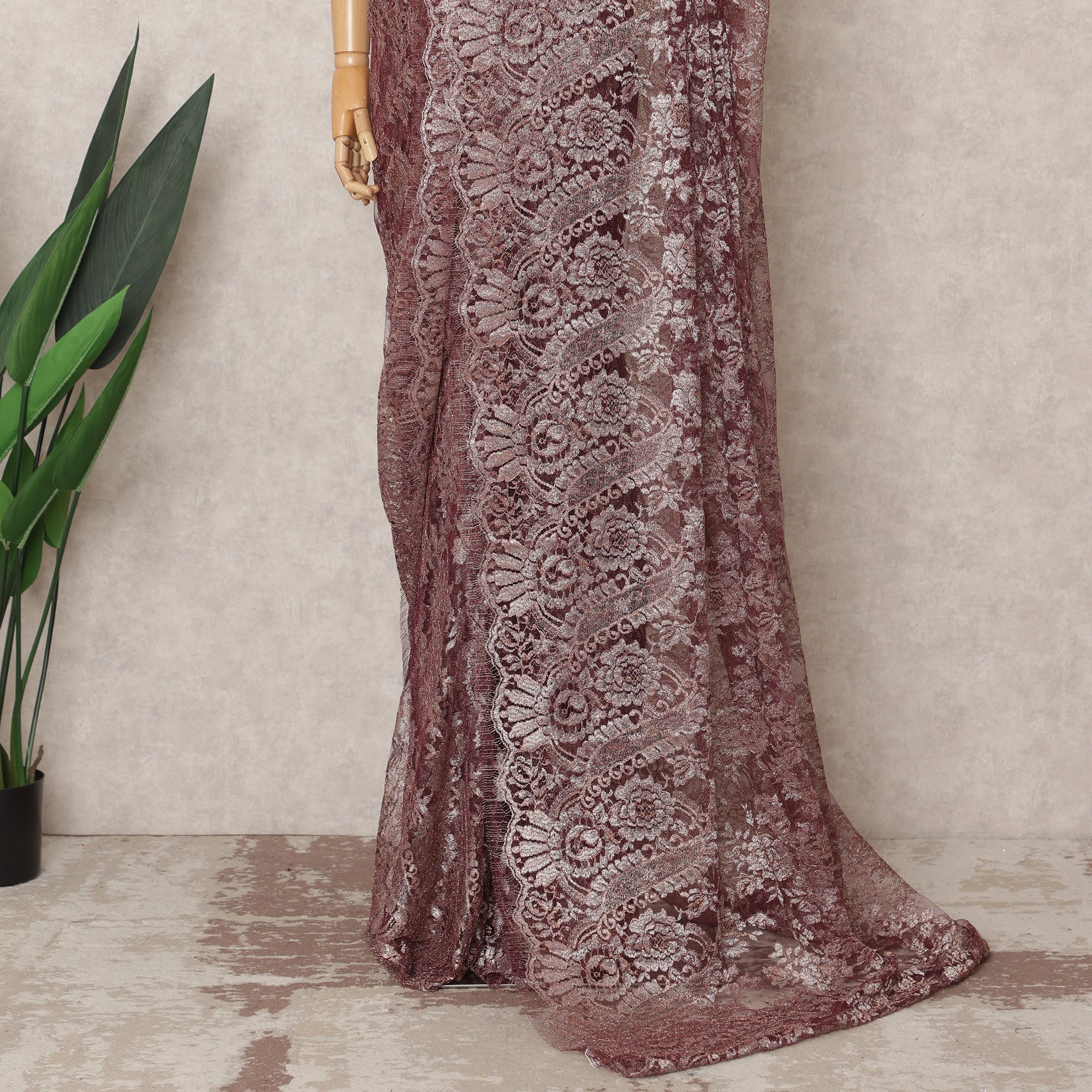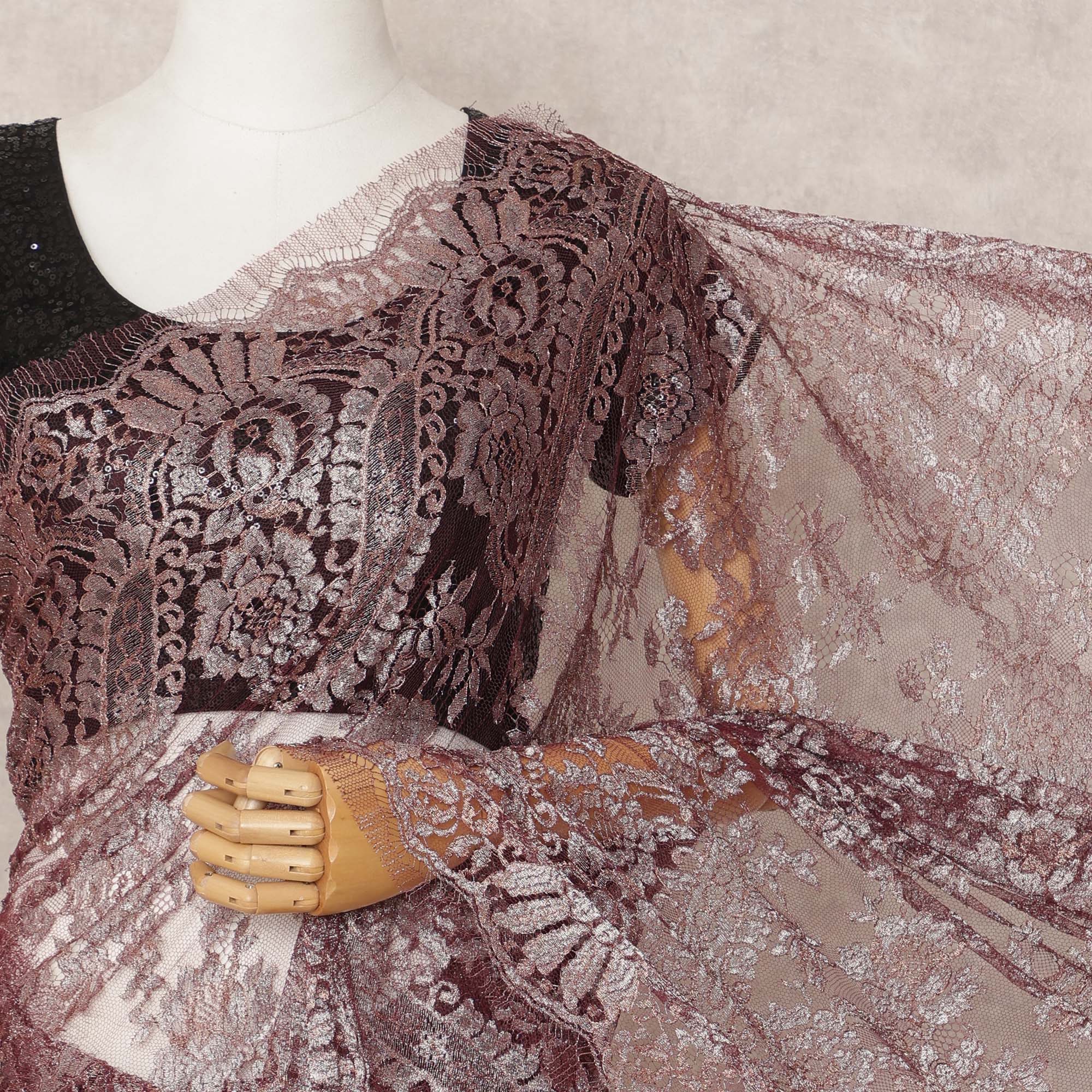 صُنع ساري دانتيل شانتيلي الفرنسي المعدني الفاخر بلون العنابي الداكن بأناقة وتقاليد راقية، وهو مزيج فاخر من التراث العريق والأسلوب المعاصر. يبلغ طوله حوالي 5.5 أمتار وعرضه 110 سم، ويتميز بلون العنابي الداكن الأنيق المعزز بلمعان معدني يشع أناقة. منسوجة بدقة في قاعدة شبكية شفافة، مما يضفي عليه سحرًا رومانسيًا وخلّابًا، مثاليًا للمناسبات الخاصة. سواءً تم تنسيقه للاحتفالات الرسمية أو المناسبات الاحتفالية، فإن انسيابيته ولمسته النهائية المضيئة توفران الراحة والجاذبية. صُمم هذا القماش في فرنسا باستخدام تقنيات دانتيل شانتيلي العريقة، ليعكس الجودة العالية والدقة الحرفية. لا يشمل المنتج بلوزة.