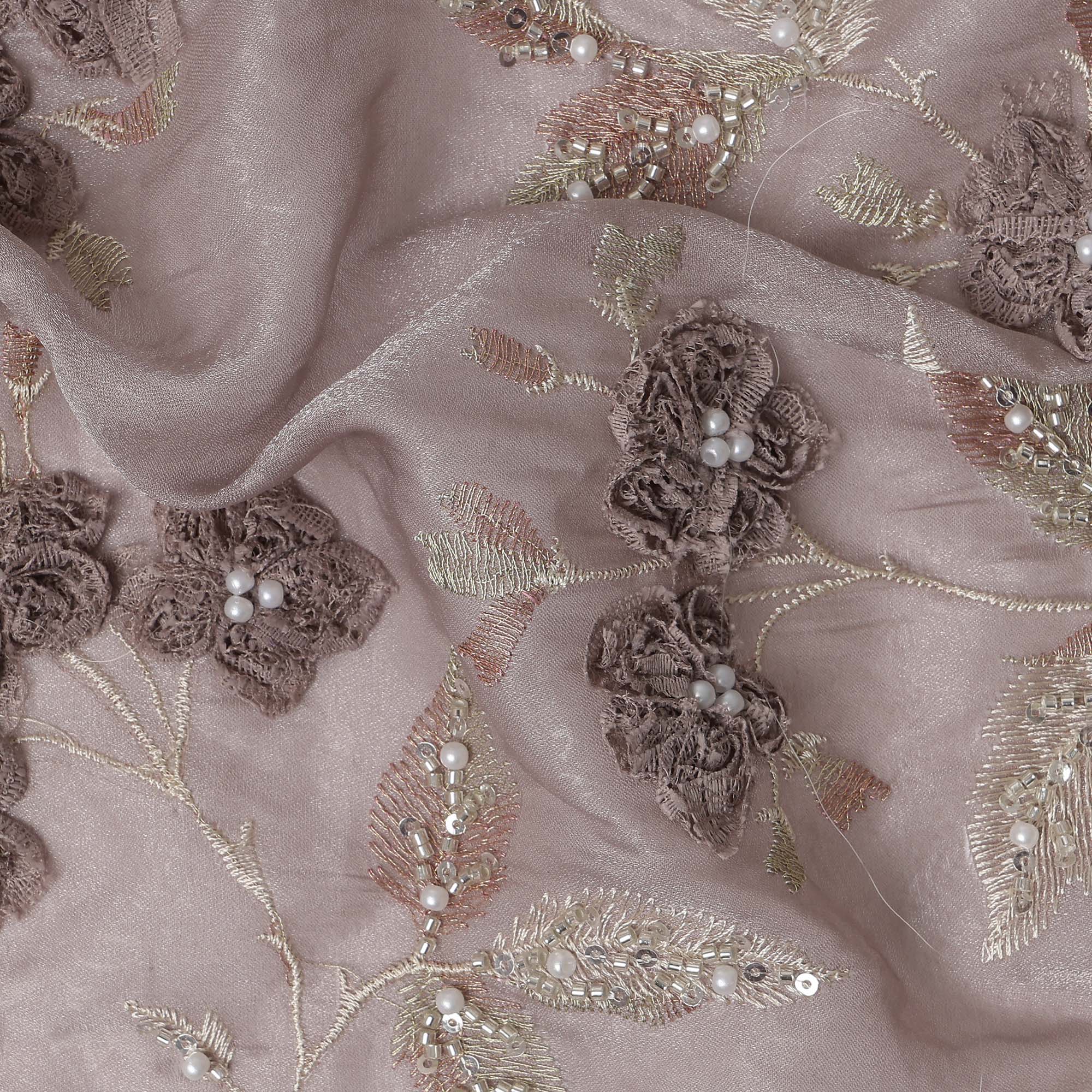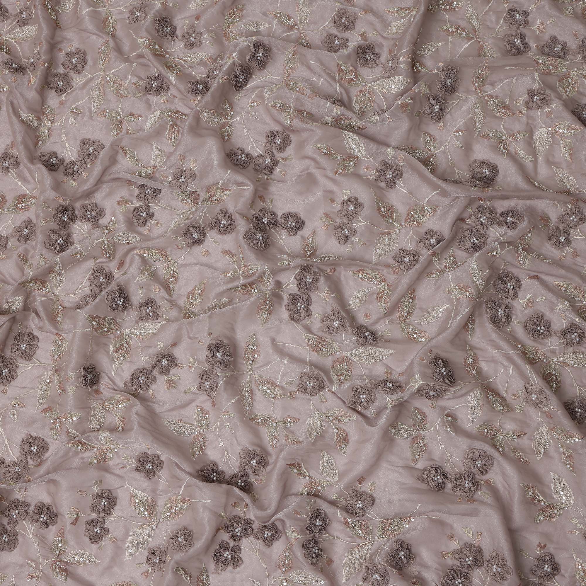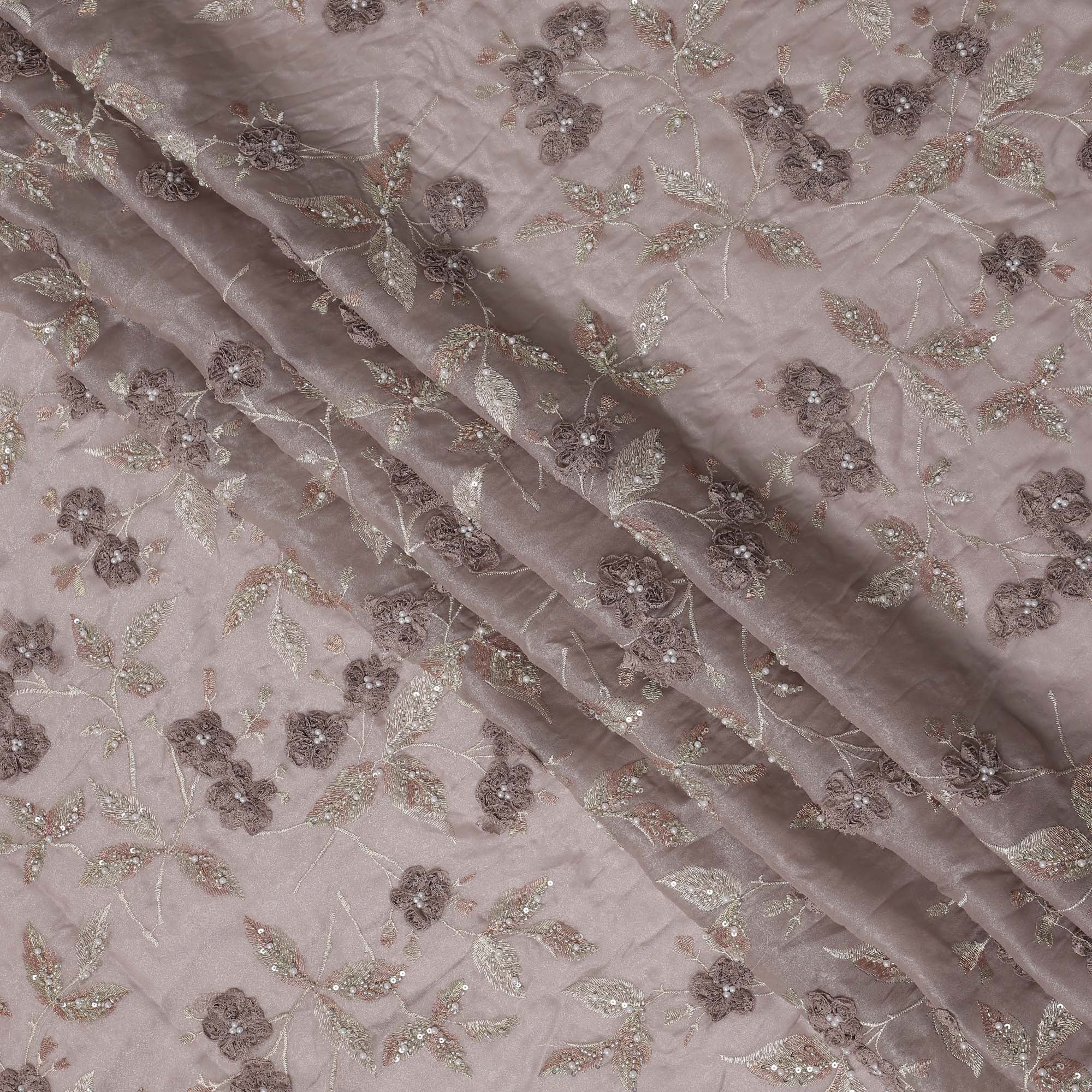 Dusty Mauve Floral Embroidered Sequin Work Synthetic Organza Fabric, 110 cm Width, Made in India-D26652