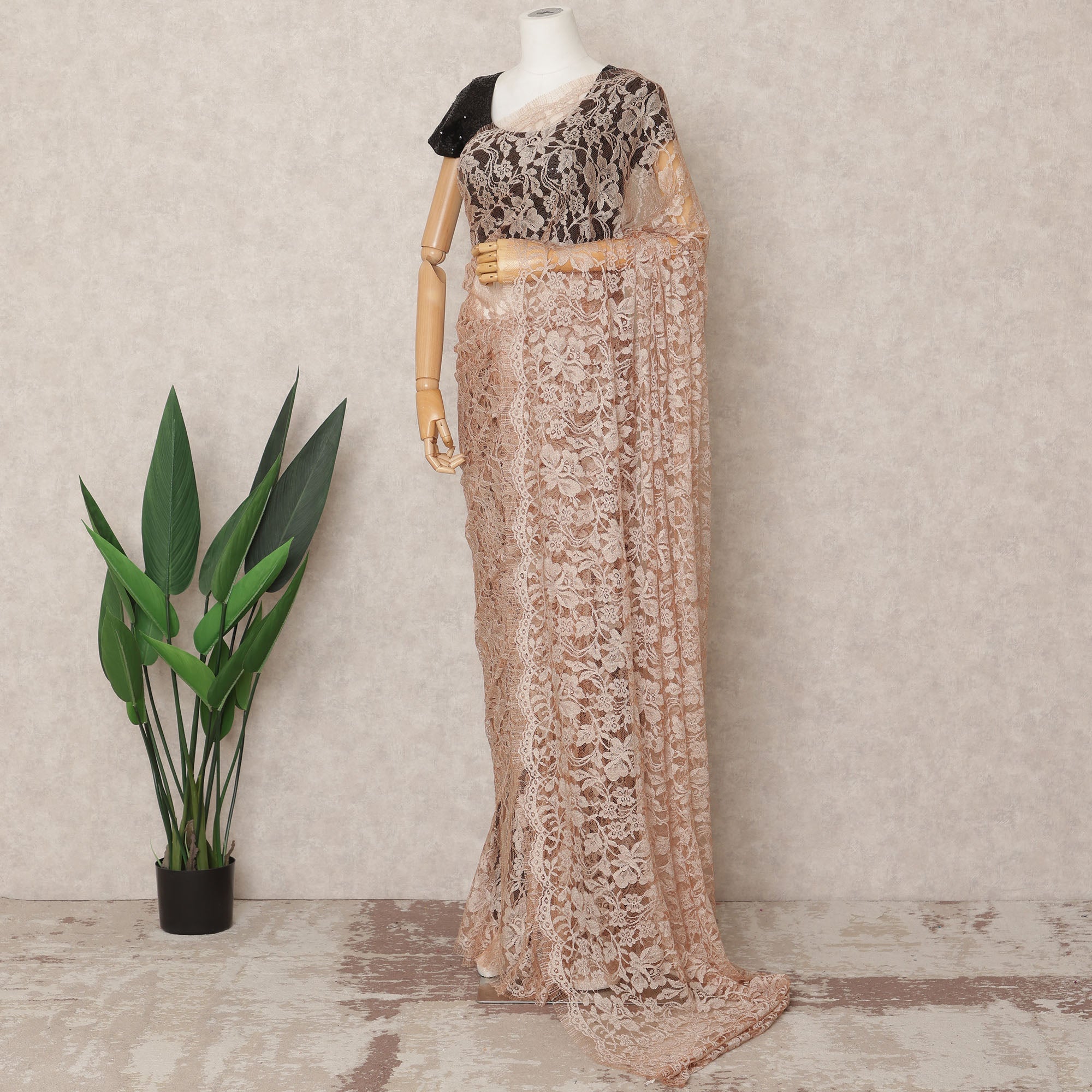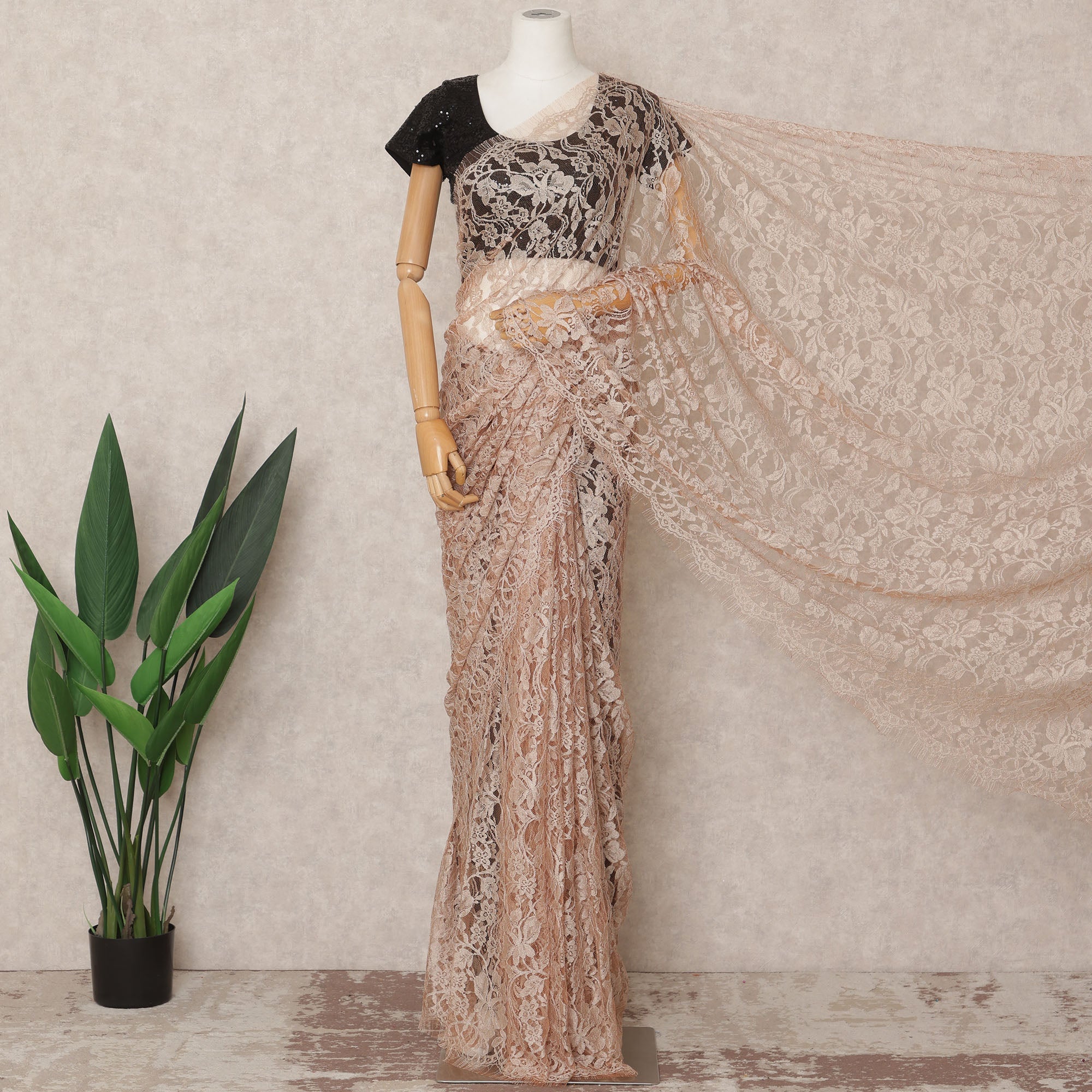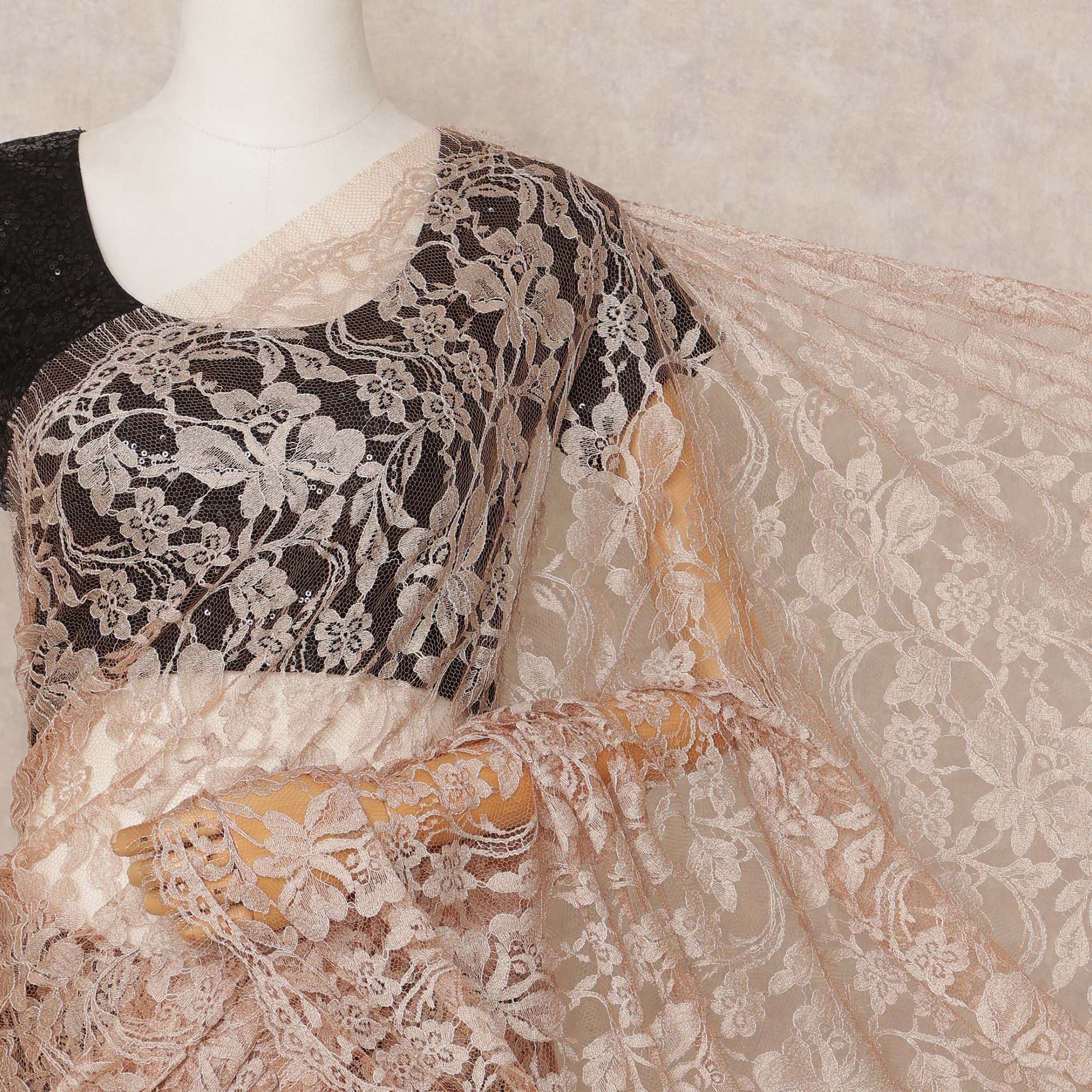 قماش ساري شانتيلي فرنسي فاخر بلون الخوخ الباهت، ثنائي اللون، بطول ٥.٥ متر تقريبًا، وعرض ١١٠ سم، صنع في فرنسا - D24071