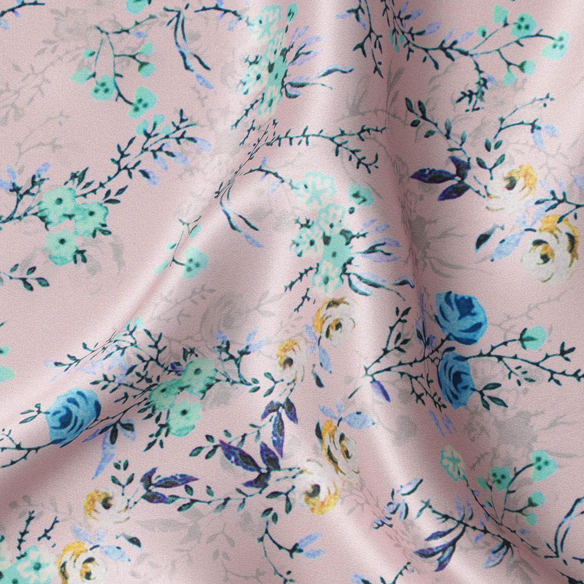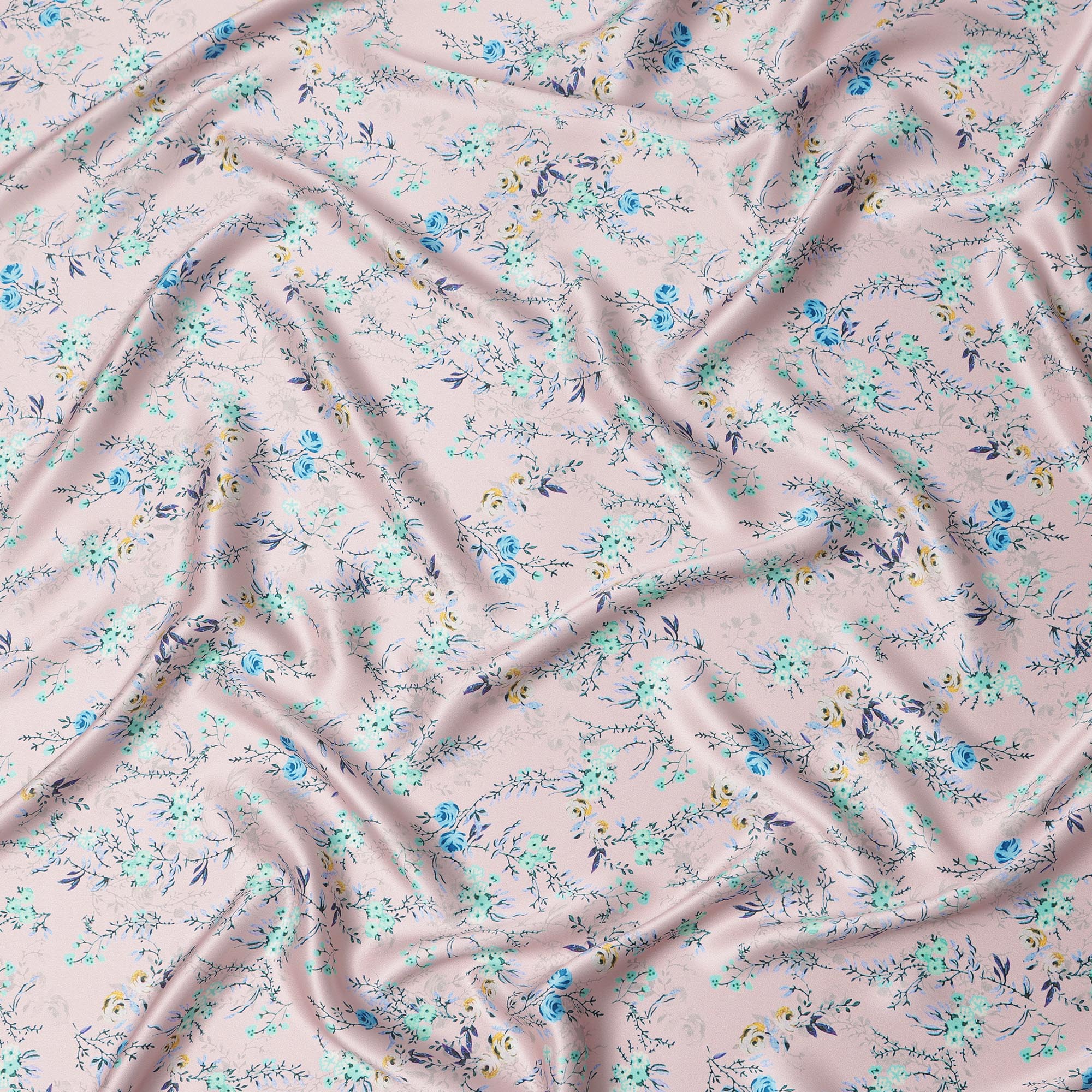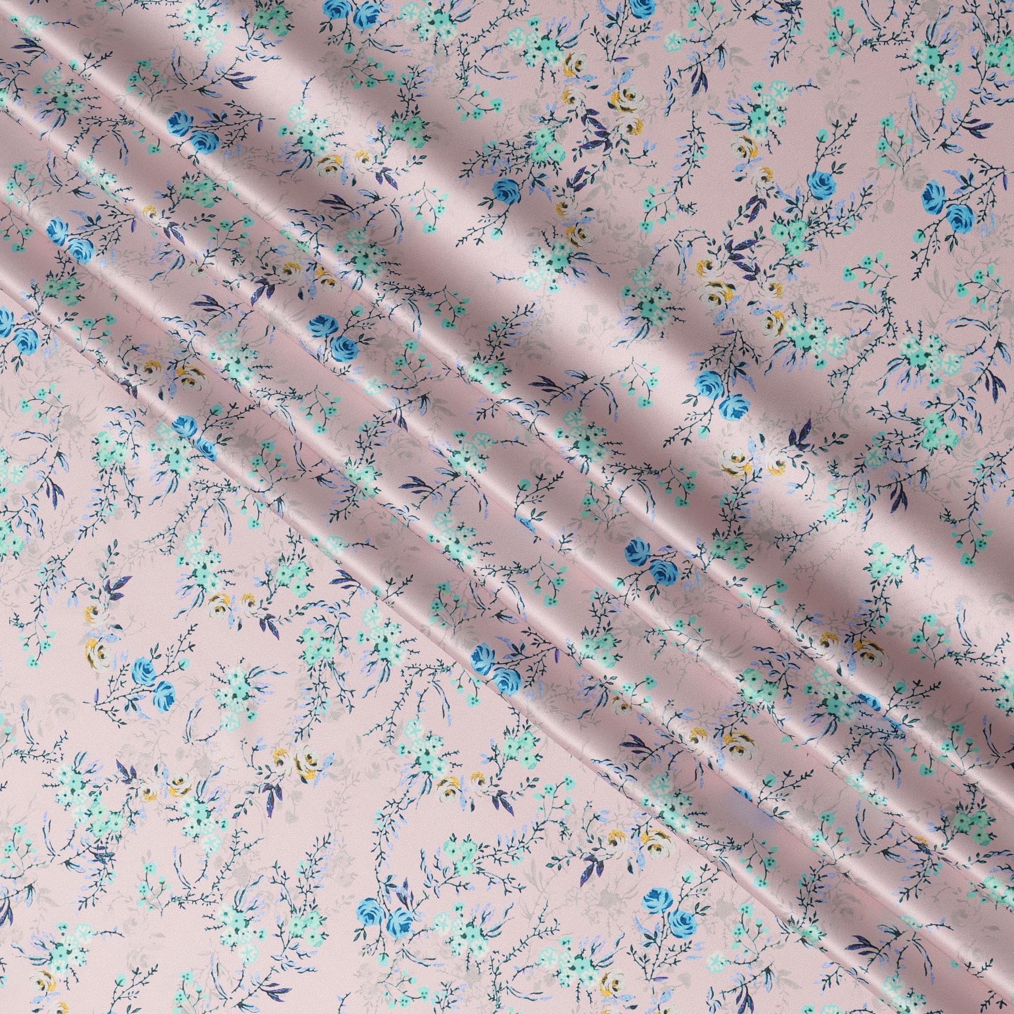 قاعدة وردية باهتة مع طباعة زهور صغيرة باللون الأزرق والأصفر والأزرق المائي، قماش حرير ساتان إيطالي فاخر، عرض 140 سم، صنع في إيطاليا - D22990