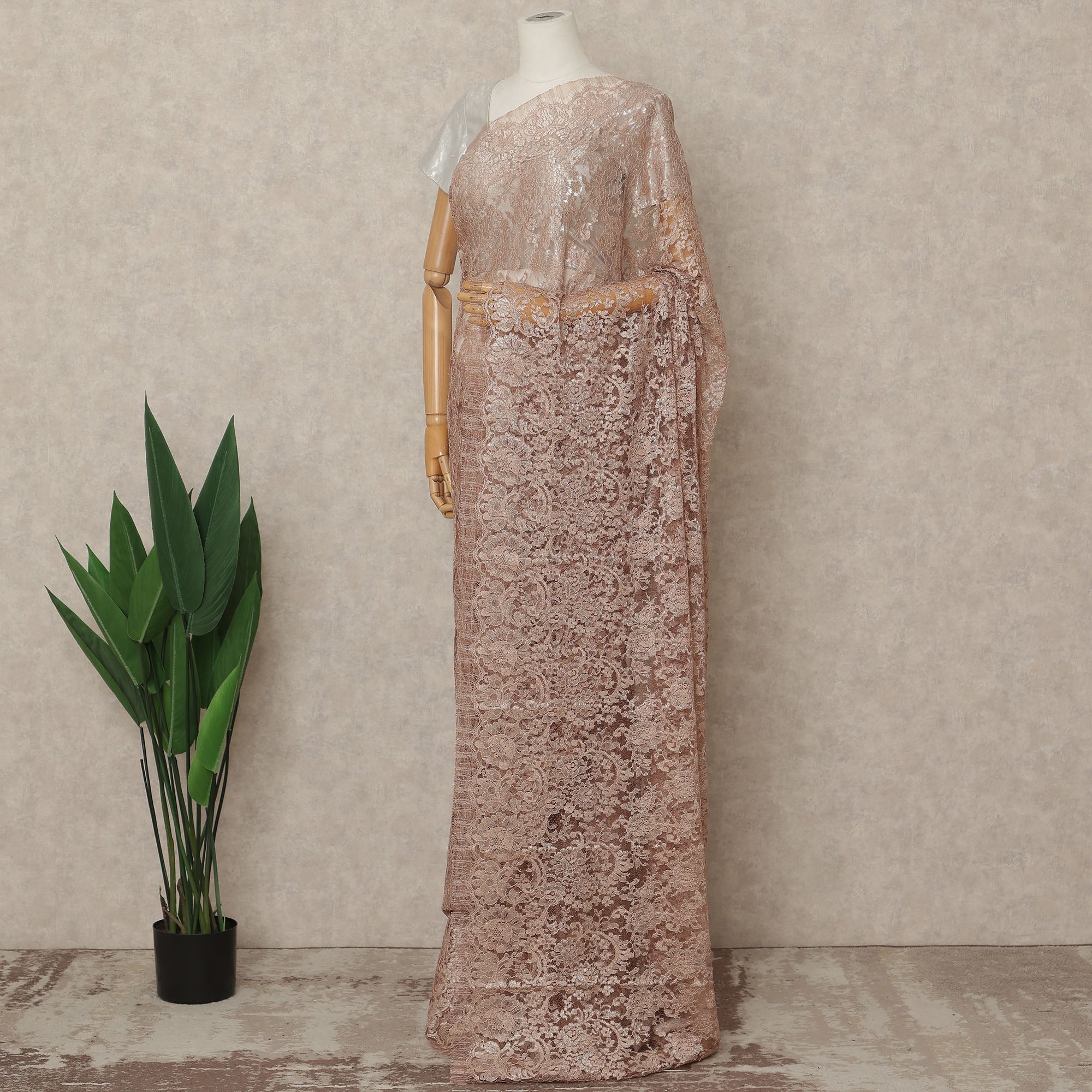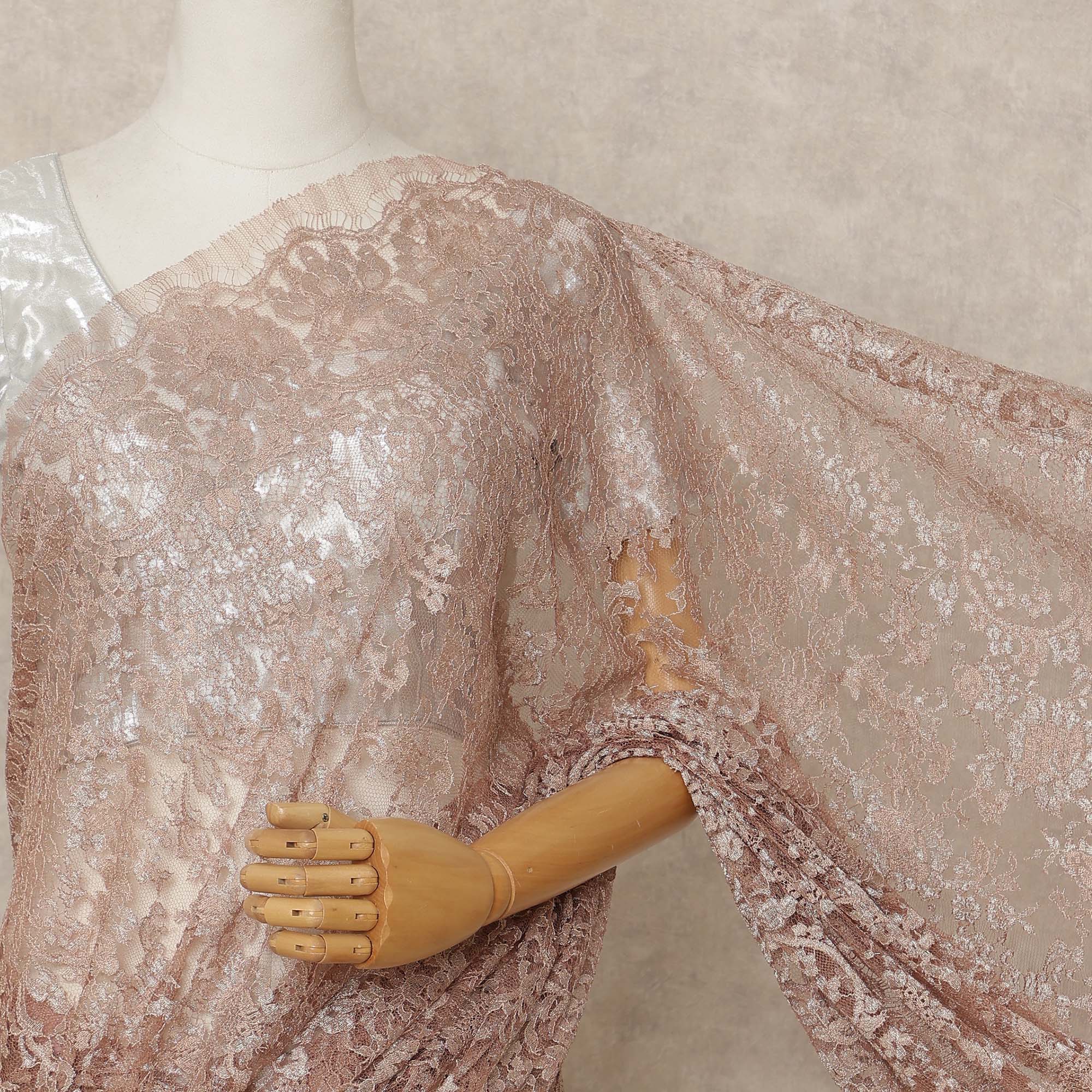 Dusty Rose Premium French Metallic Chantilly Lace Saree Fabric, 5.5 Mtrs Length, 110 Cms Width, Crafted in France – Soft Metallic Floral Lace, Blouse Not Included-D26416