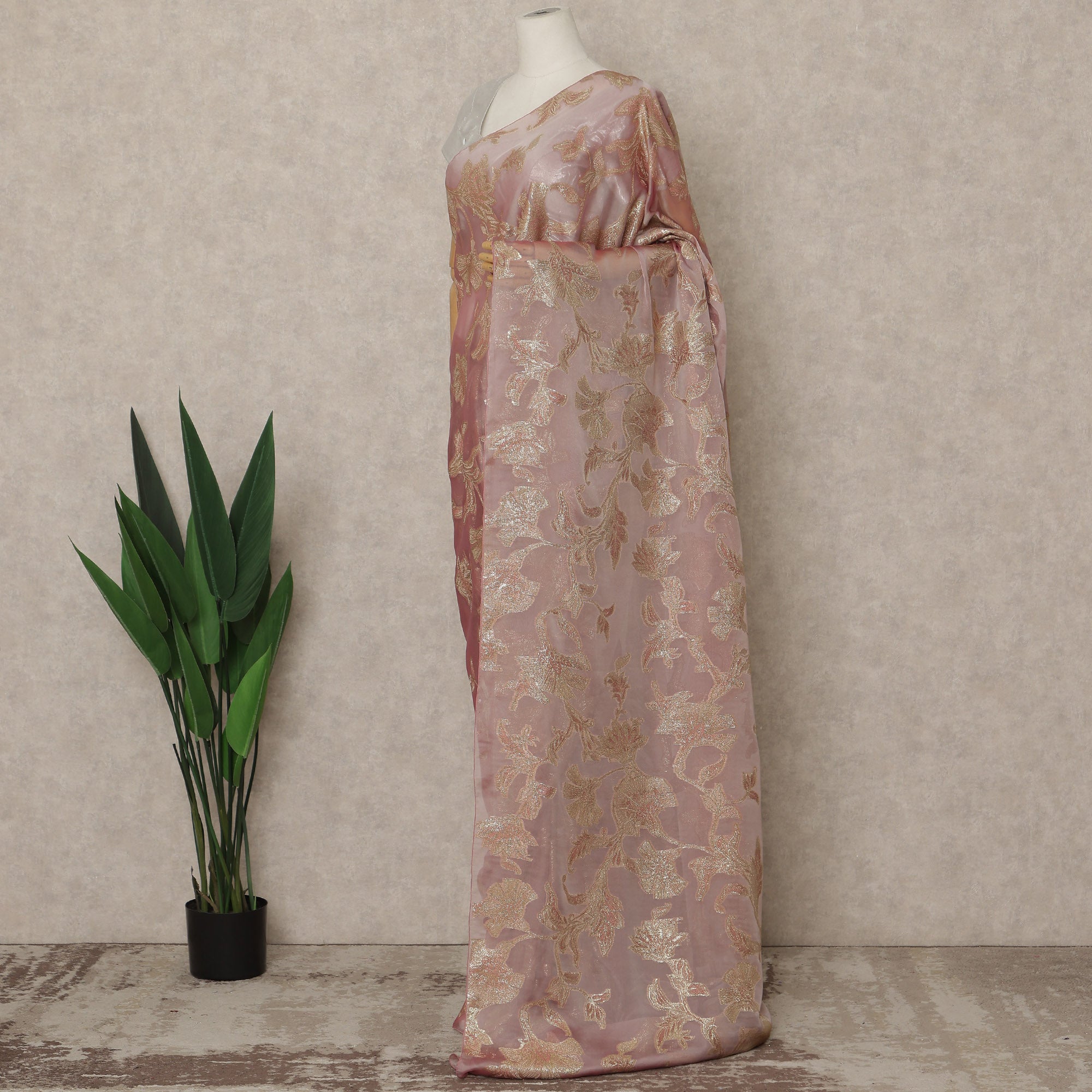 Dusty Rose Premium French Silk Chiffon Saree With Gold Floral Woven Design 5.5 Mtrs Length 110 Cms Width, Made in France and Blouse Not Included-D27222