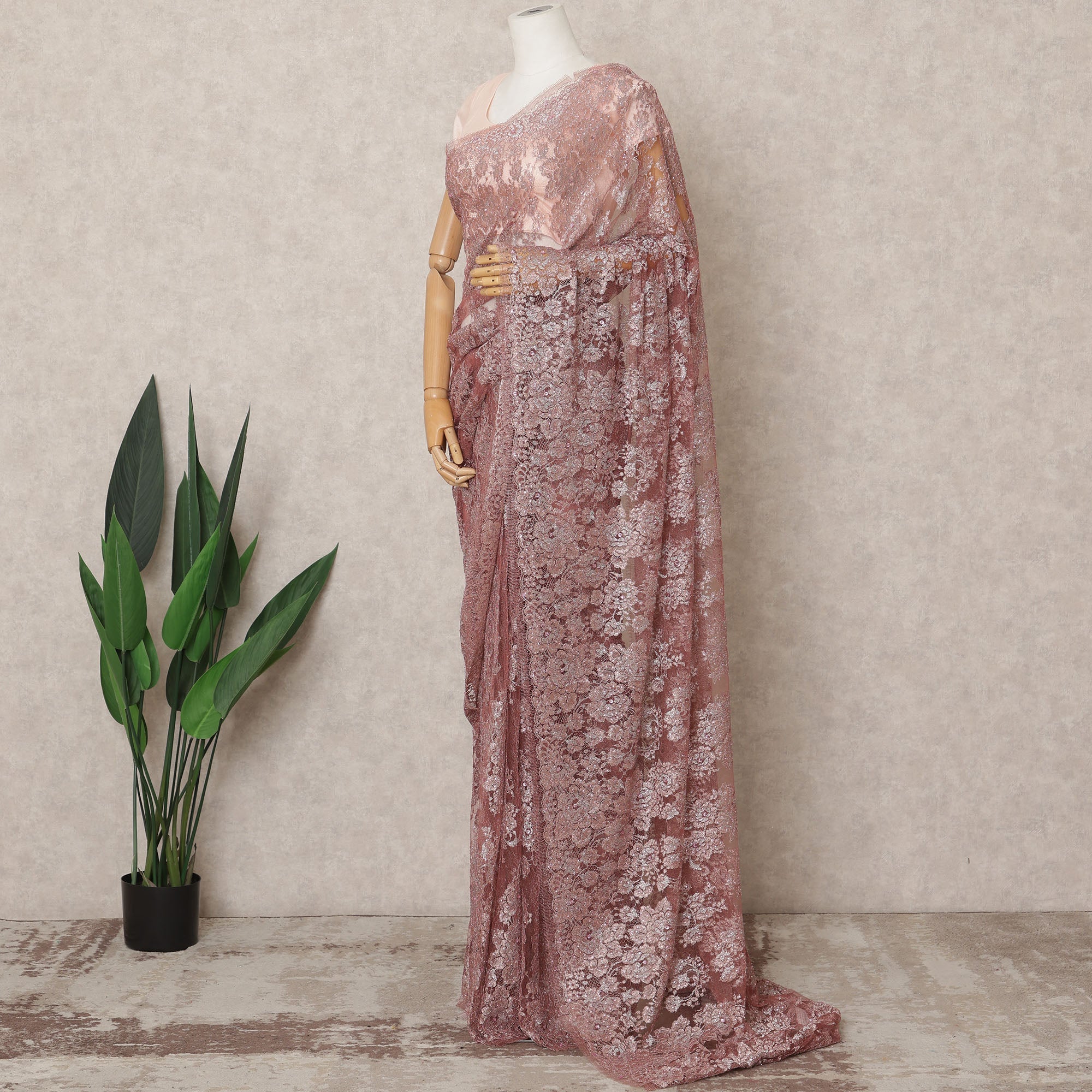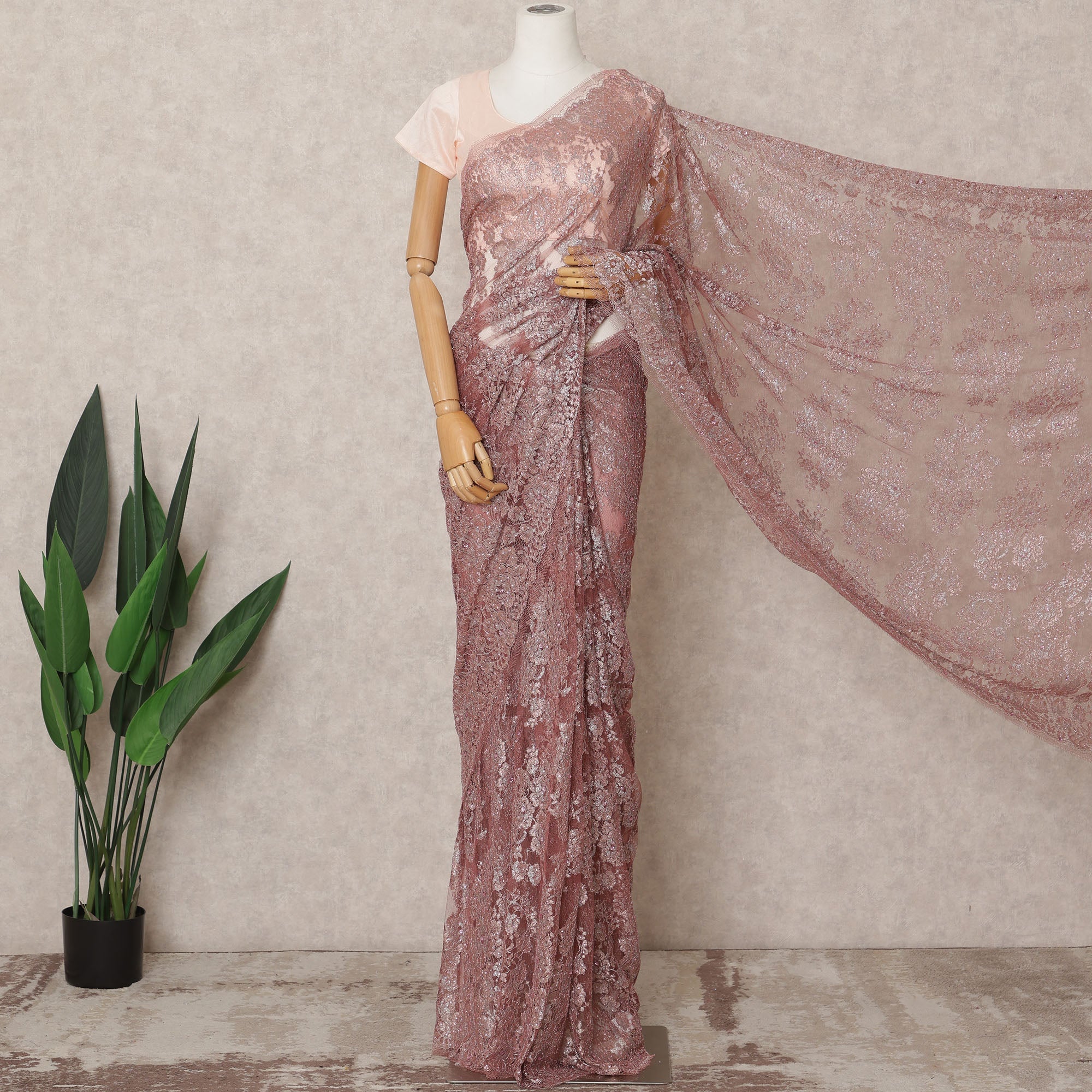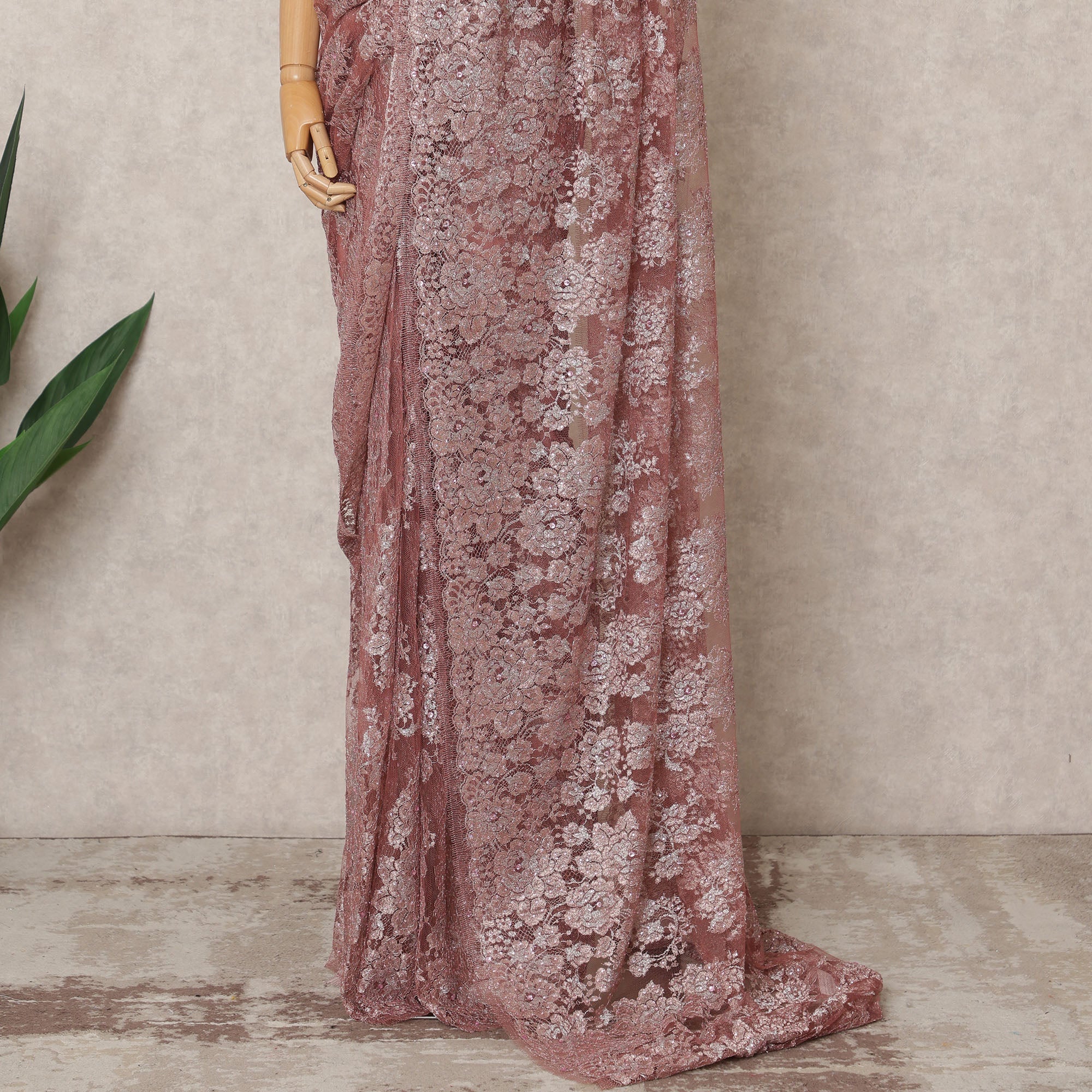ساري داستي روز الفاخر من الدانتيل الشانتيلي المعدني مع تطريز حجري، بطول 5.5 متر، وعرض 110 سم، صنع في فرنسا - D23868