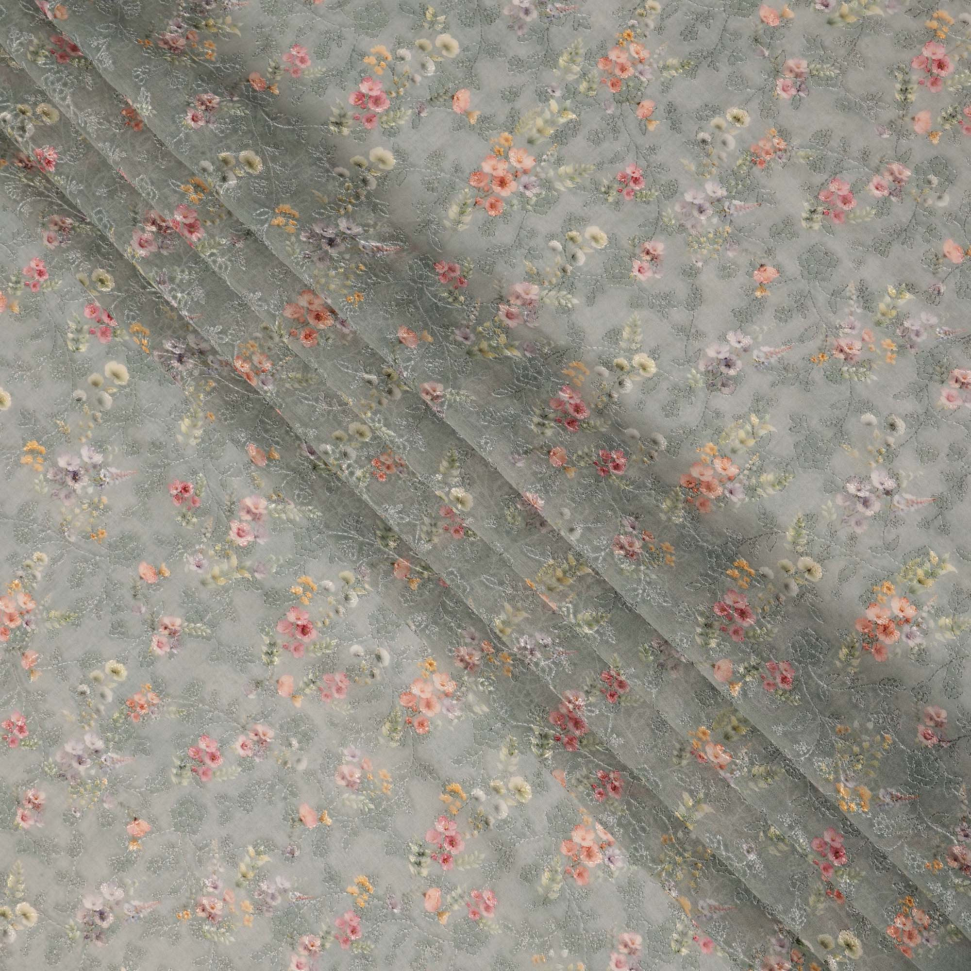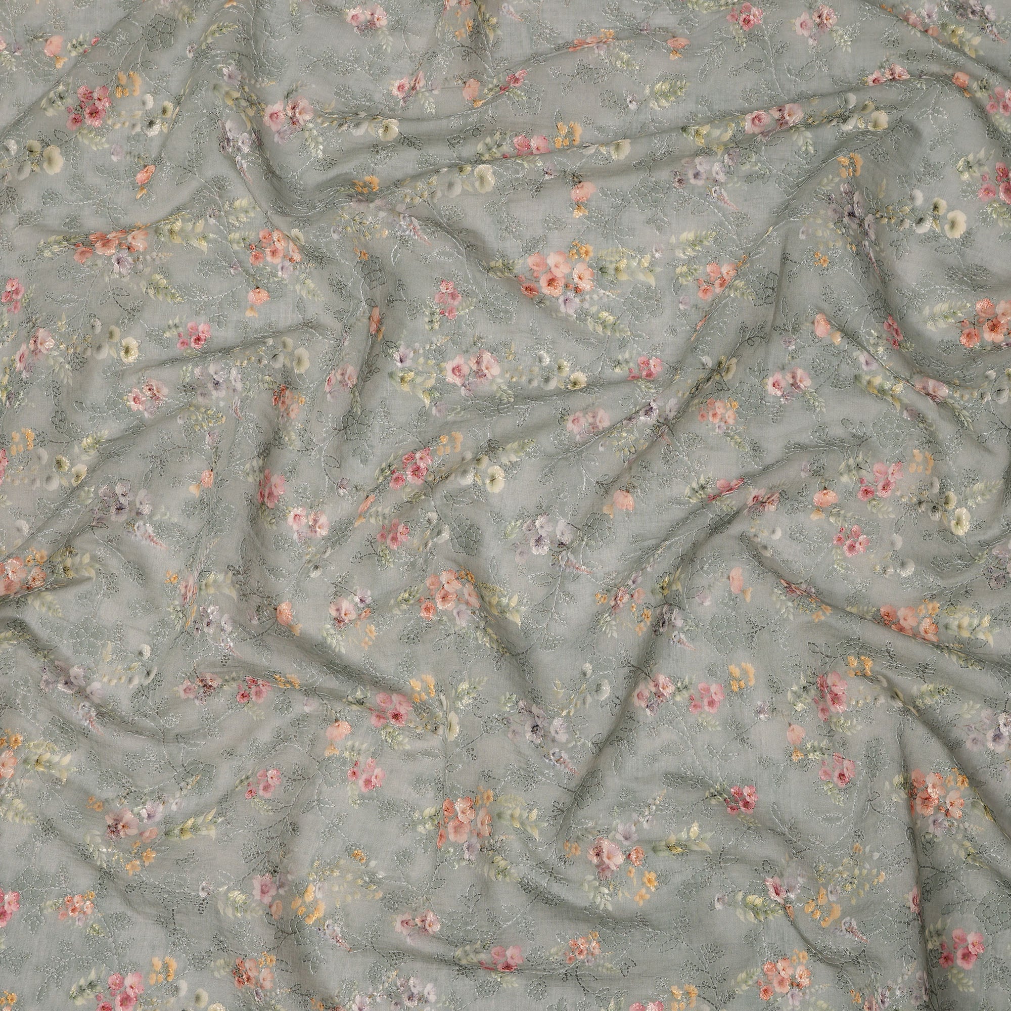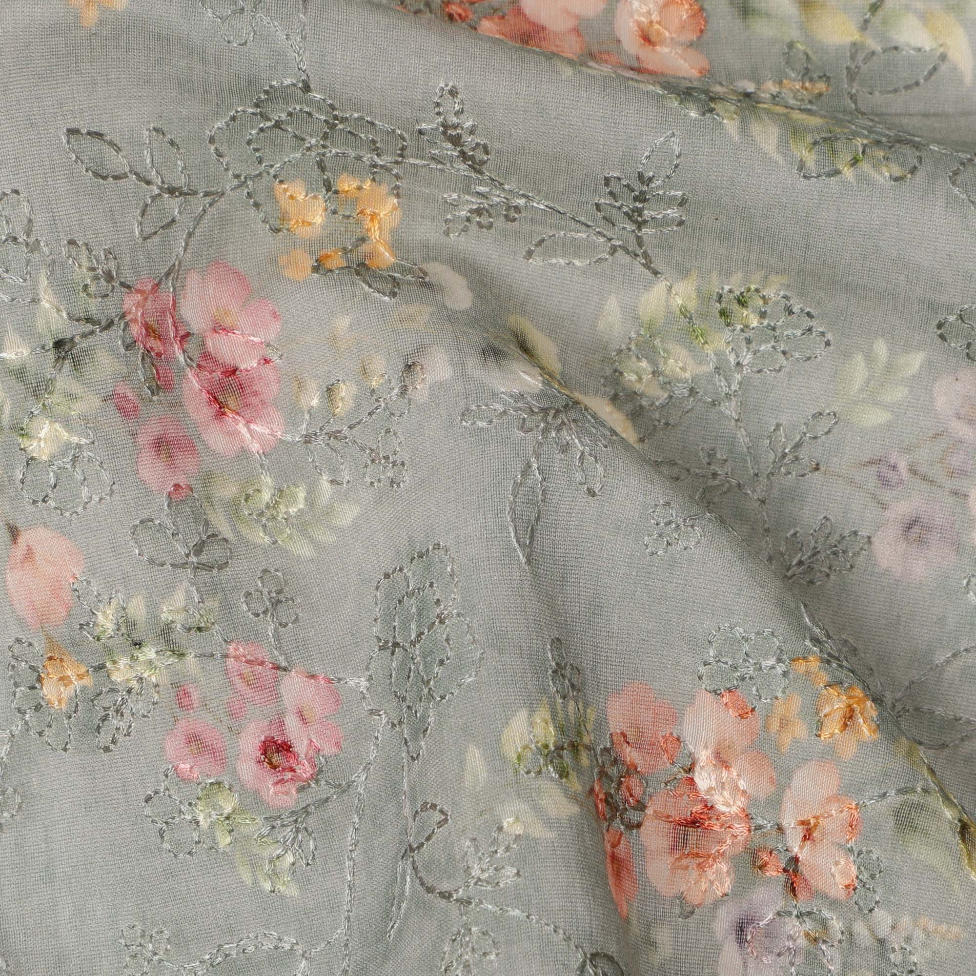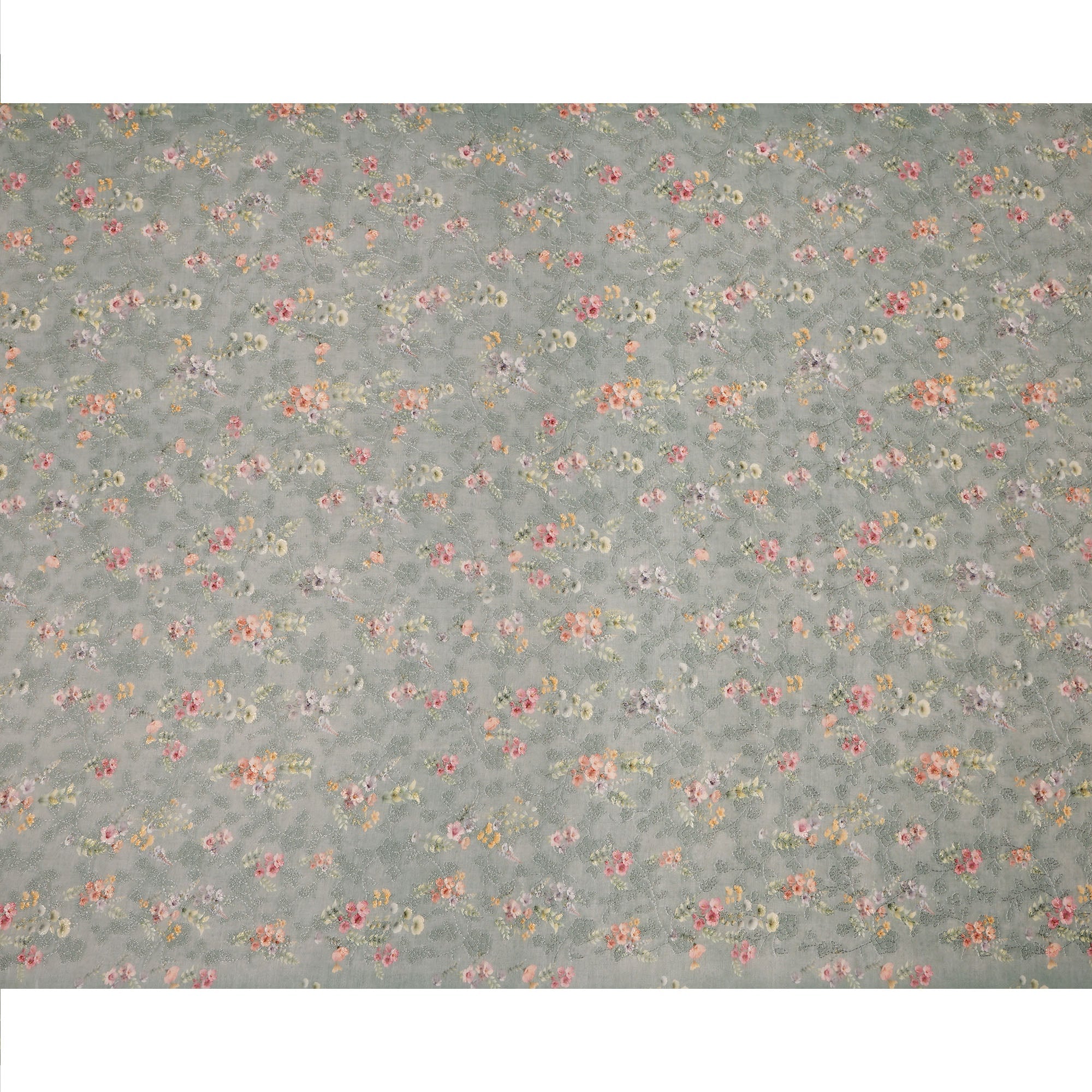 قماش فوال قطني بلون أخضر حكيم باهت مع طبعة زهور متعددة الألوان وتطريز دقيق متناسق، 110 سم، الهند - D23856
