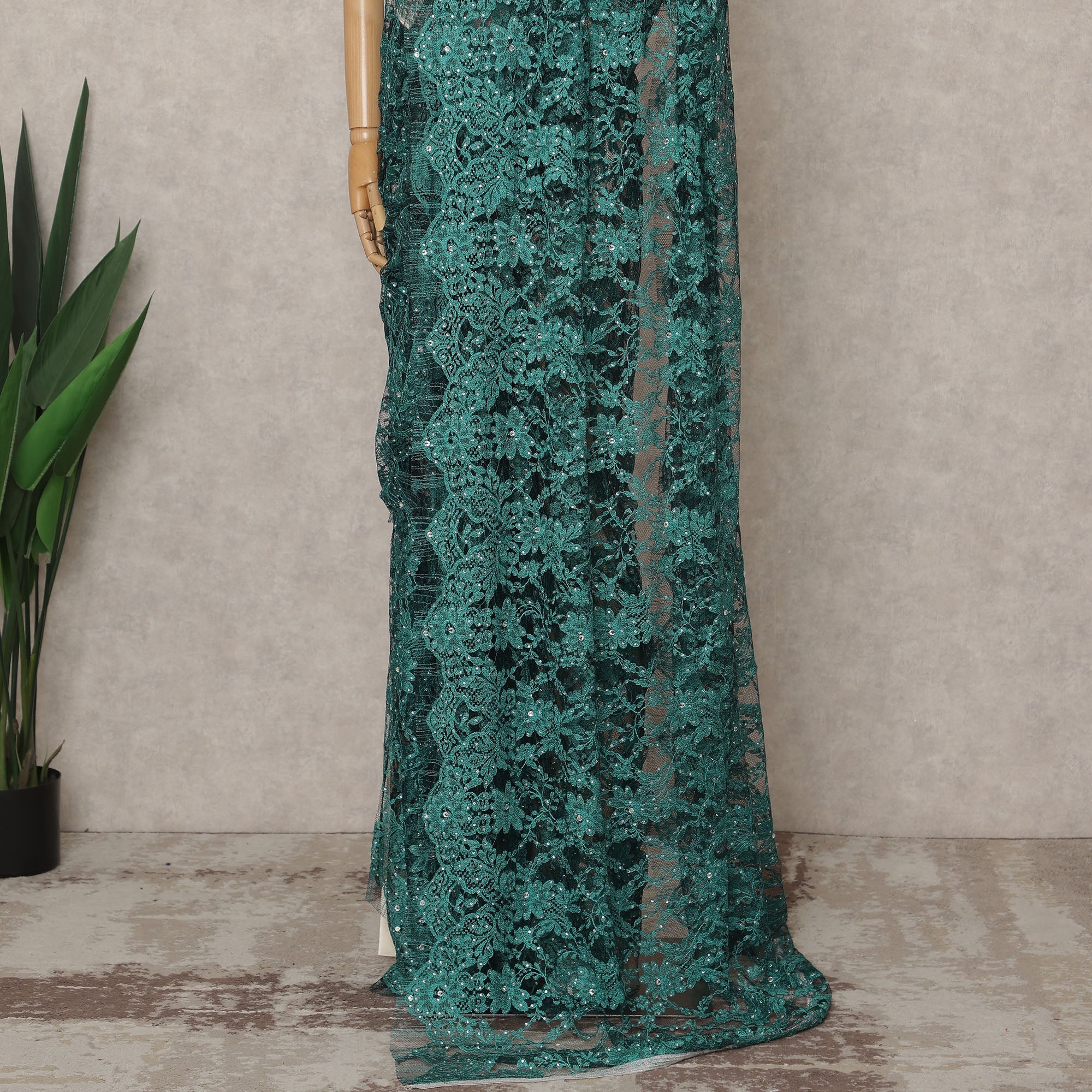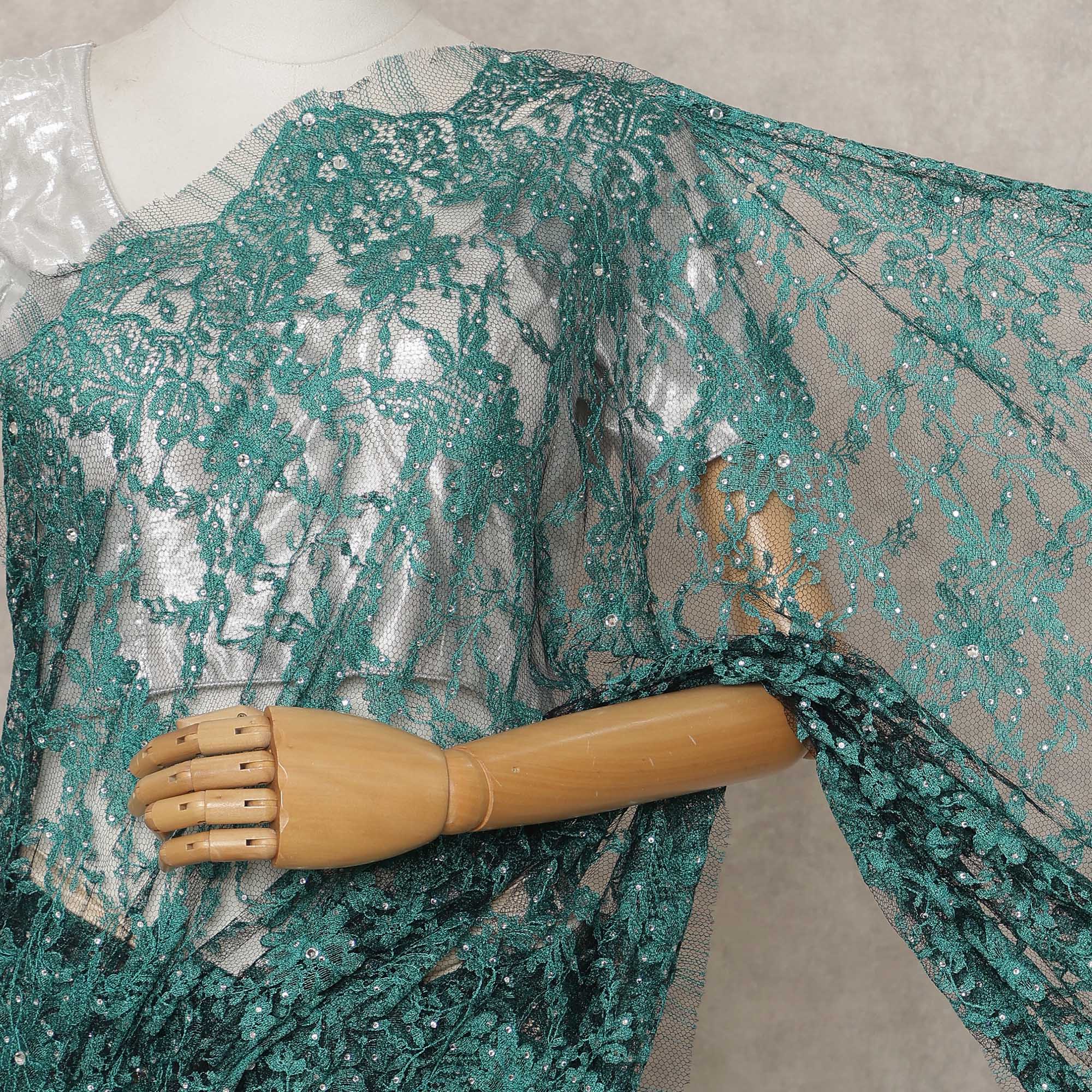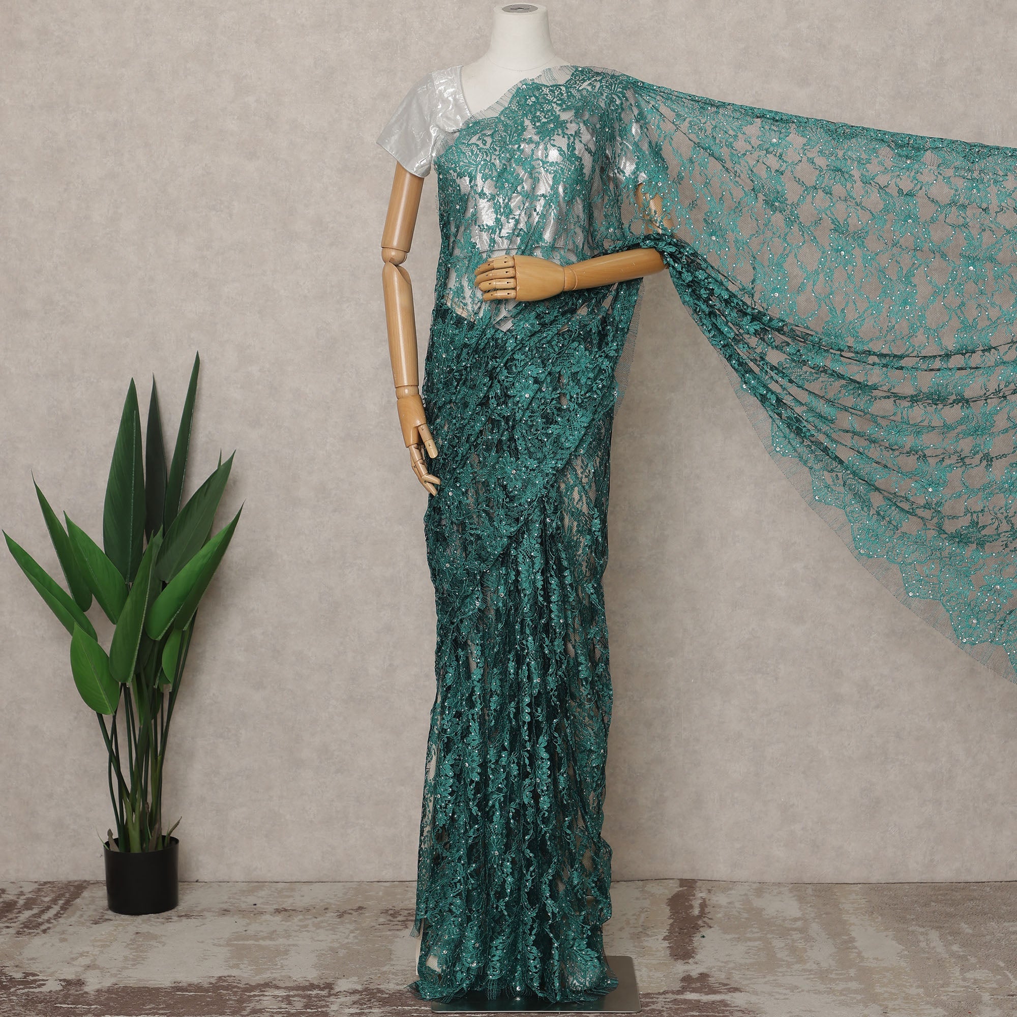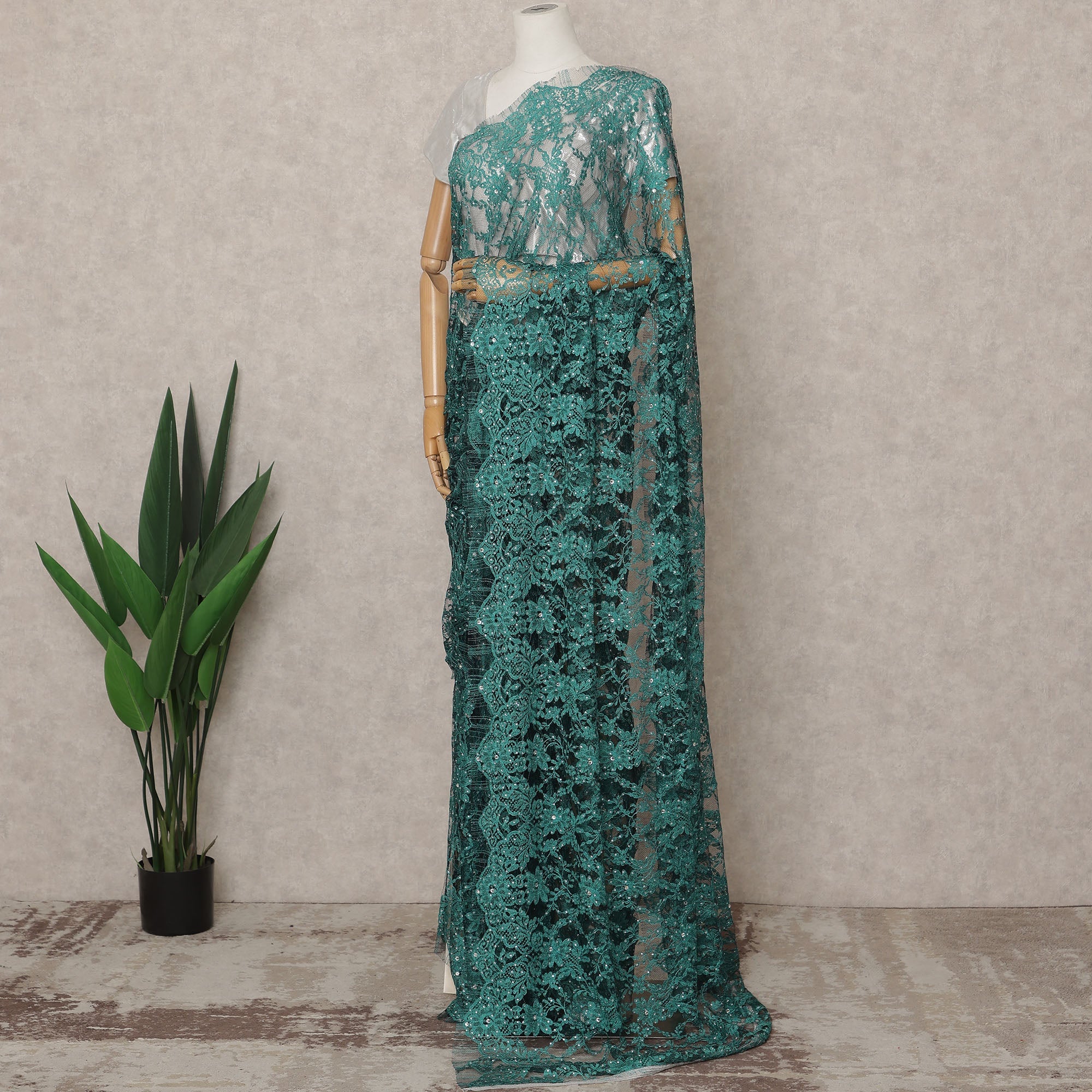 ساري فرنسي فاخر باللون الأزرق الزمردي من الدانتيل الشانتيلي ثنائي اللون مع تطريز حجري، عرض 110 سم، 5.5 متر، فرنسا - D25561