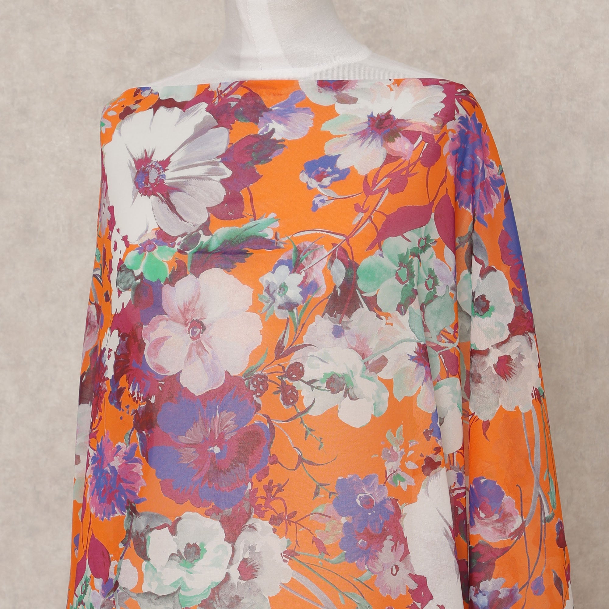 قماش ديراك من القطن الصومالي بلون برتقالي ناري مع طبعة زهور متعددة الألوان - 3.5 متر، عرض 140 سم، صنع في إيطاليا - D24545