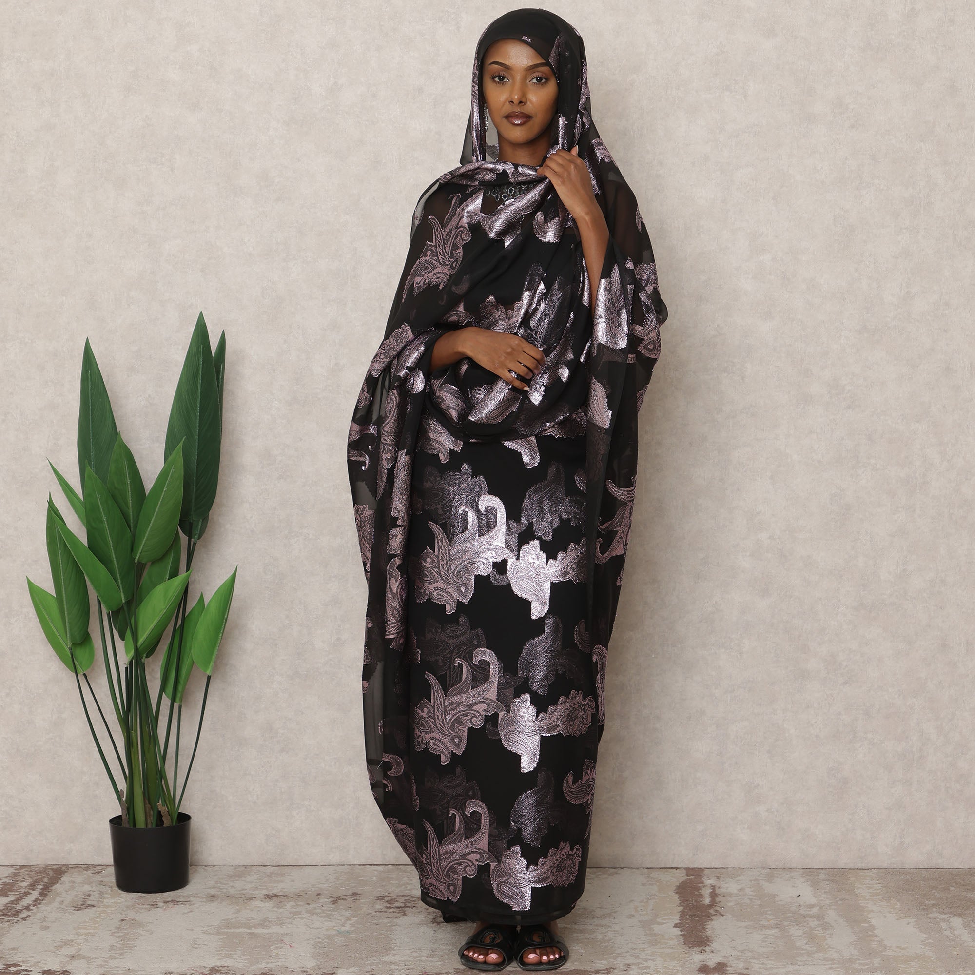 ثوب سوداني تقليدي أسود من فرانساوي، مصنوع من قماش شيفون حرير فرنسي خالص بطول 4.5 متر وقماش لوركس معدني، عرض 140 سم، صنع في فرنسا - D24483