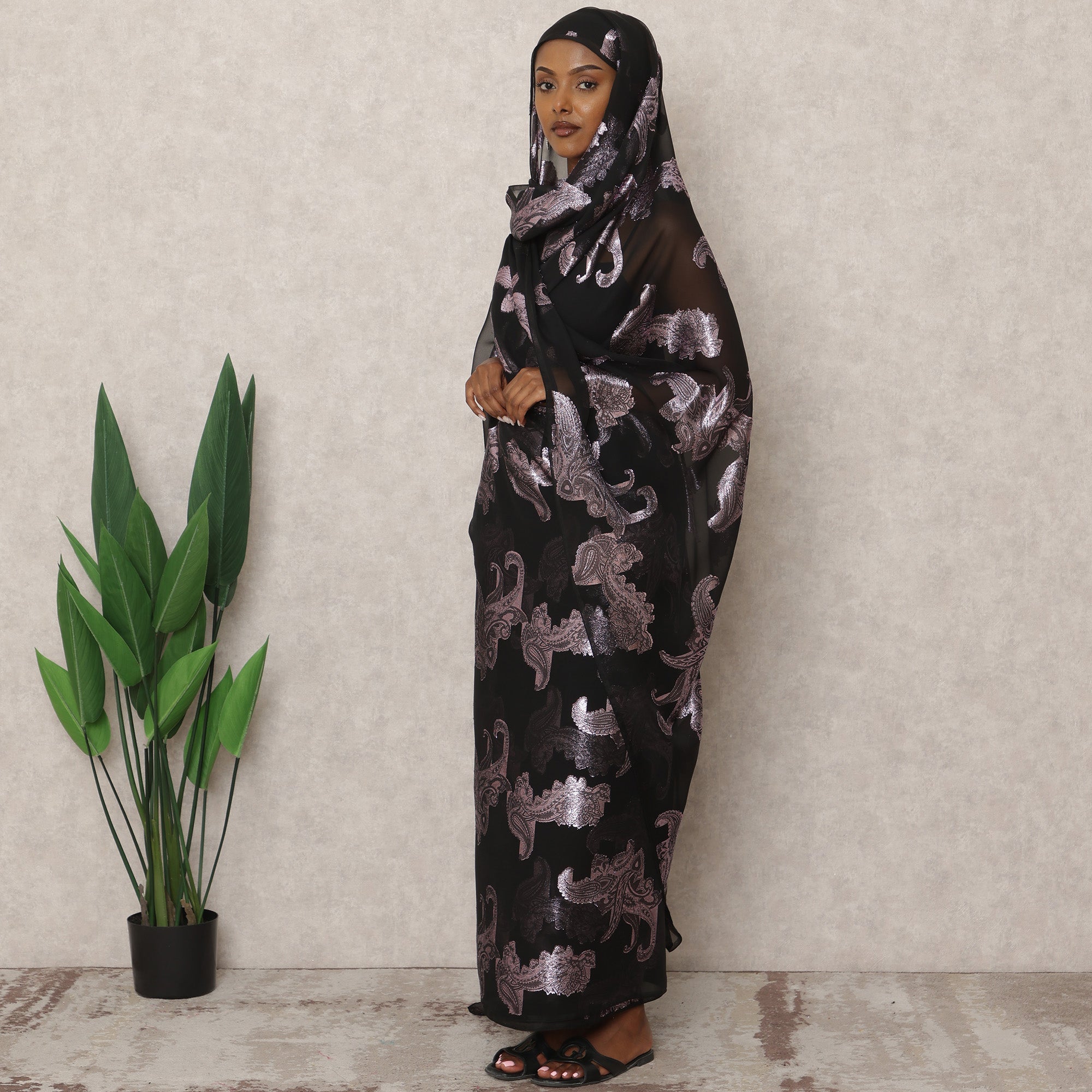 انطلقي نحو الأناقة المطلقة مع ثوب فرانساوي السوداني التقليدي الأسود، المصمم بإتقان من الشيفون الحريري الفرنسي الفاخر بطول 4.5 متر، والمزين بزخارف لوركس معدنية لامعة تُضفي عليه لمسةً من الرقي والفخامة. تتباين الخلفية السوداء الداكنة بشكل جميل مع نقوش الأزهار الفضية المعقدة، مما يخلق جاذبية بصرية آسرة، مثالية للمناسبات الخاصة والتجمعات الاحتفالية والفعاليات الاحتفالية. بعرض قماش يبلغ 140 سم، يضمن هذا الثوب انسيابية وانسيابية في التصميم. صُنع في فرنسا بحرفية عالية، حيث يوفر نسيج القماش الغني وخفة وزنه الراحة والرقي الملكي. سواء كنتِ تتسوقين عبر الإنترنت لشراء ملابس عرقية فاخرة أو تبحثين عن قطعة مميزة لا تُنسى، فإن ثوب فرانساوي هذا يمزج بسلاسة بين التراث وتألق الأزياء الراقية.
