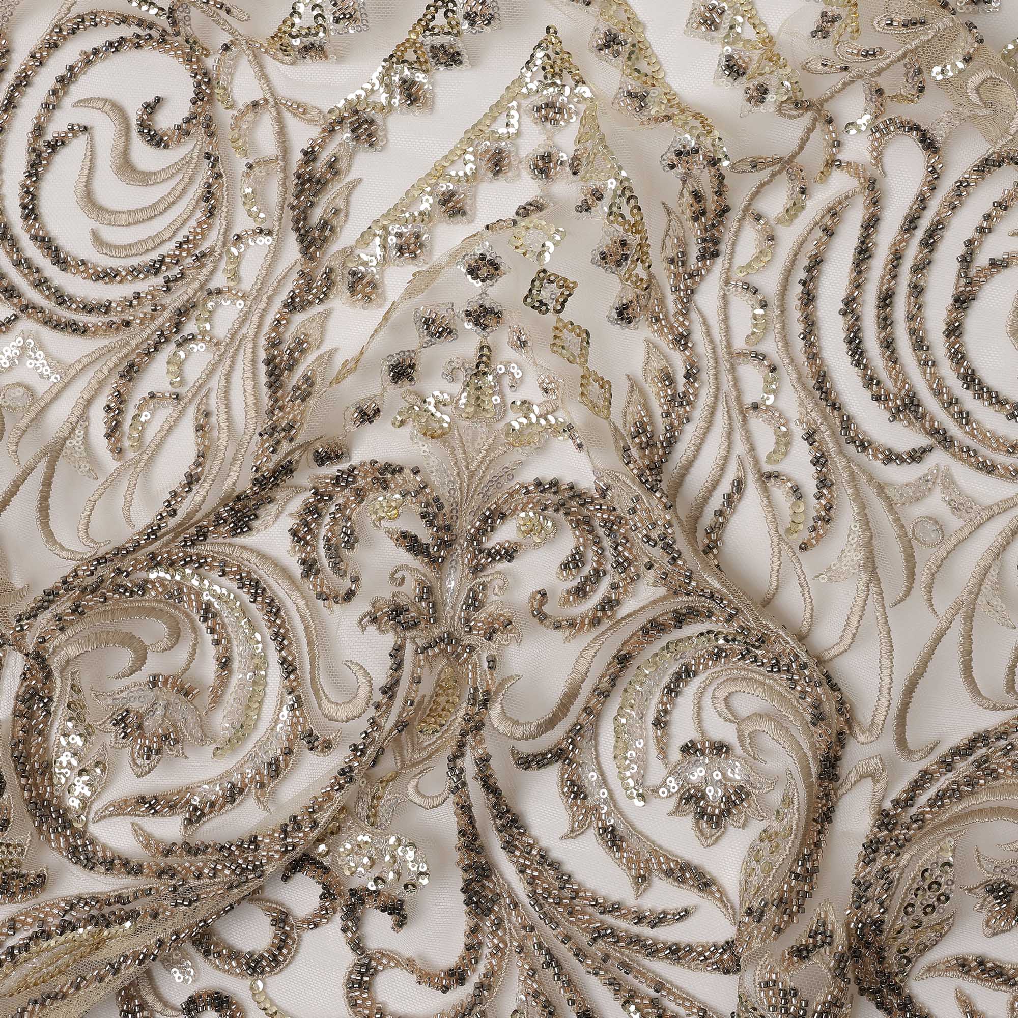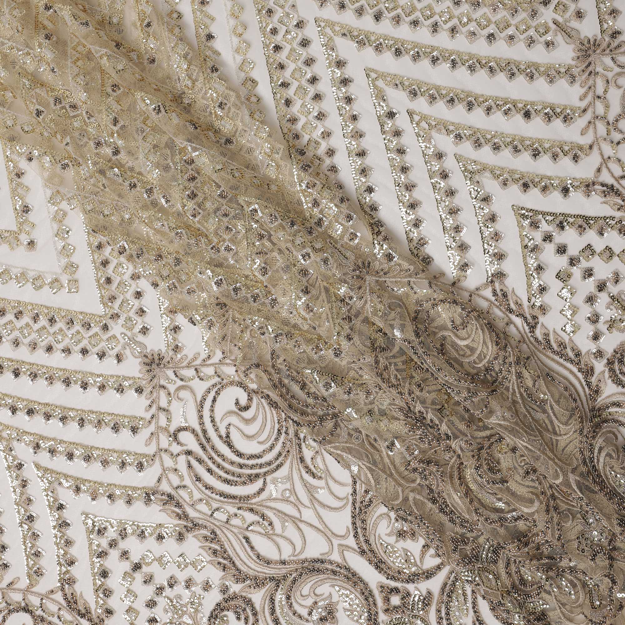 Gold nylon tulle with intricate geometric and paisley sequin embroidery