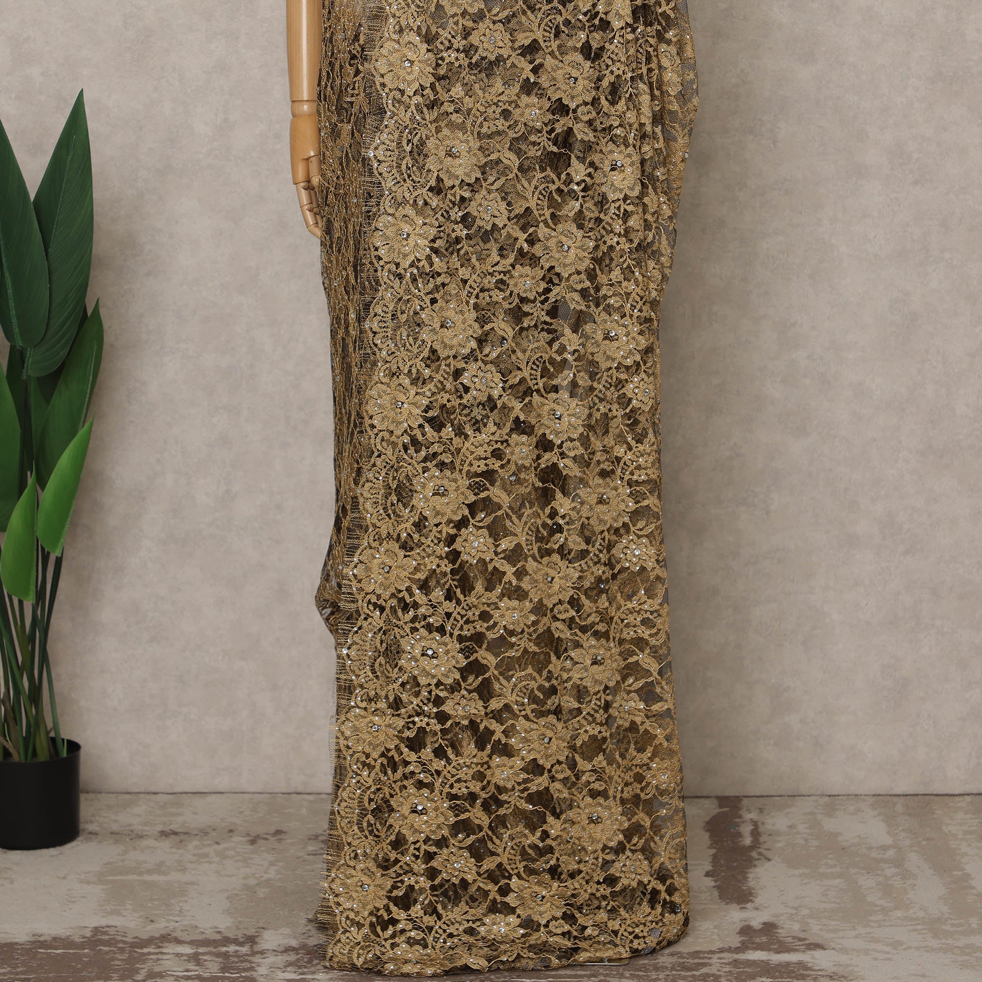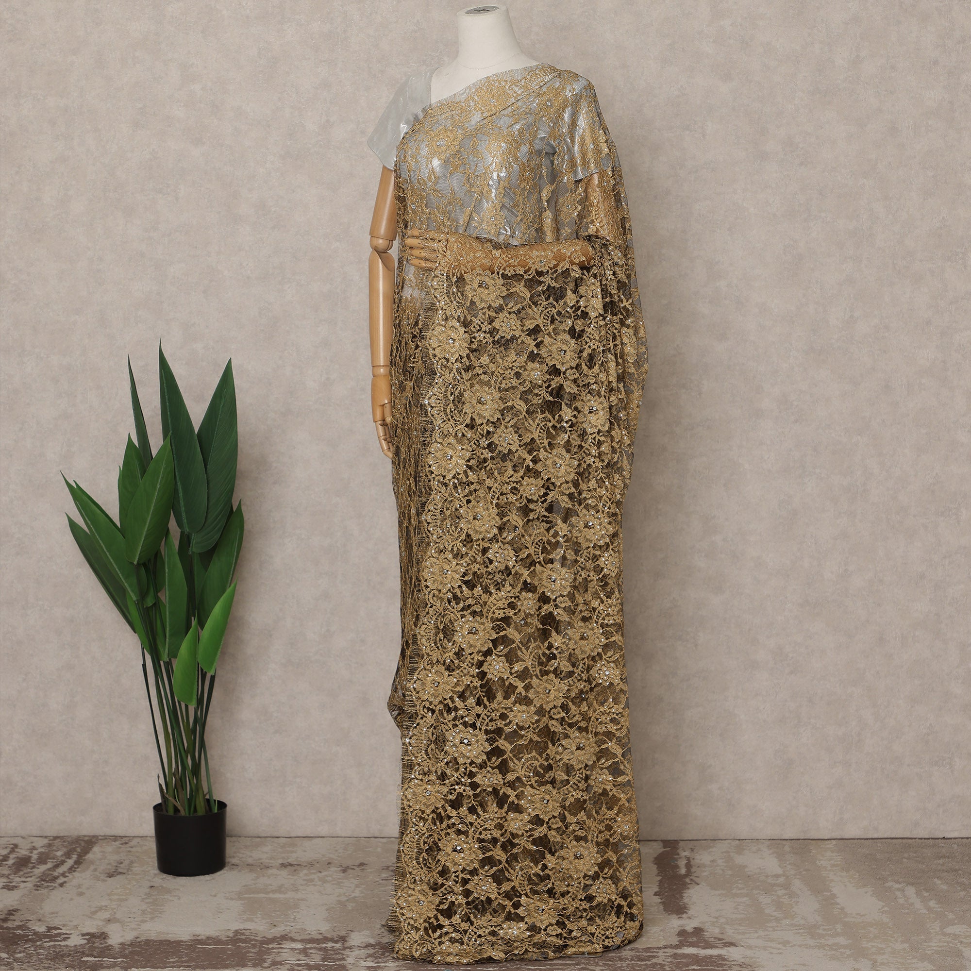 This gold Premium French Chantilly saree lace with stone work is crafted in France and features an intricate, shimmering lace pattern that drapes beautifully for an elegant, luxurious look. The fabric has a refined metallic sheen enriched with delicate stone embellishments that enhance its richness, making it perfect for special occasions and designer ensembles. This listing includes approximately 5.5 meters of lace fabric with a width of 110 cms, ideal for creating a full saree or using in couture projects. Blouse not included.