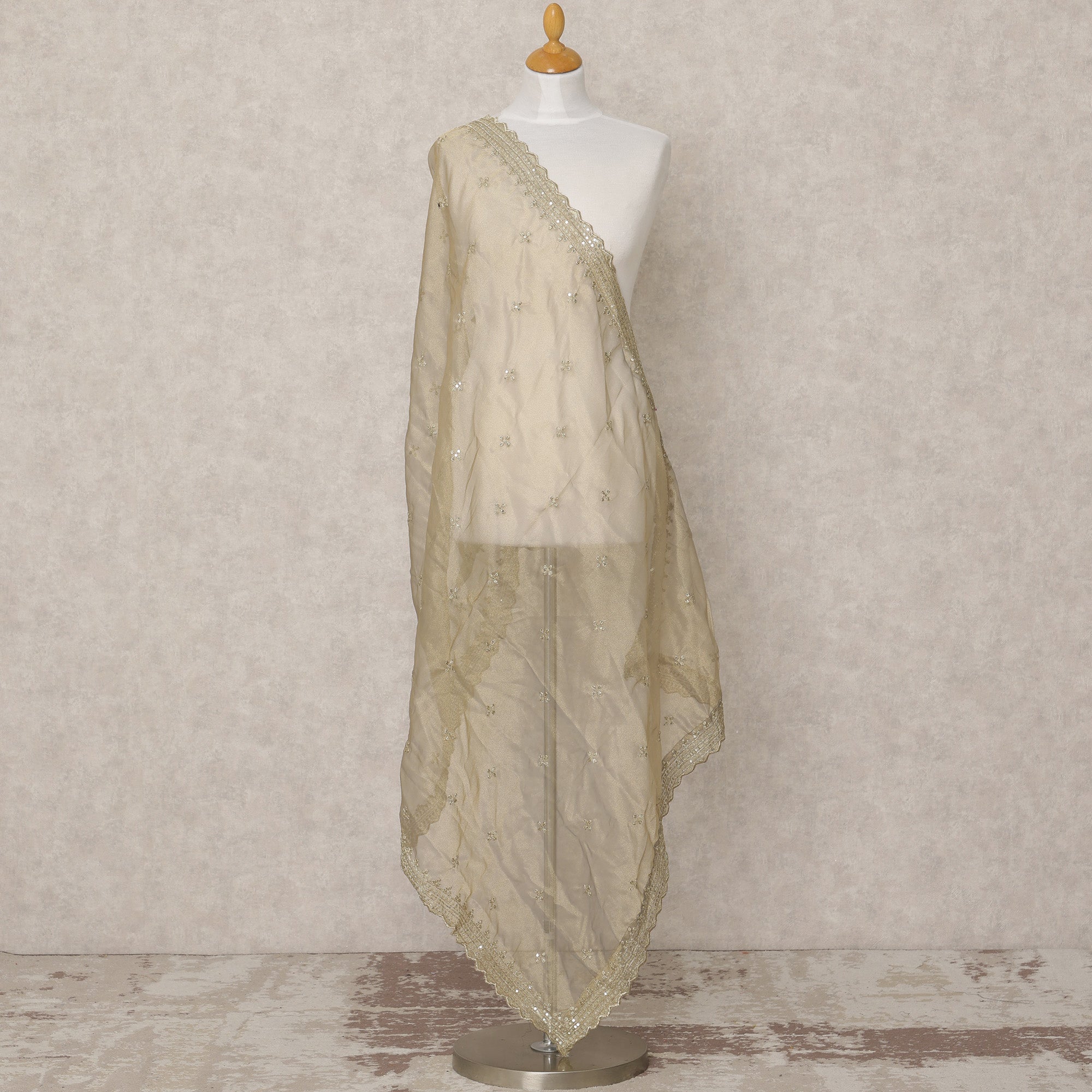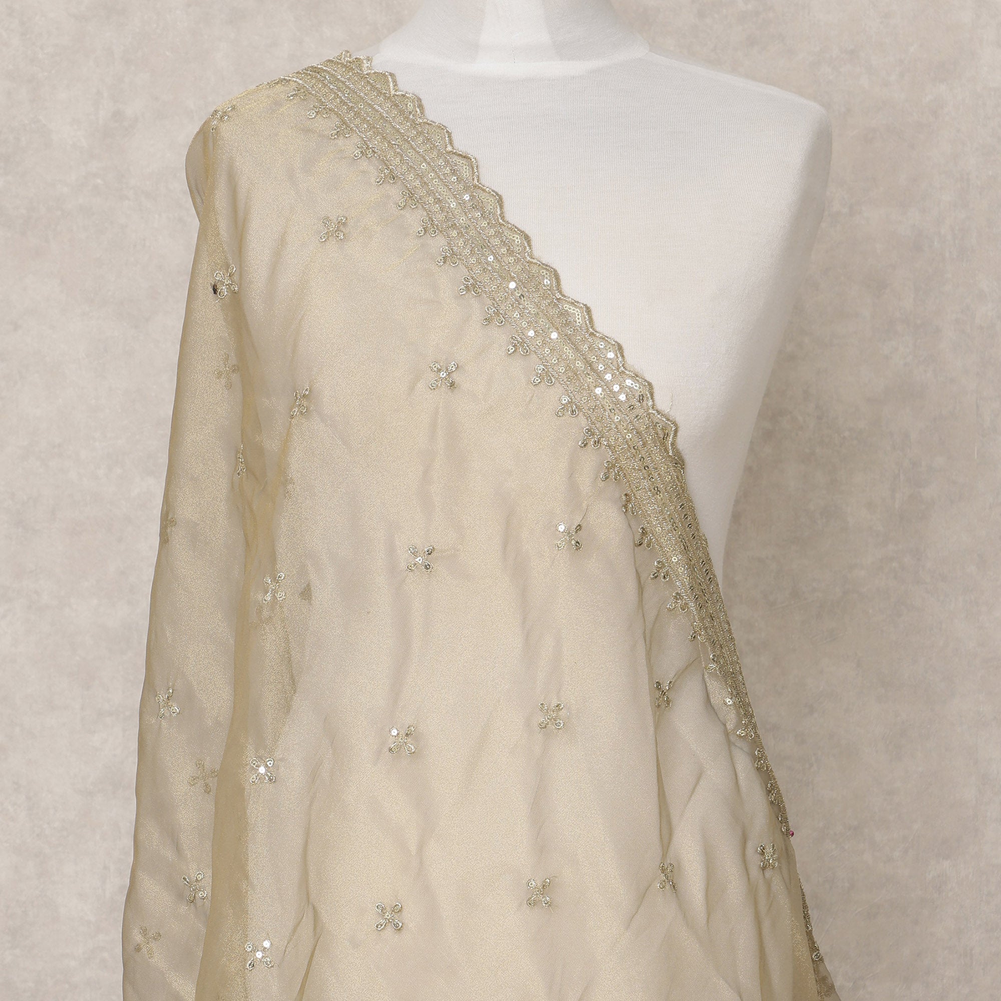 دوباتا من قماش بروكيد صناعي باللون البيج الذهبي مع تطريز زهور بالترتر وحواف من الدانتيل، 210 × 80 سم، صنع في الهند - D24123