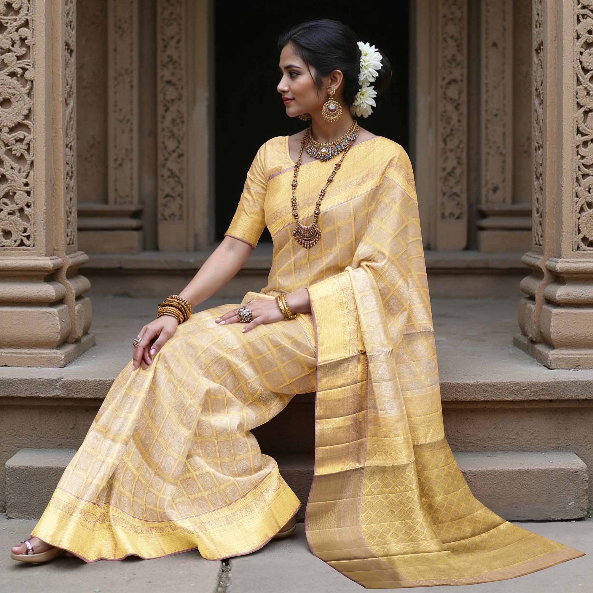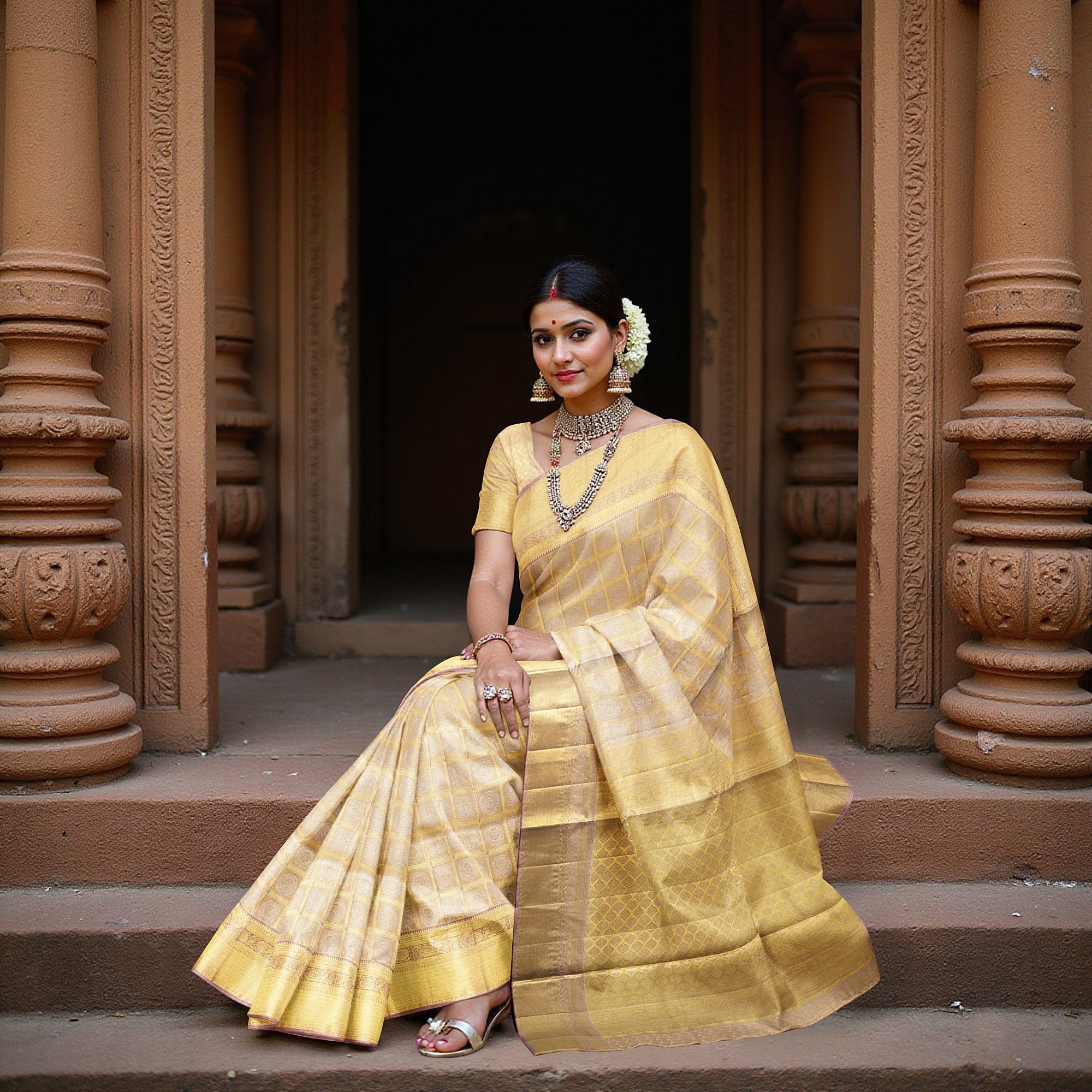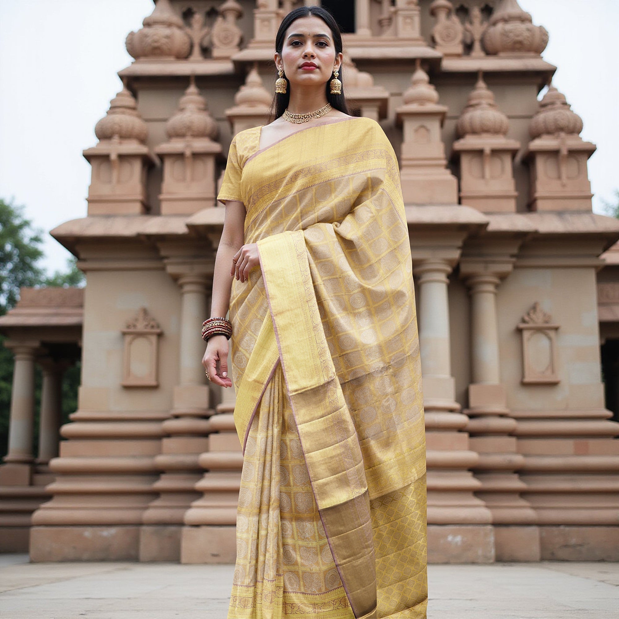 انغمسي في الأناقة الخالدة لهذا الساري الذهبي الحريري الخالص، حيث يتألق كل مربع من تصميم "بوتا" المربع كقطعة ذهبية من جدارية ملكية. يكتمل الجسم برشاقة بتطريز "زاري" متلألئ، منسوج يدويًا على يد حرفيين يكرسون 48 ساعة لإضفاء الحيوية على كل نقش. يتألق هذا الساري، رمزًا لتراث جنوب الهند، بلمعان ناعم، يجسد عظمة المعابد التقليدية ورقي المفروشات الملكية. مثالي لحفلات الزفاف والمناسبات الثقافية، ويضفي سحرًا لا يتلاشى. تسوقي عبر الإنترنت واحصلي على قطعة فنية أنيقة.