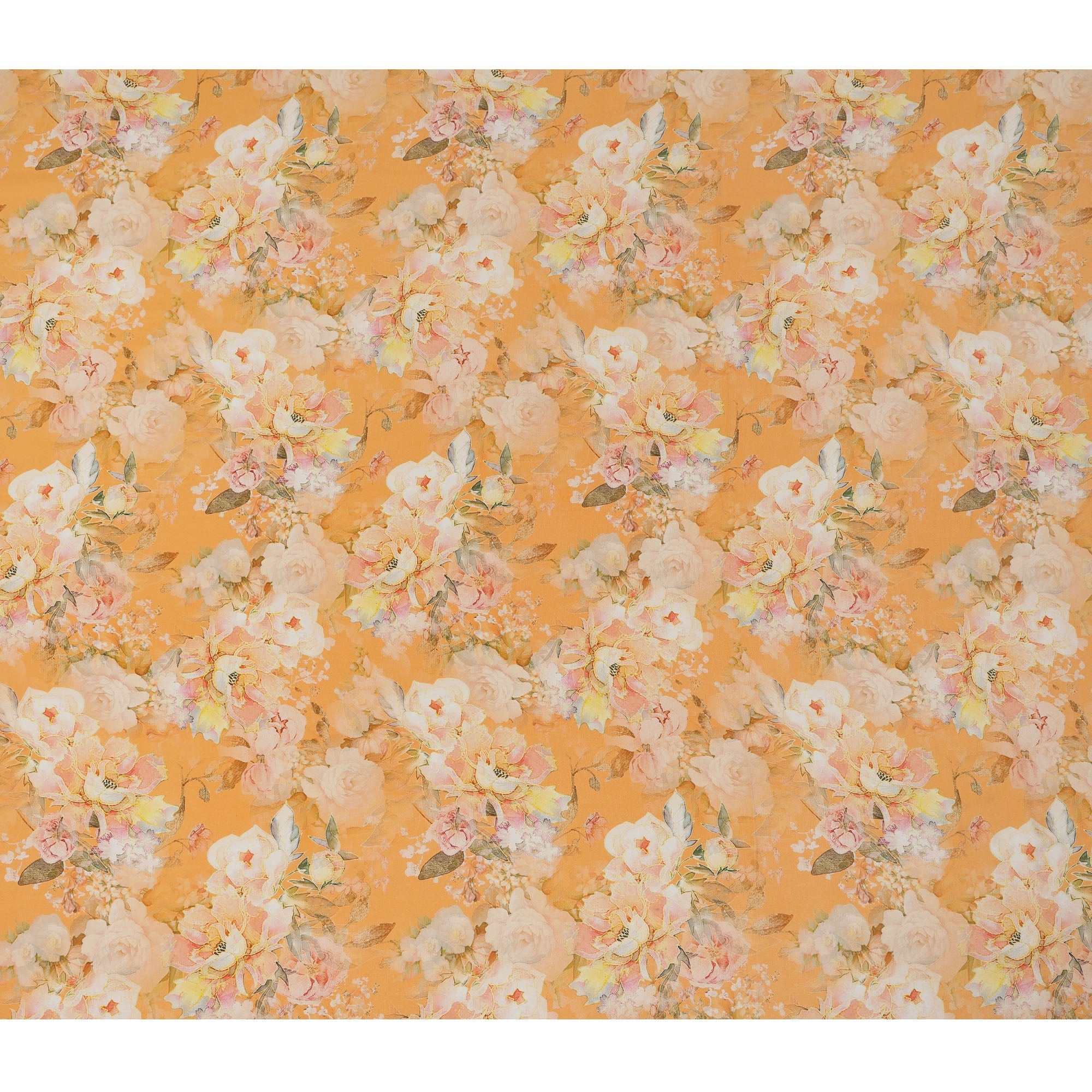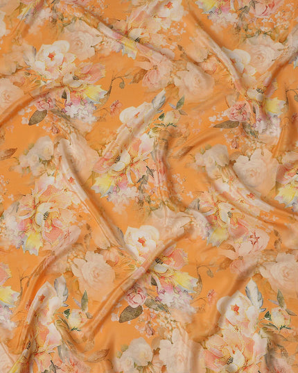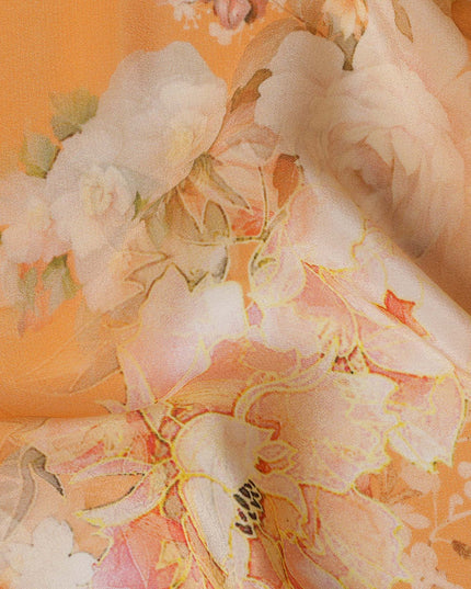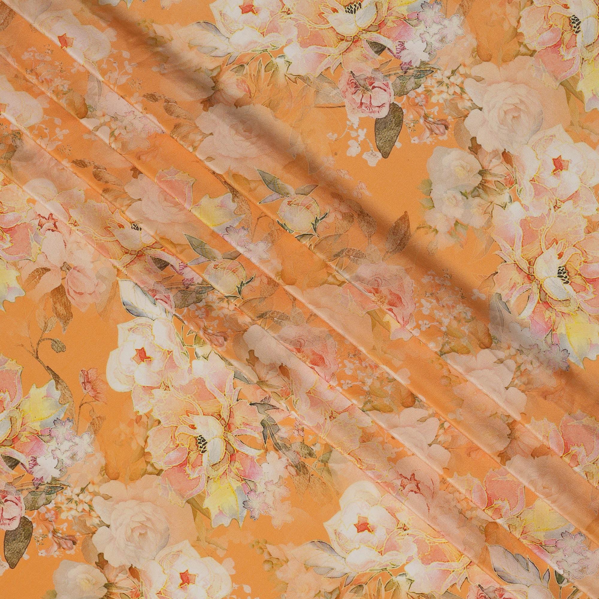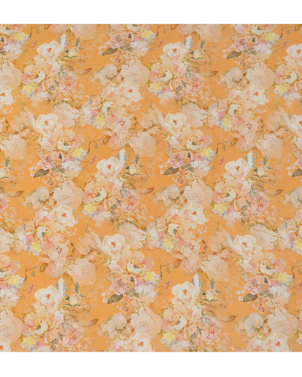 قماش كريب حريري ناعم بطبعة زهور بقاعدة بلون الخردل الذهبي مع لمسات من العاج والخوخ، ثنية ناعمة، عرض 110 سم، صنع في الهند - D23358