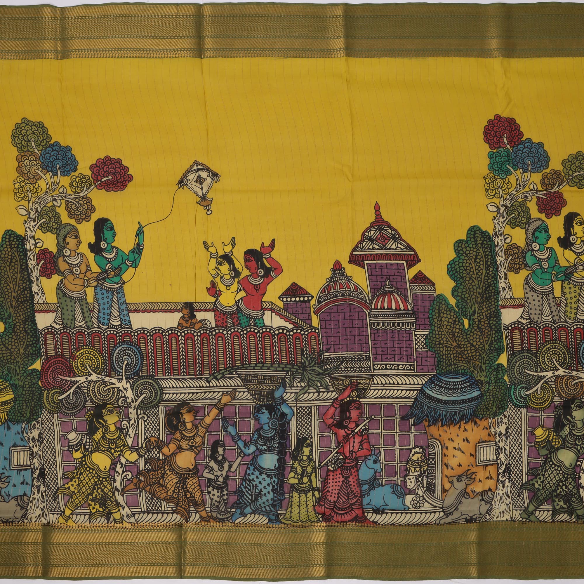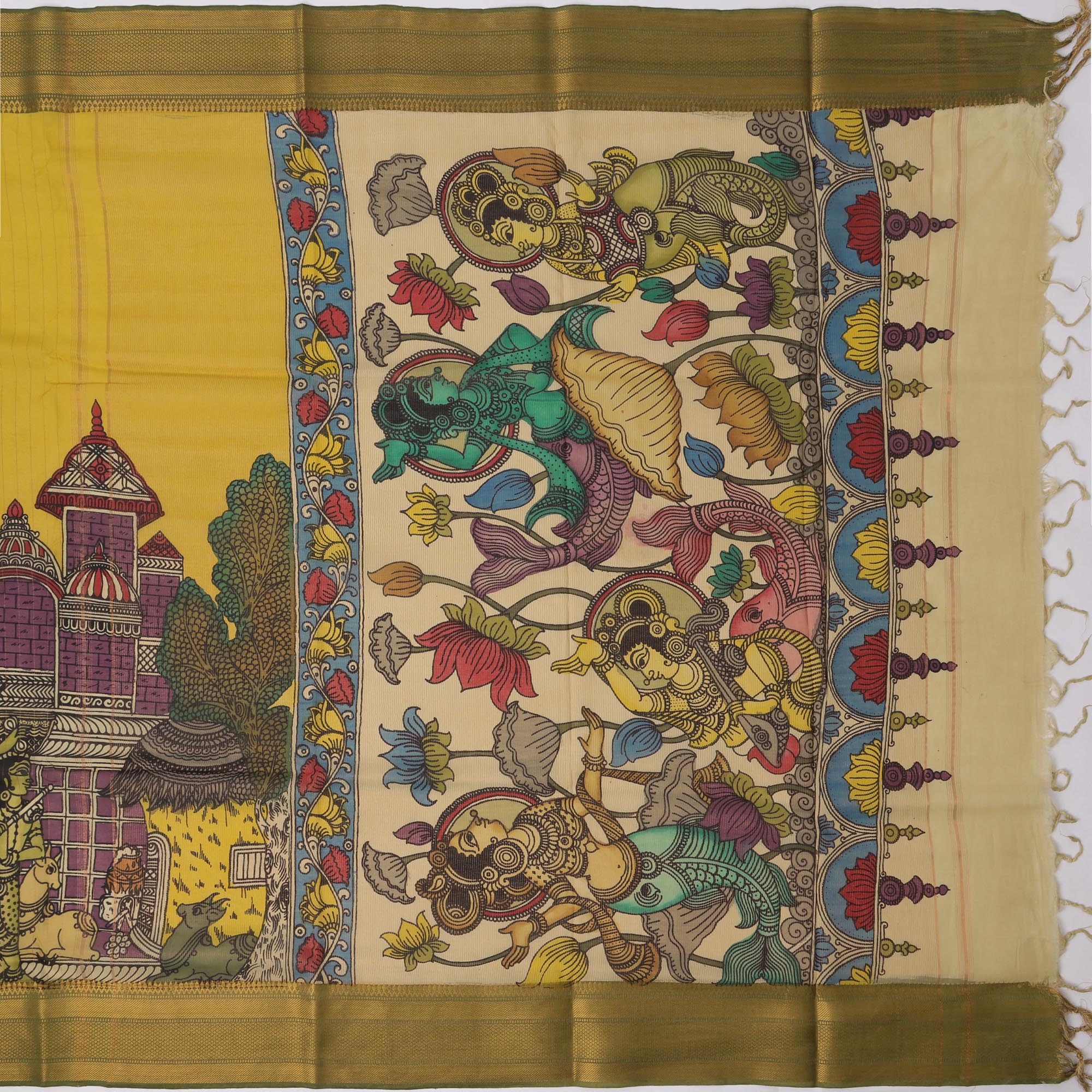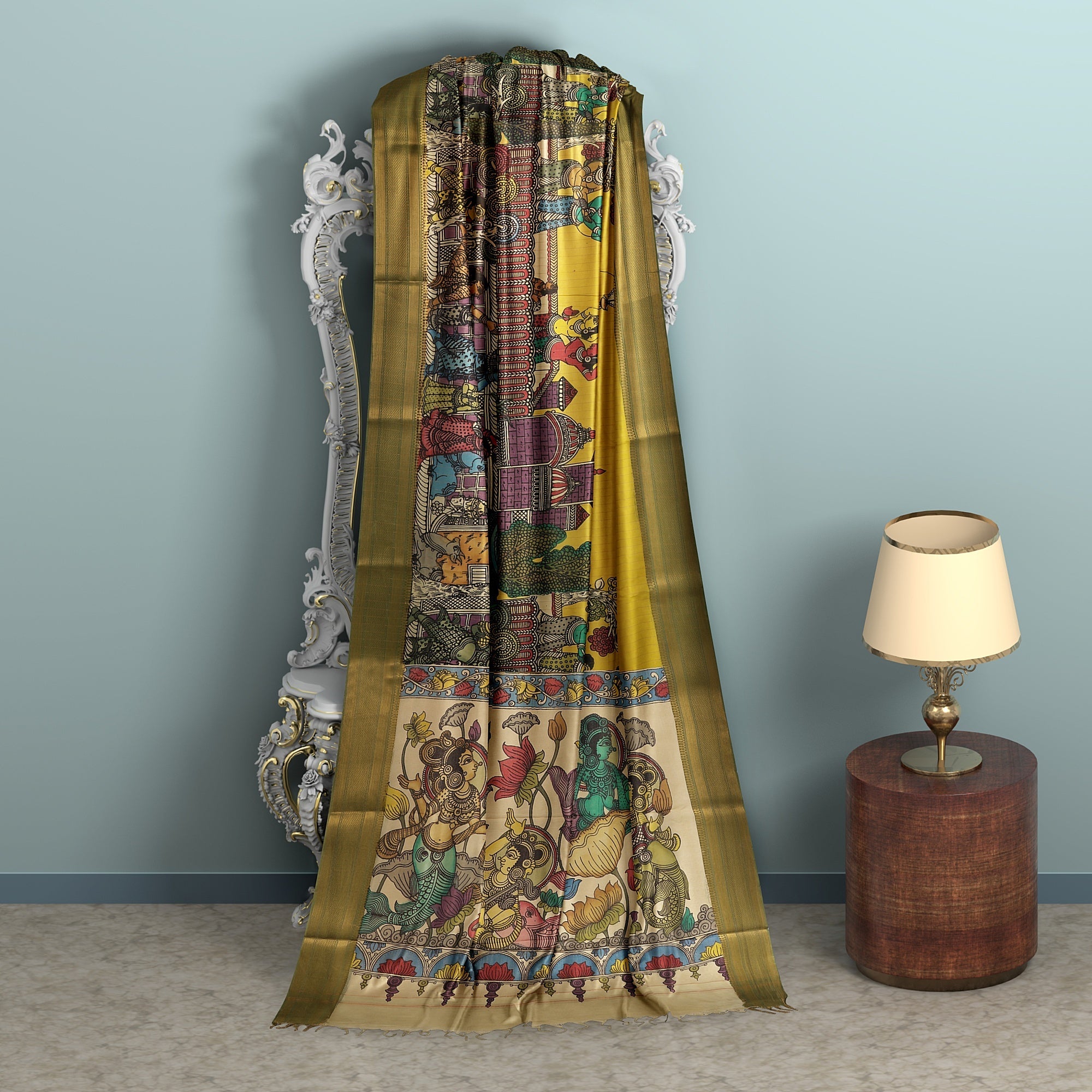ساري كالامكاري من حرير بنغالور الأصفر الذهبي مع رسومات أسطورية مرسومة يدويًا، عرض 110 سم، أصله: سري كالاهاستي، الهند، طوله 5.5 متر مع بلوزة - D22842