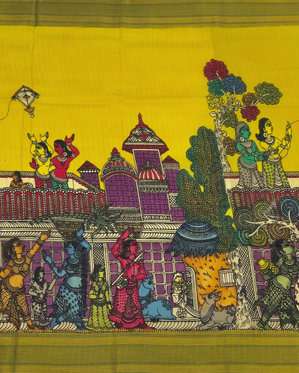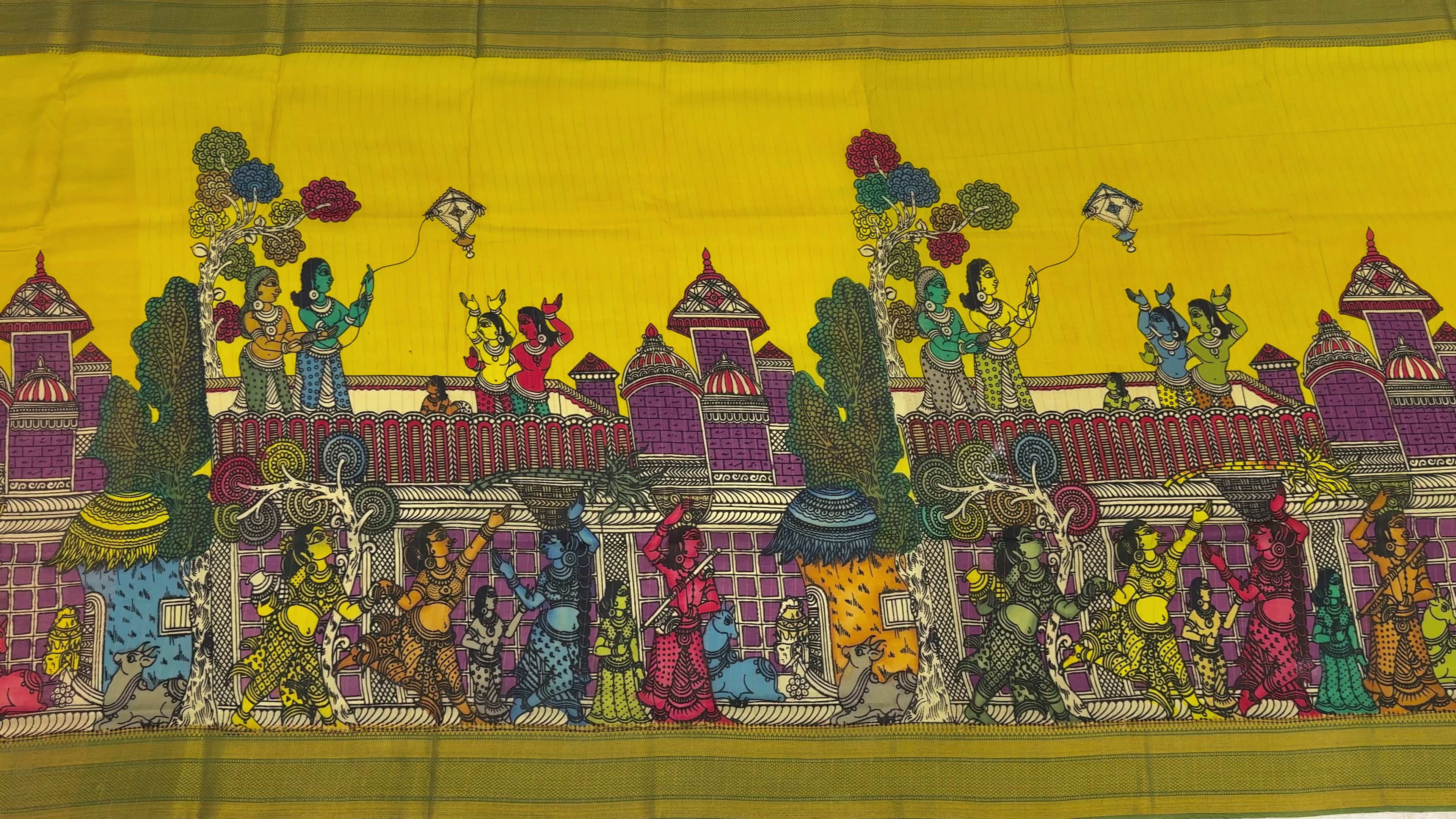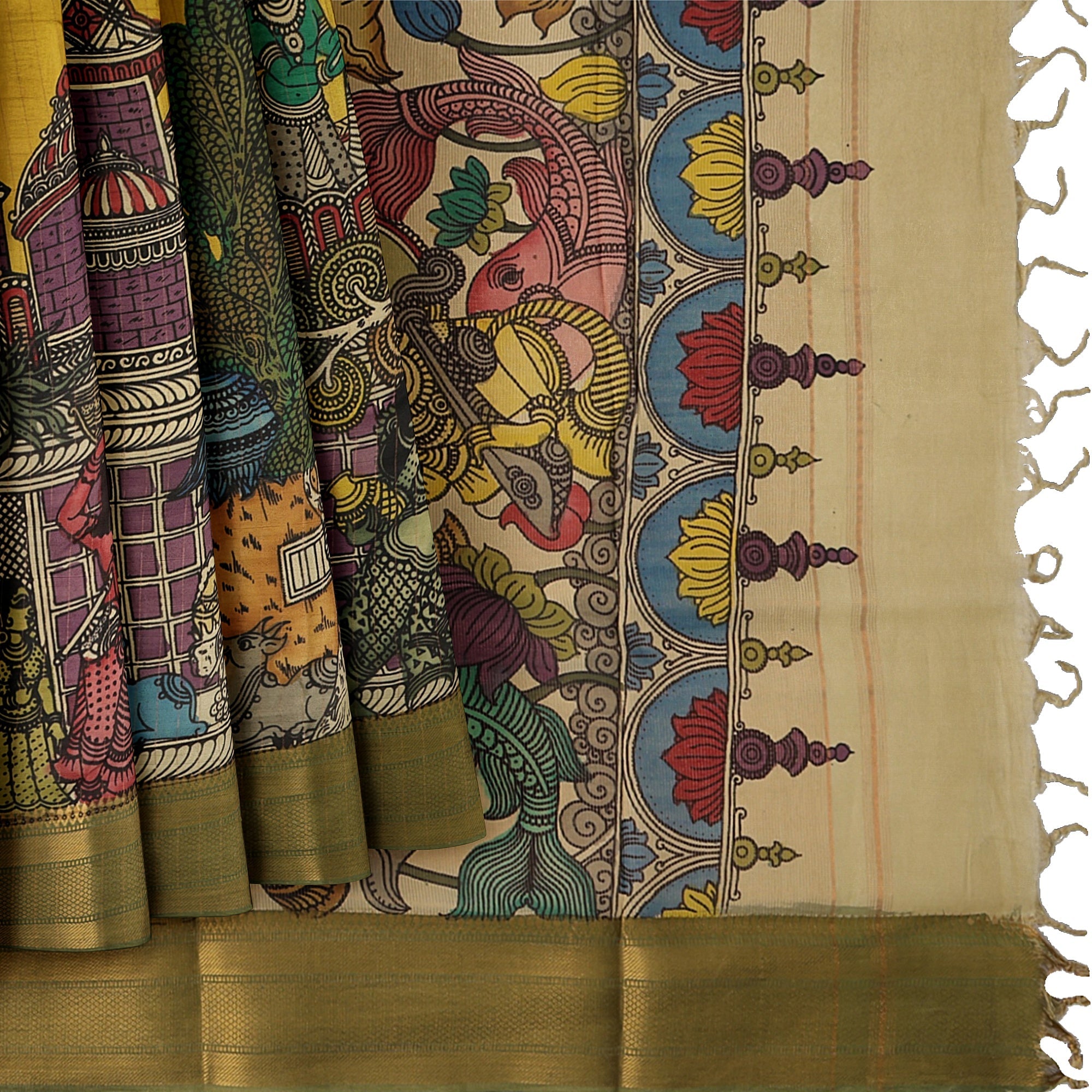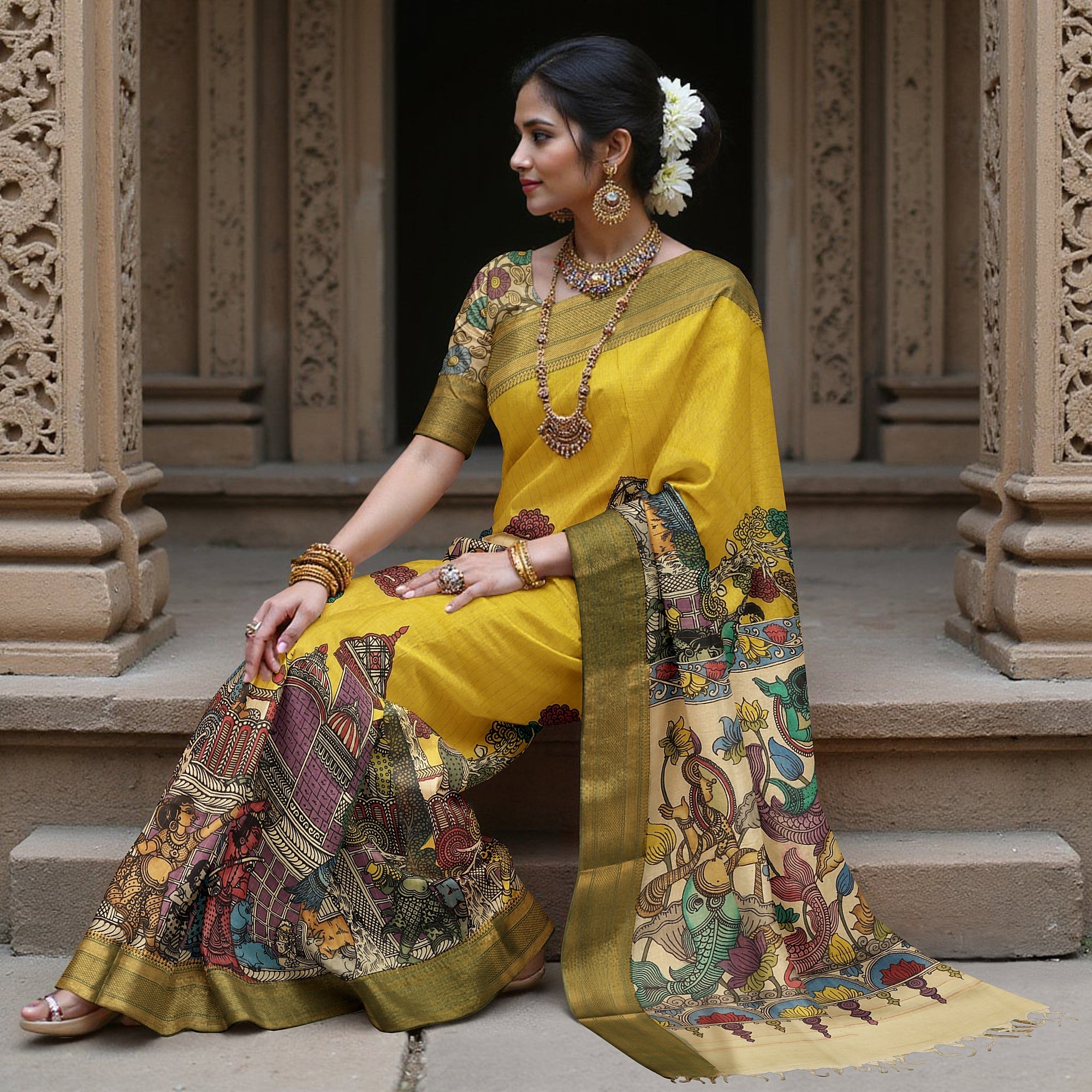 ساري كالامكاري من حرير بنغالور الأصفر الذهبي مع رسومات أسطورية مرسومة يدويًا، عرض 110 سم، أصله: سري كالاهاستي، الهند، طوله 5.5 متر مع بلوزة - D22842
