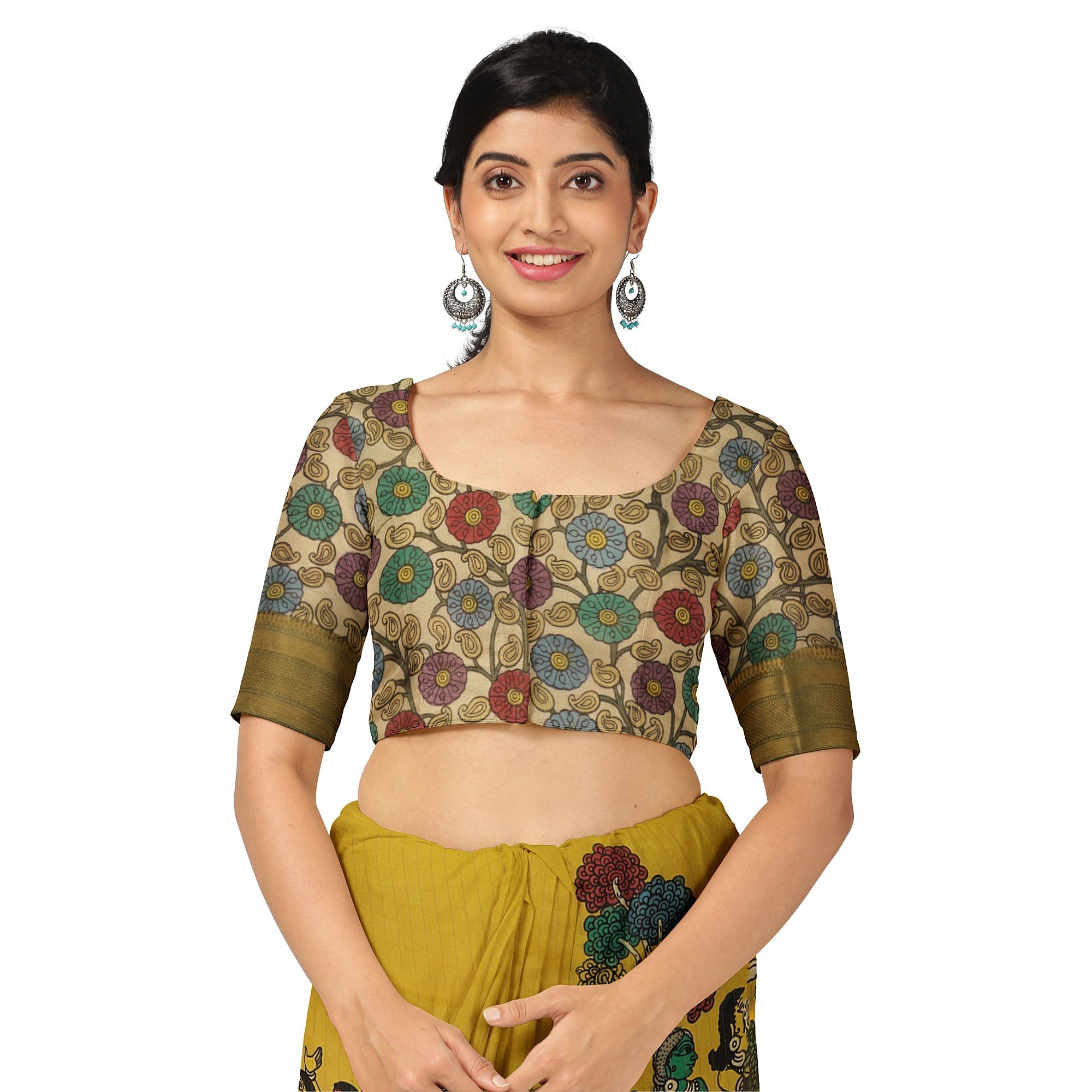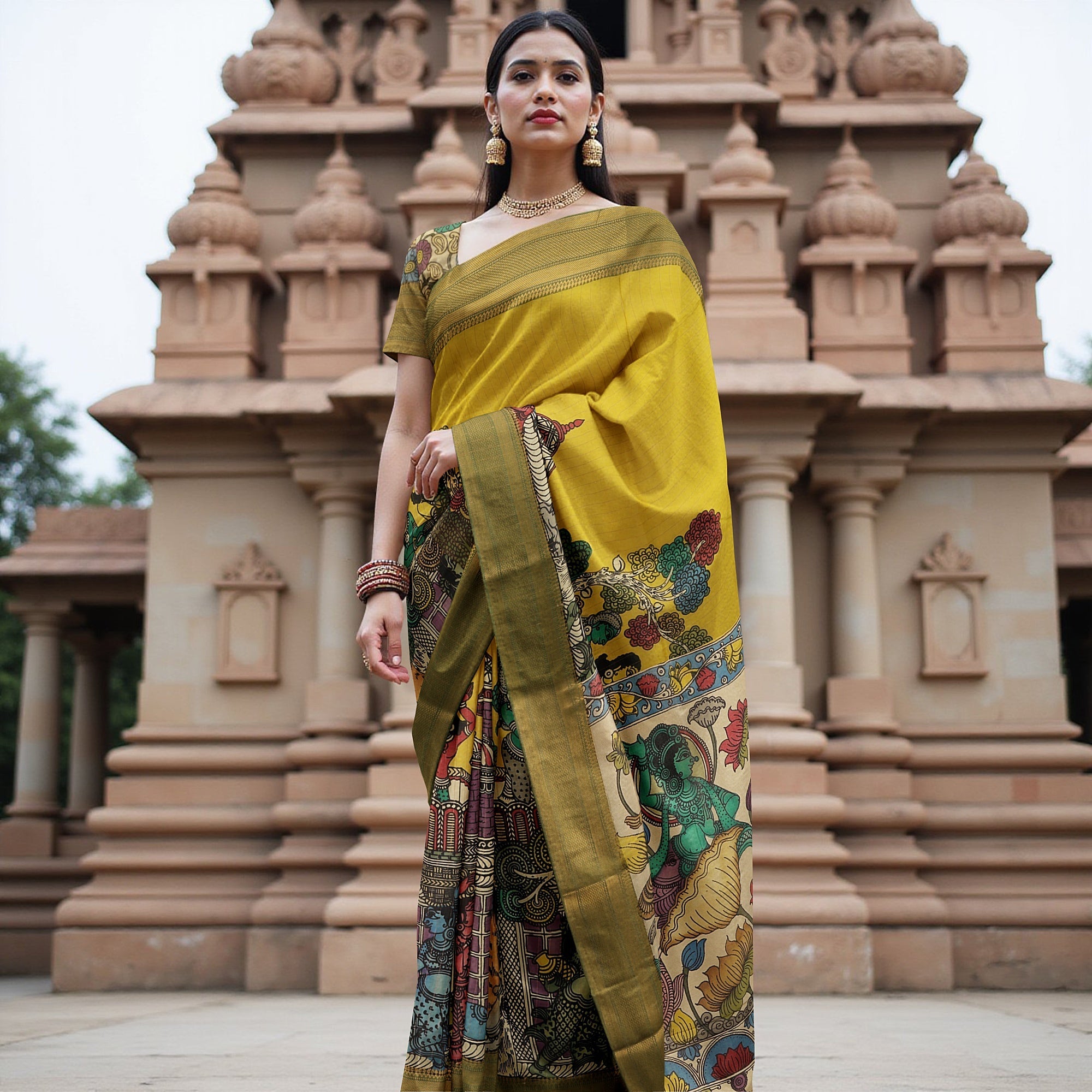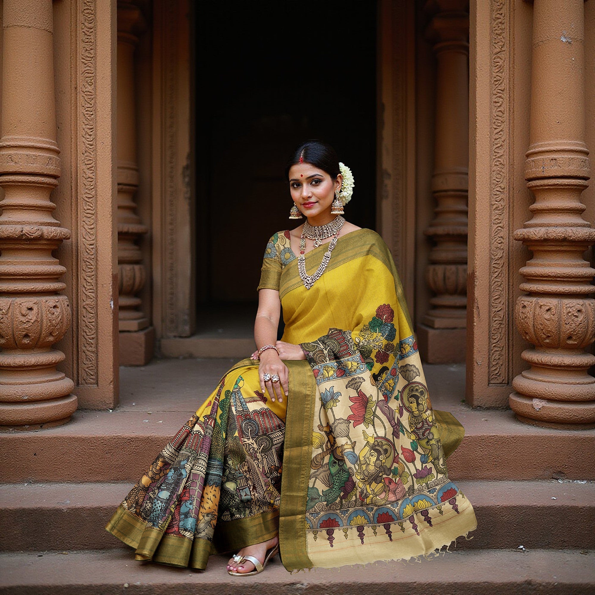 ساري كالامكاري الحريري الأصفر الذهبي من بنغالور، يُجسّد لوحةً فنيةً ساحرةً تلتقي فيها الأساطير بحرفيةٍ دقيقة. رُسم كل ساري يدويًا على يد حرفيين ماهرين من سري كالاهاستي، ويستغرق كل ساري 48 ساعةً من العمل الدؤوب، باستخدام أصباغ طبيعية وأقلام خيزران لإضفاء الحيوية على الآلهة والآلهة والرموز الإلهية. تُضفي القاعدة الخضراء الزاهية لمسةً من الفخامة على الأجواء الطبيعية، بينما تُضفي لمساتٌ غنية من الصدأ والأسود والأصفر بُعدًا مميزًا على كل شكل وإطار. يُكمل ملمس الحرير الناعم الرسومات الدقيقة، مما يجعل الساري ساحرًا بصريًا ومريحًا في الارتداء. يبلغ طول الساري 5.5 أمتار، ويتضمن بلوزةً مطابقة، وهو مثاليٌّ لمن يُقدّرون التقاليد في كل خيط. تسوّق عبر الإنترنت لتعيش هذه القصة الخالدة مع الحرير.