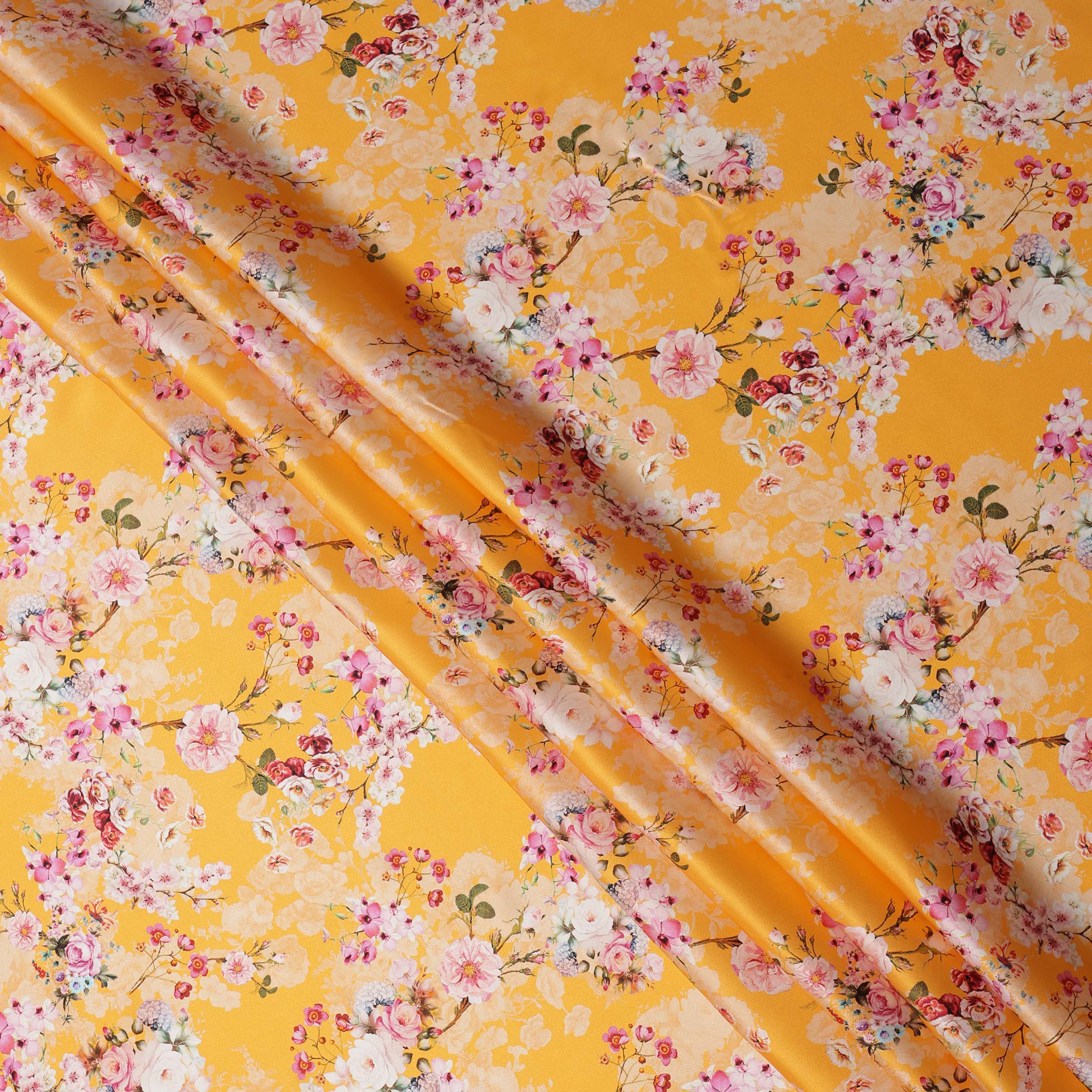 Premium Golden Yellow pure silk satin fabric with floral blossom print.