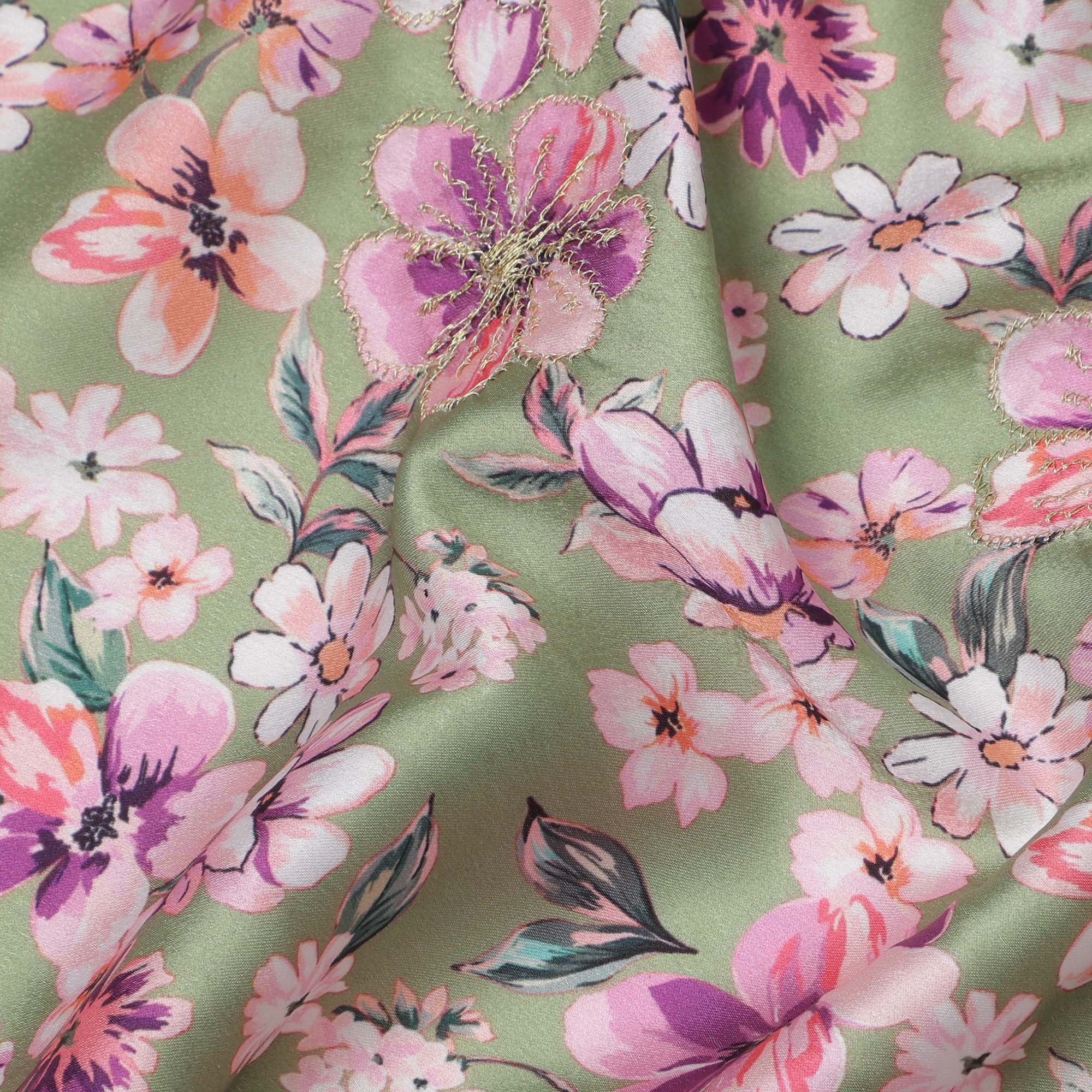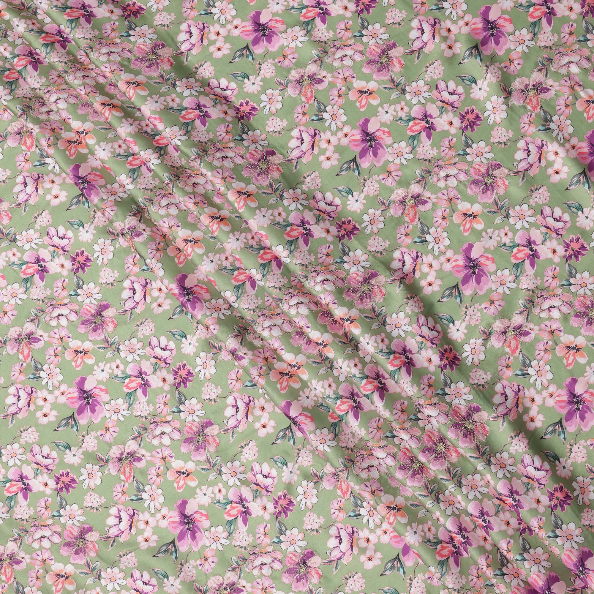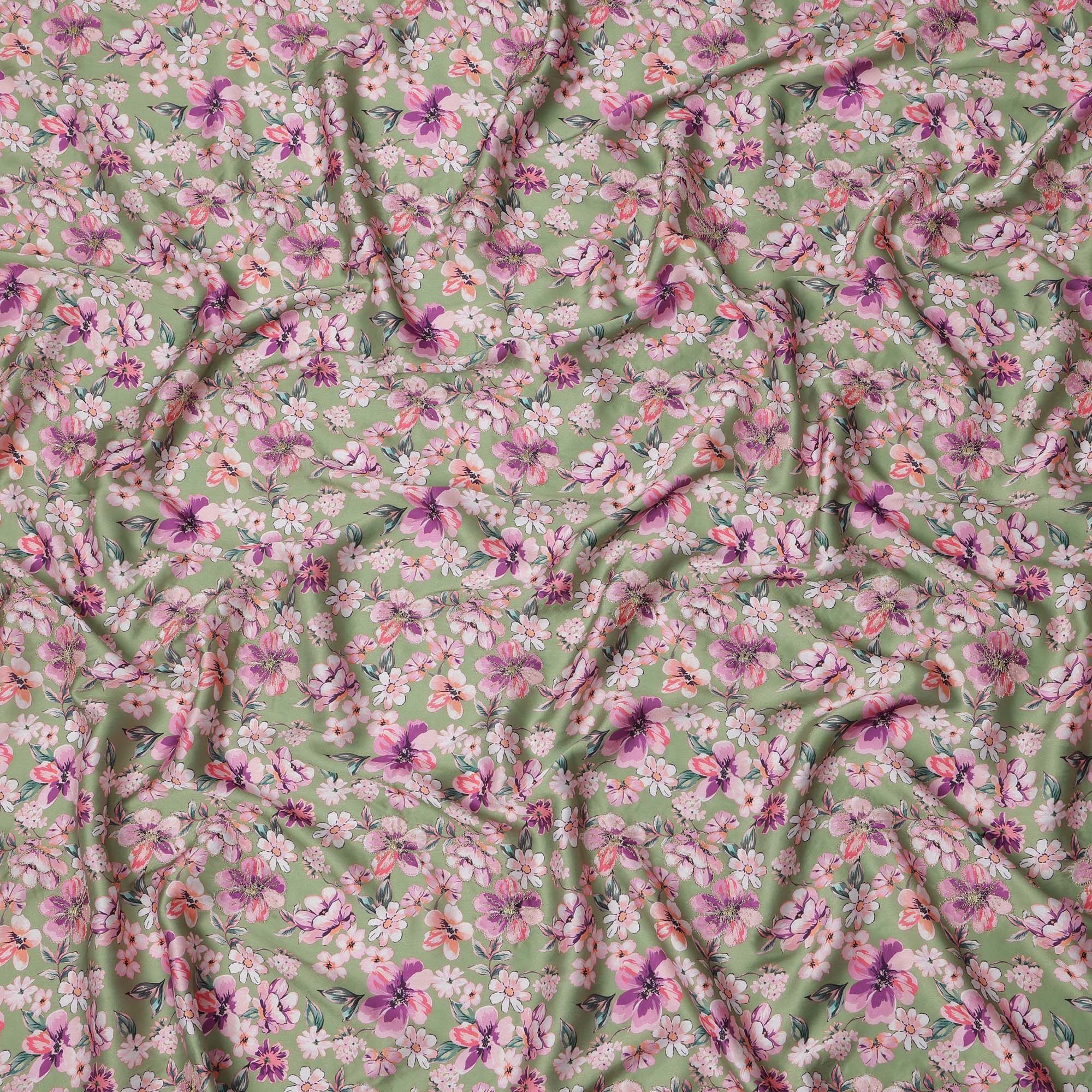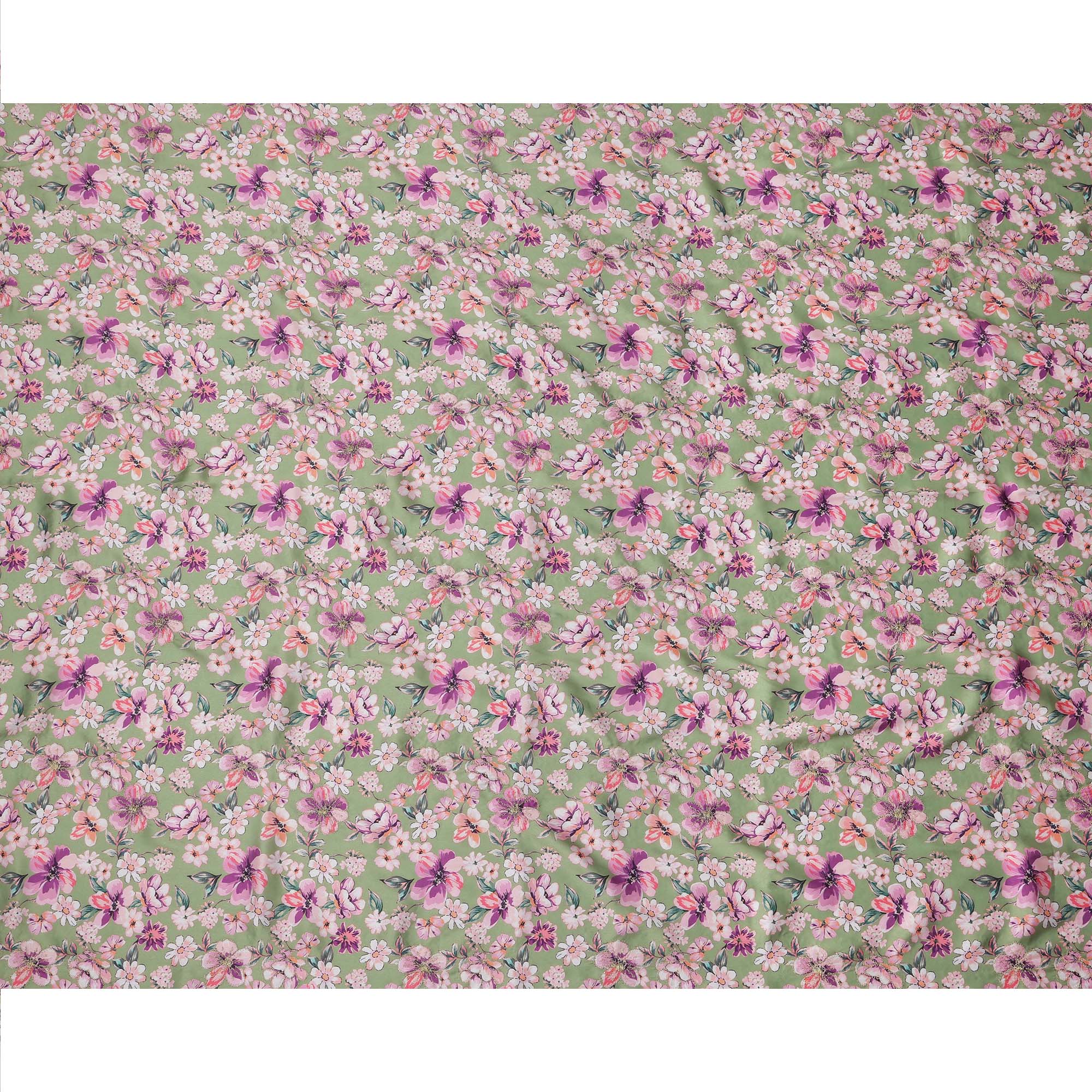 قماش فيسكوز مطبوع عليه زهور باللون الأخضر مع أزهار وردية وأرجوانية، 110 سم، الهند - D23847