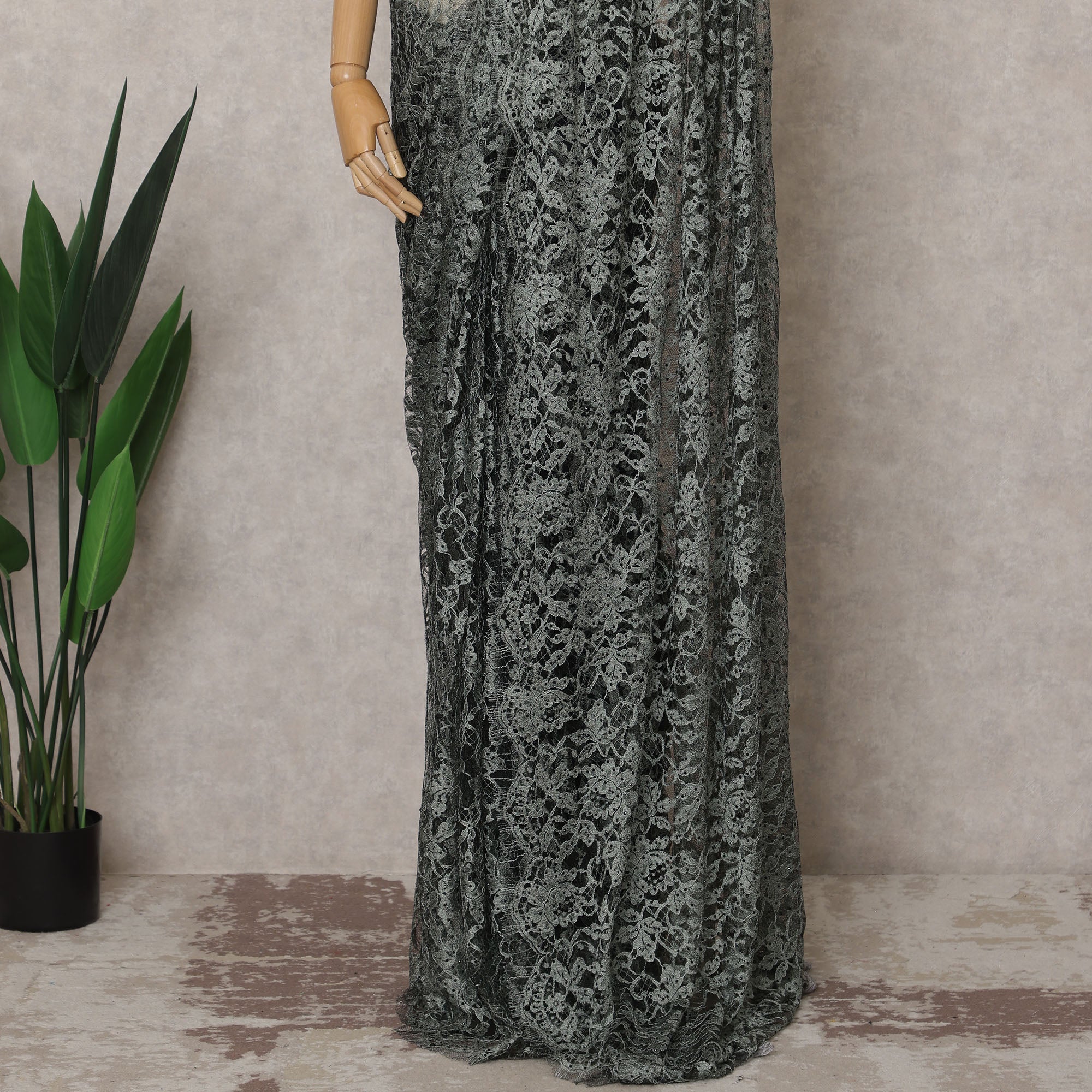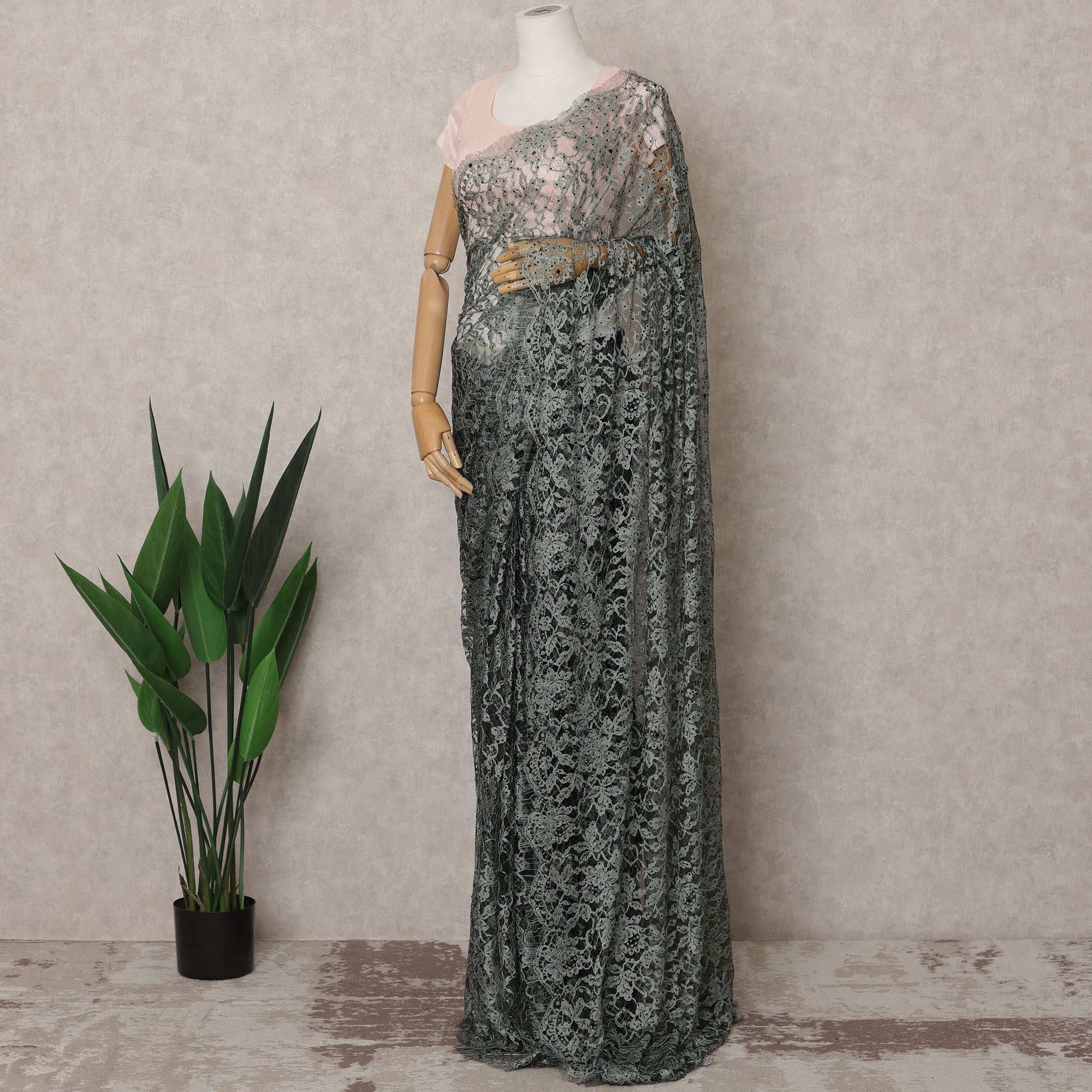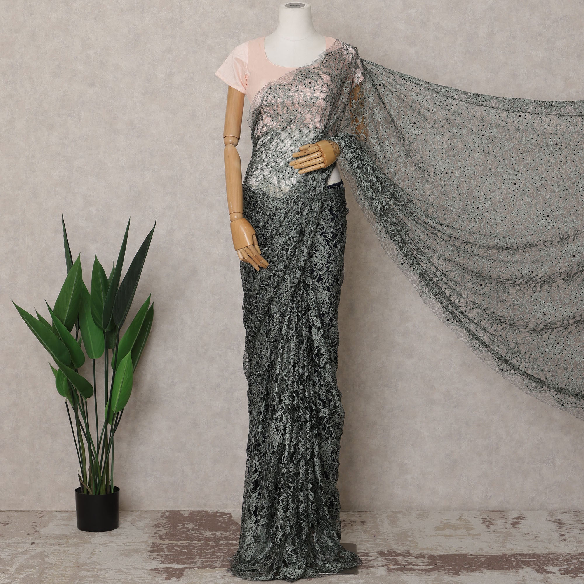 ساري فرنسي فاخر من قماش شانتيلي ثنائي اللون باللونين الأخضر والأسود مع تطريز حجري - طول 5.5 متر وعرض 110 سم - مستورد من فرنسا - D22949