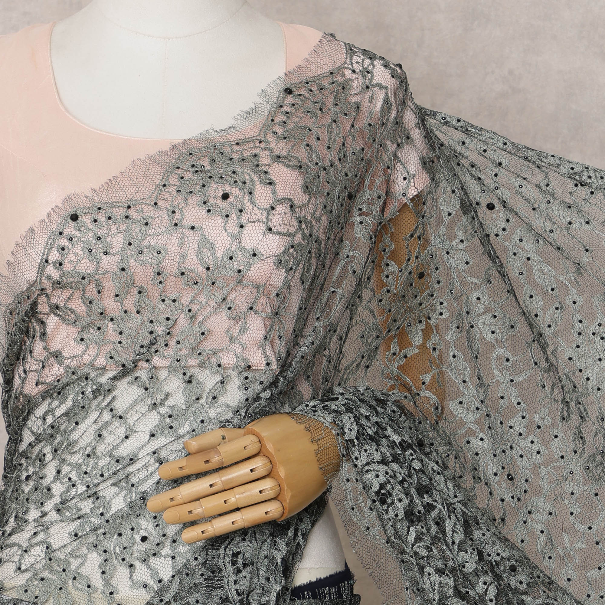 دانتيل شانتيلي أصلي ثنائي اللون مستورد من فرنسا مع عمل حجري أسود جريء