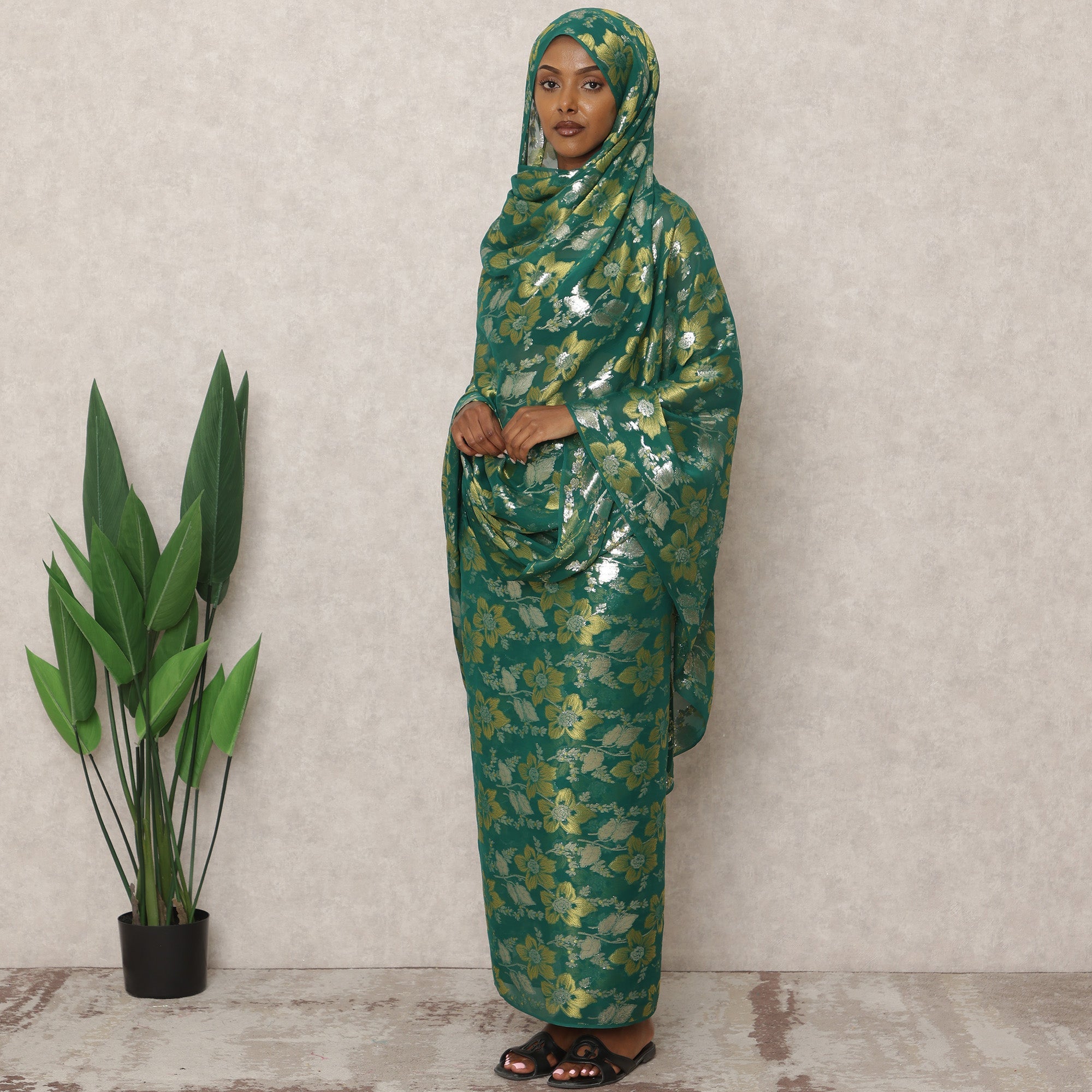 ثوب سوداني تقليدي أخضر، مصنوع من قماش شيفون حرير نقي بطول 4.5 متر وقماش لوركس معدني مزهر، عرض 140 سم، صنع في كوريا الجنوبية - D24497