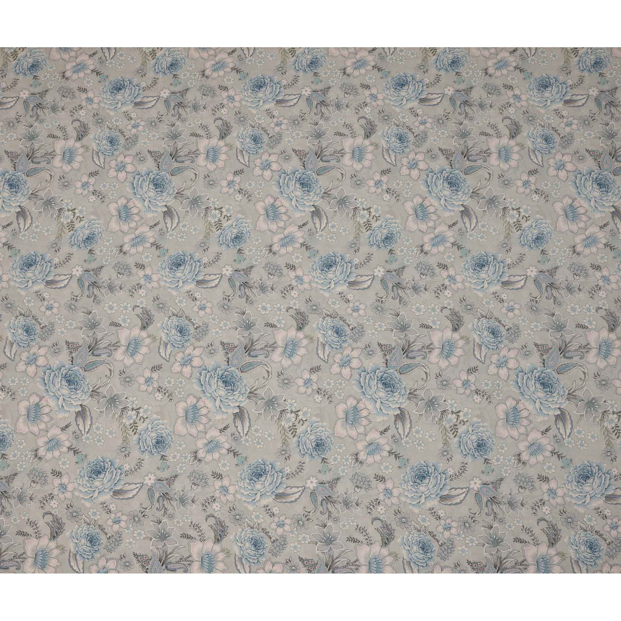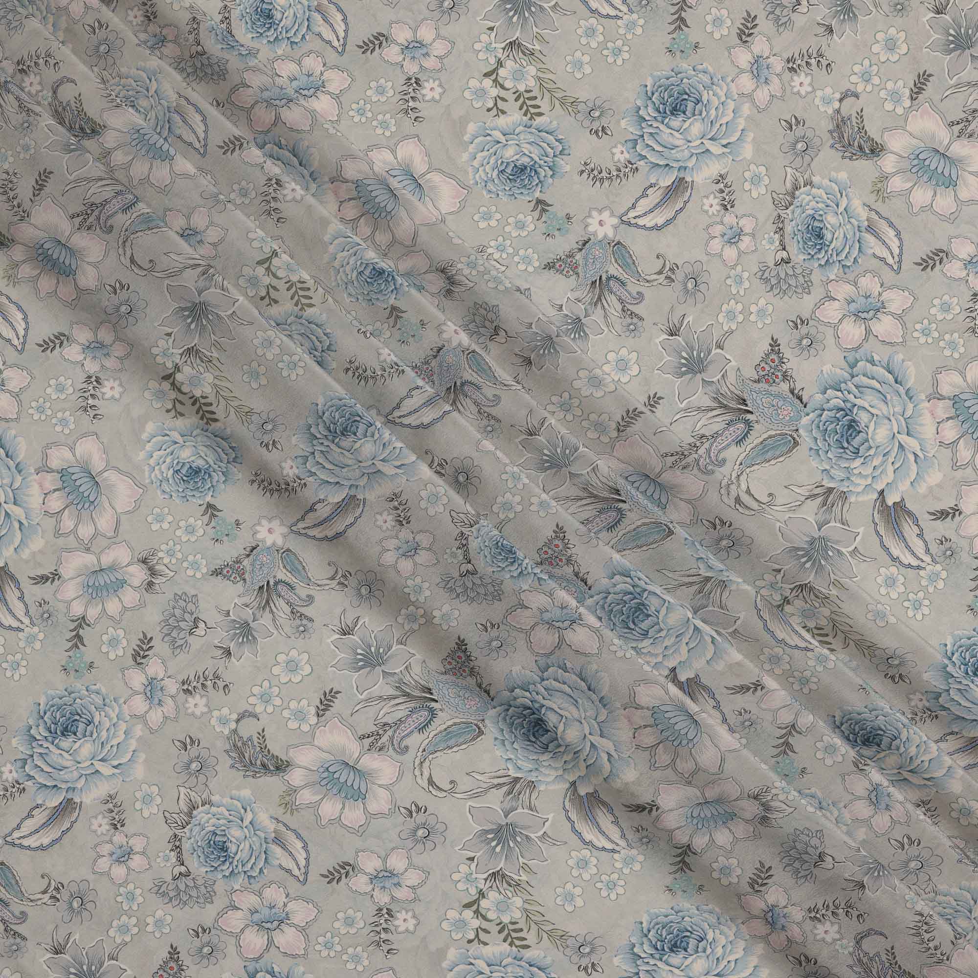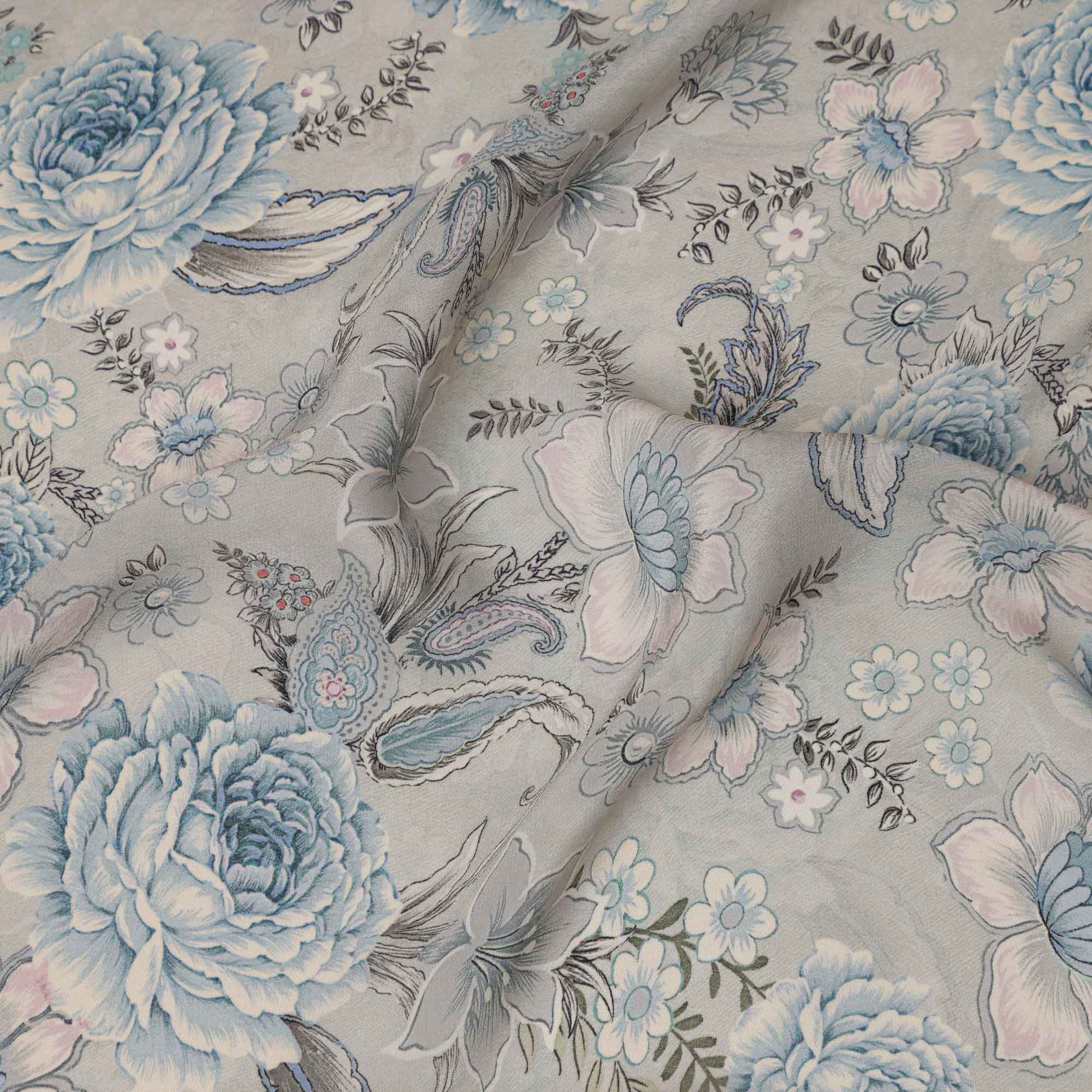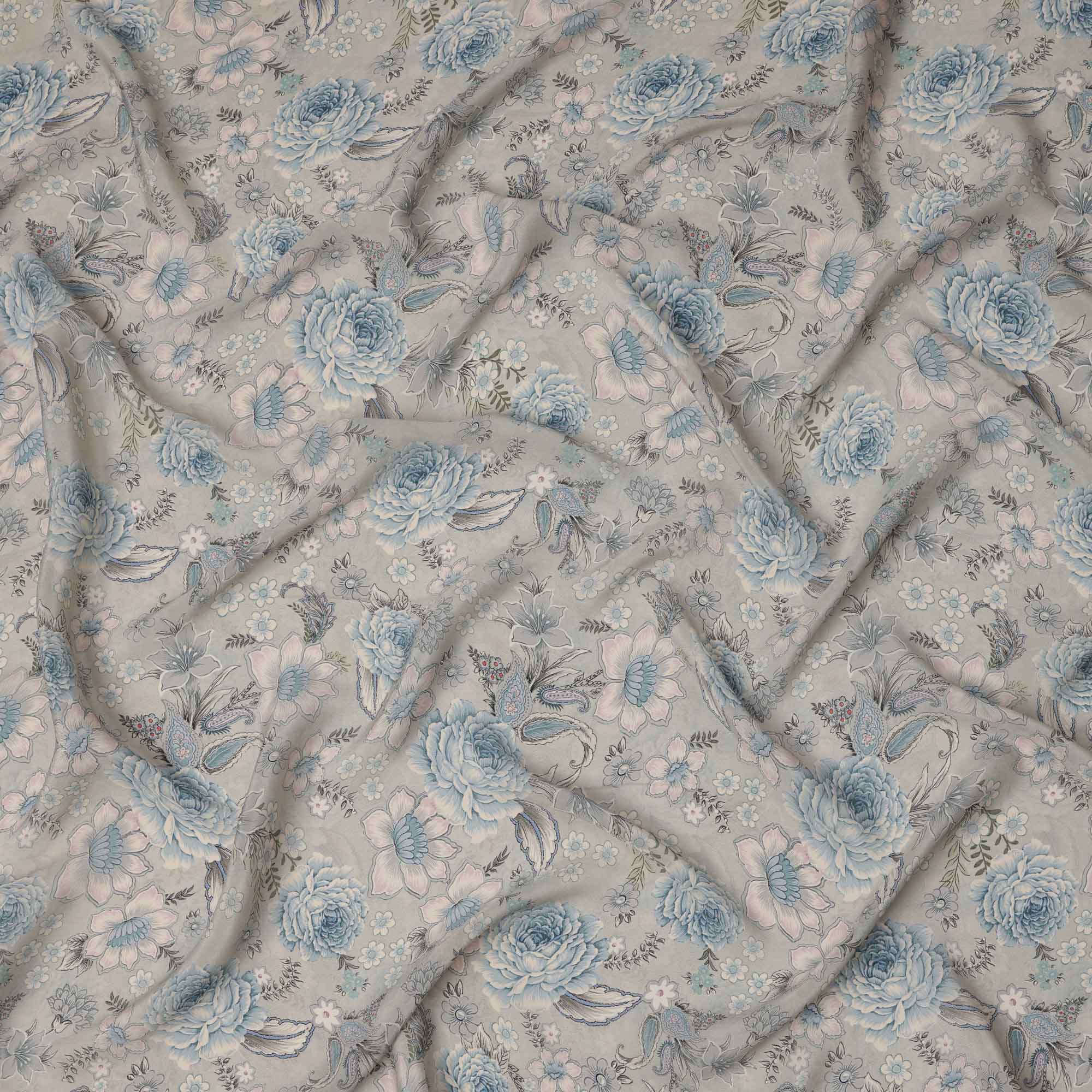 قماش كريب فيسكوز رمادي أزرق مطبوع عليه زهور الحديقة، بنقشات ورود وزنبق رقيقة بألوان باستيل ناعمة، عرض 110 سم، صنع في الهند - D23458