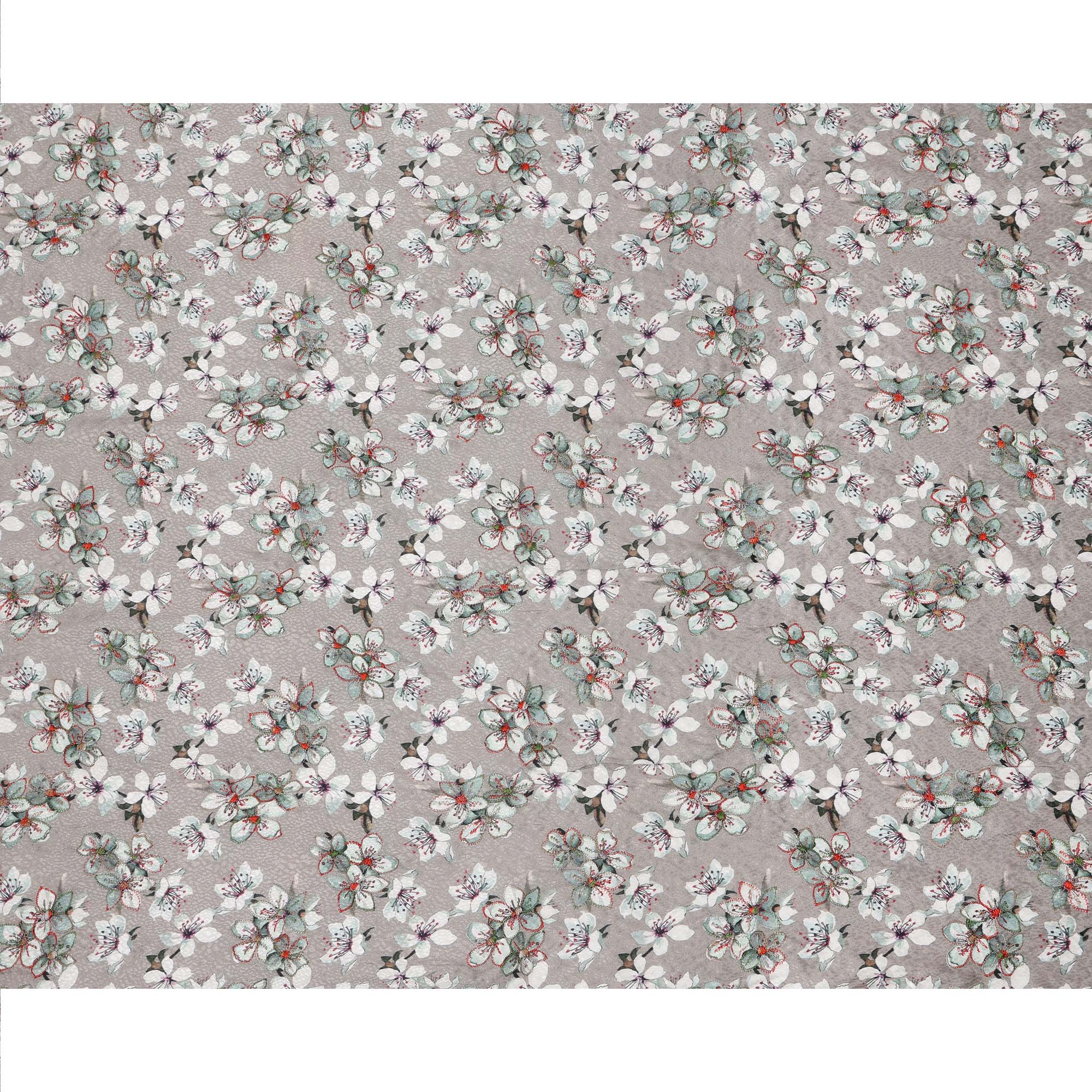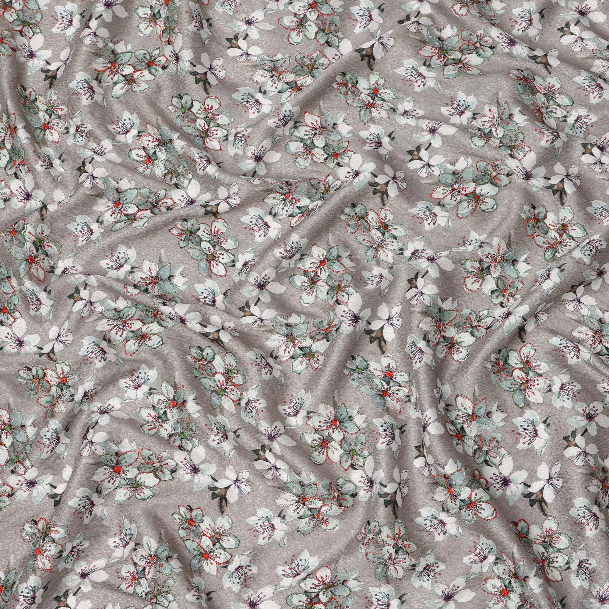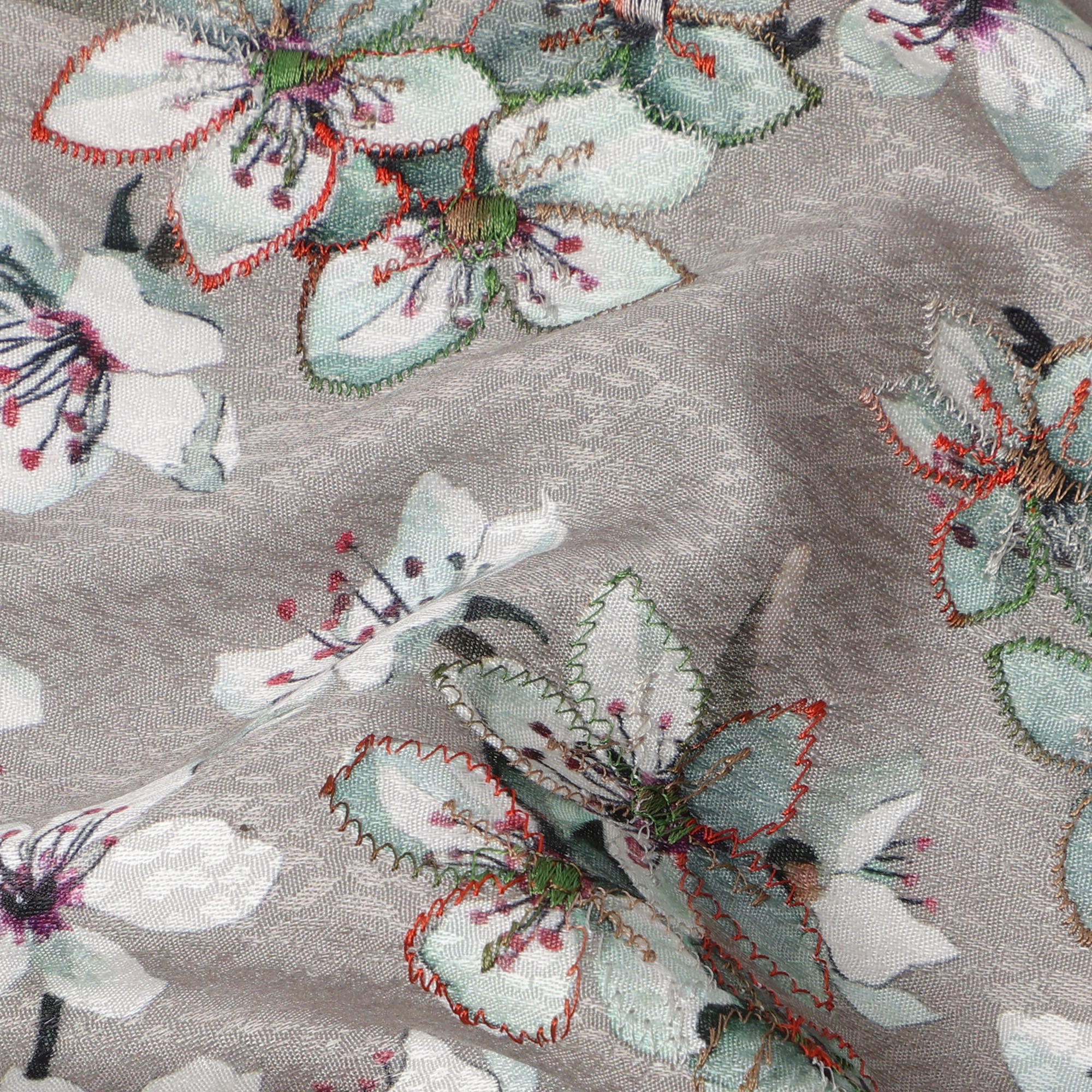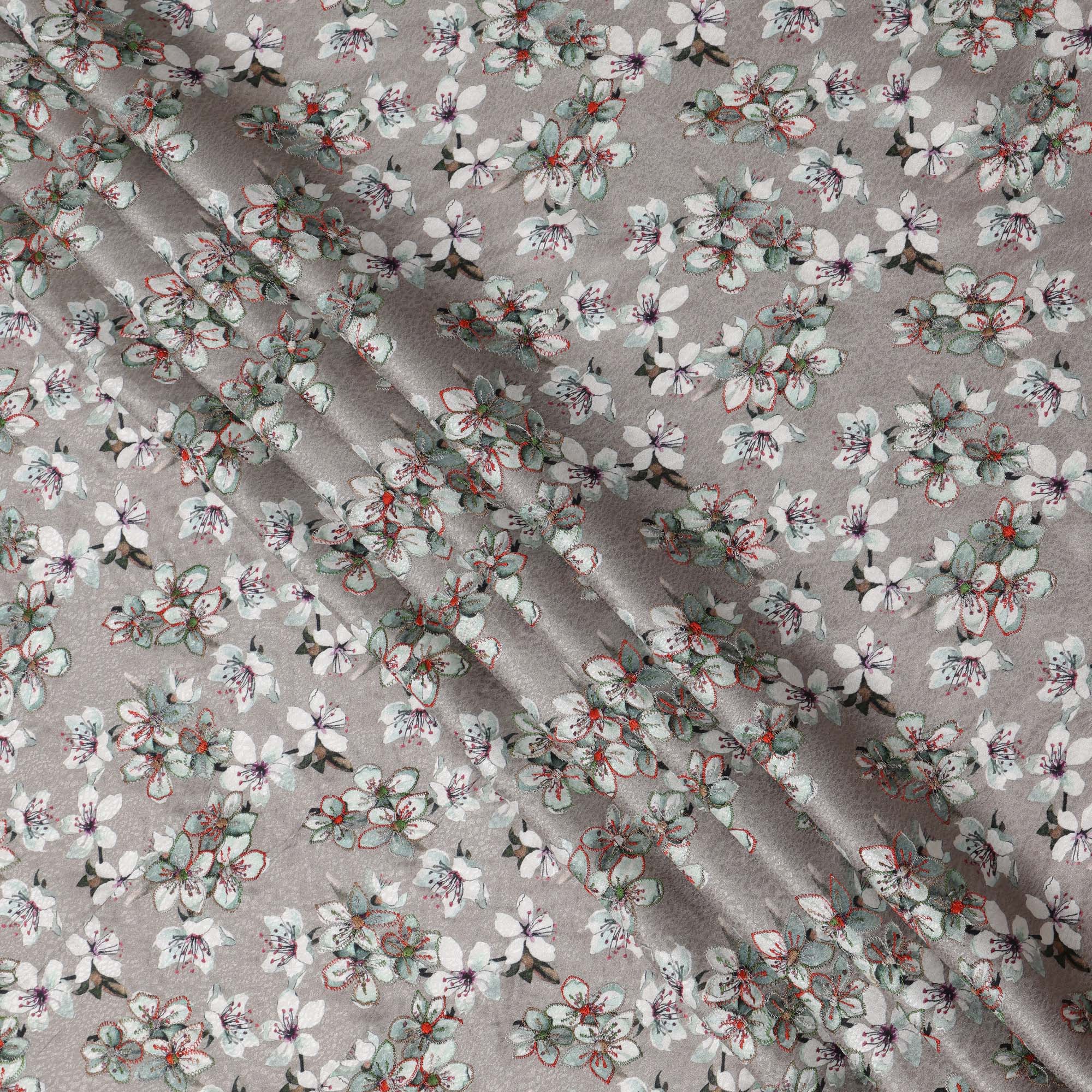قماش فيسكوز رمادي اللون، مطبوع عليه زهور، مطرز بخيوط متعددة الألوان، 110 سم، الهند - D23843