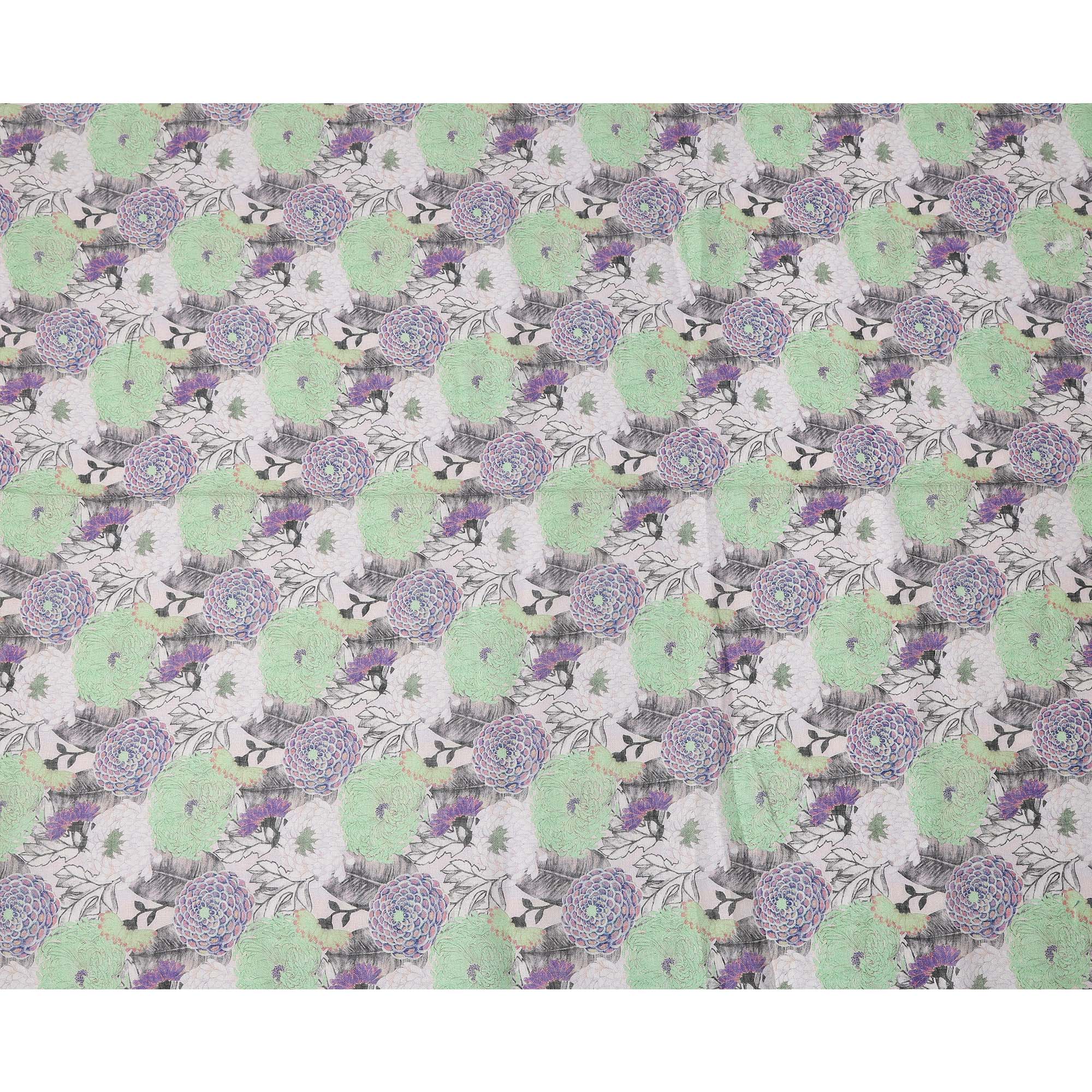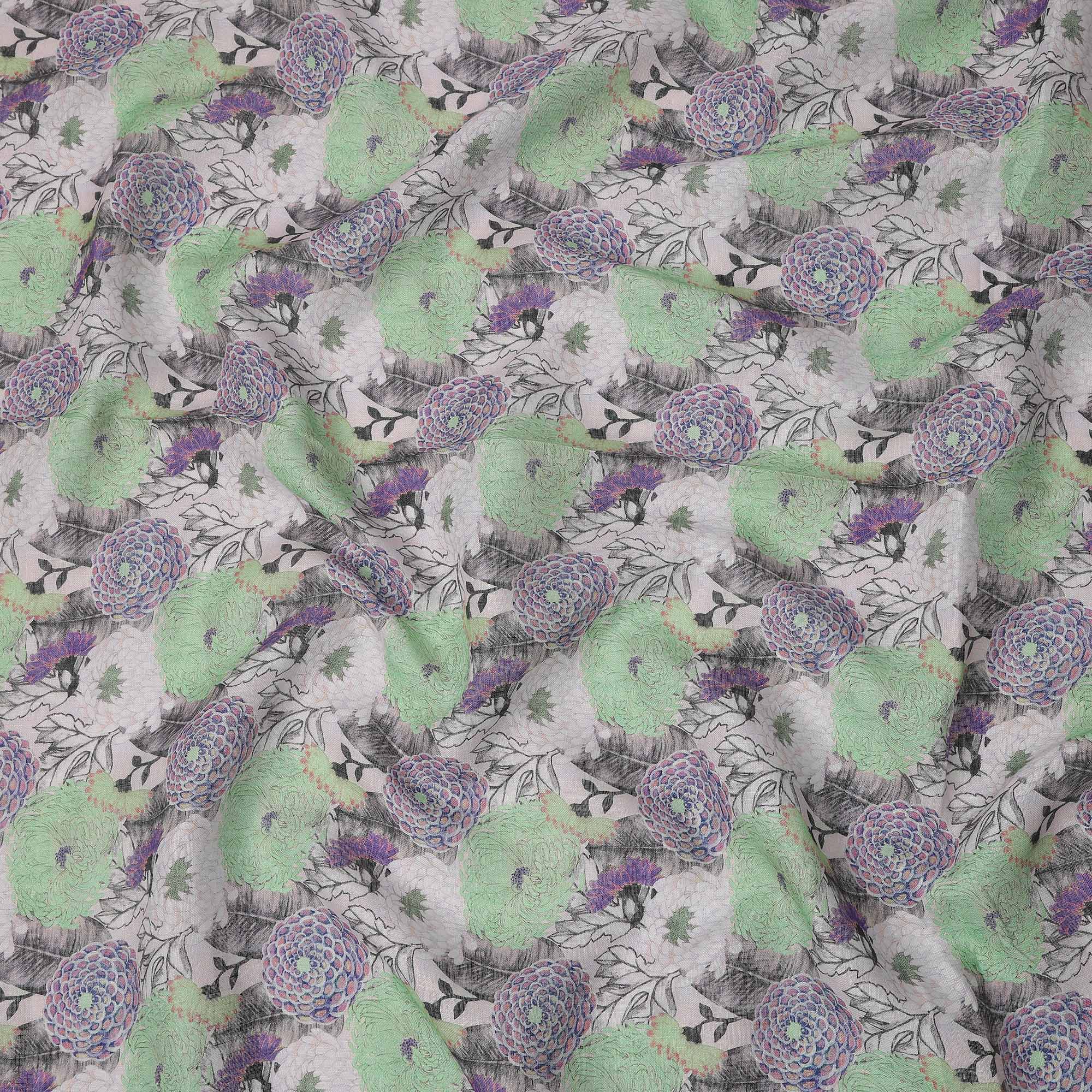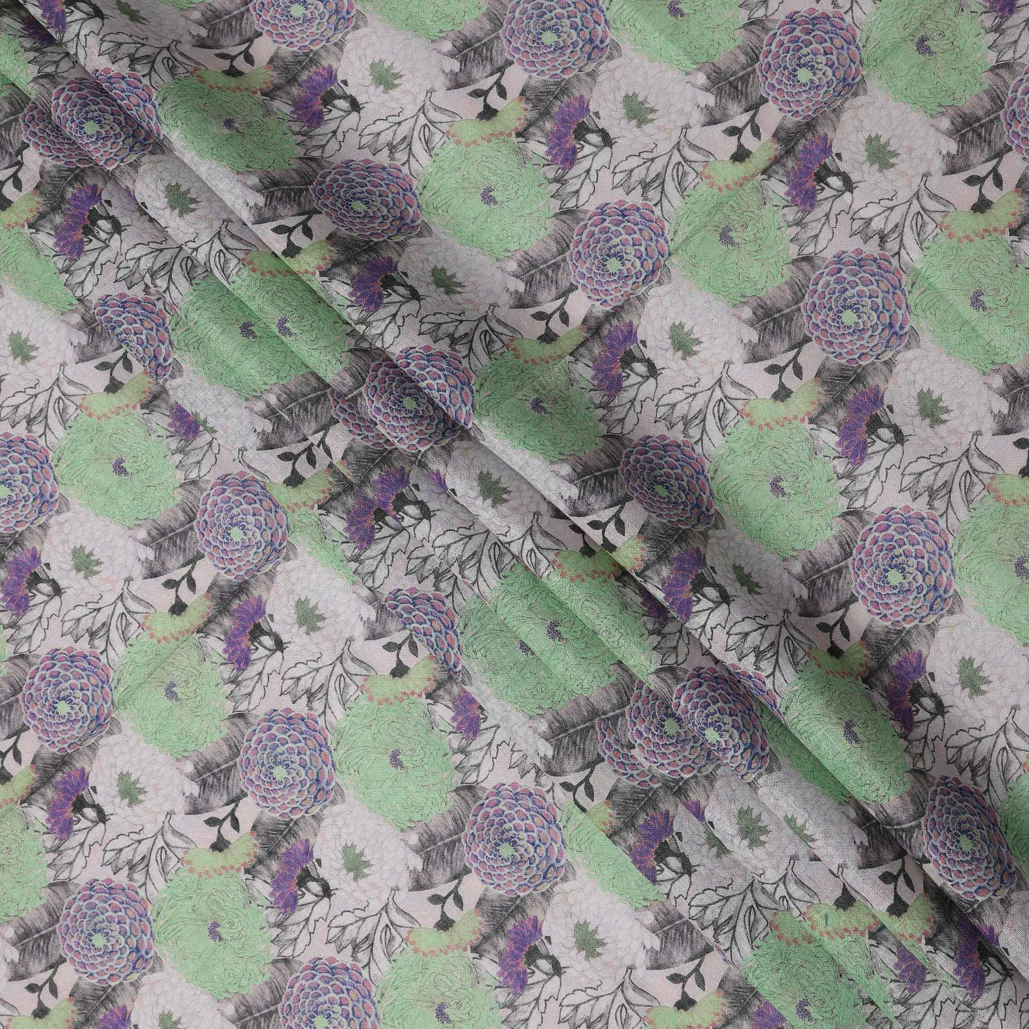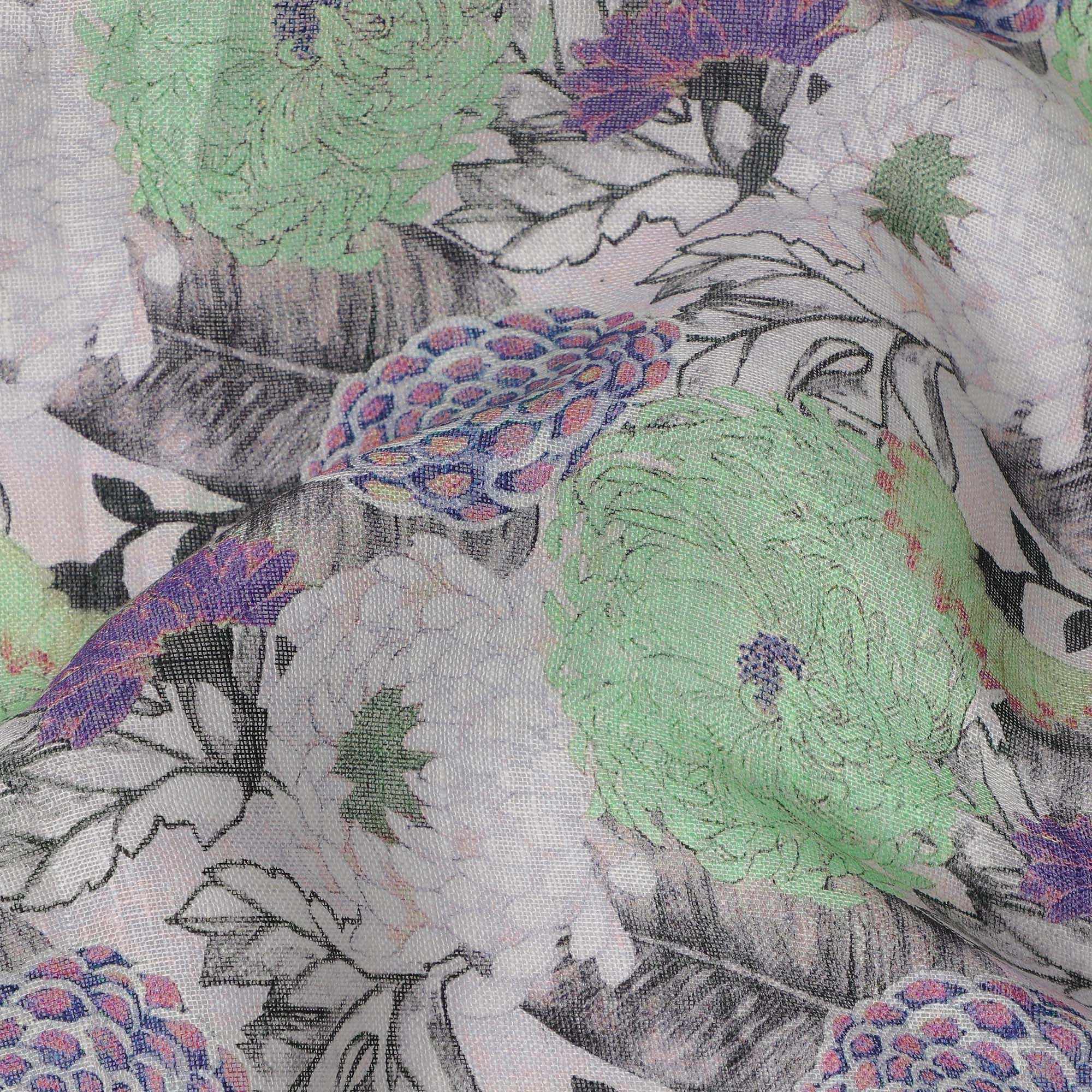 قماش كتان رمادي مطبوع عليه زهور بتصميم أزهار خضراء وأرجوانية، عرض 110 سم، صنع في الهند - D25089