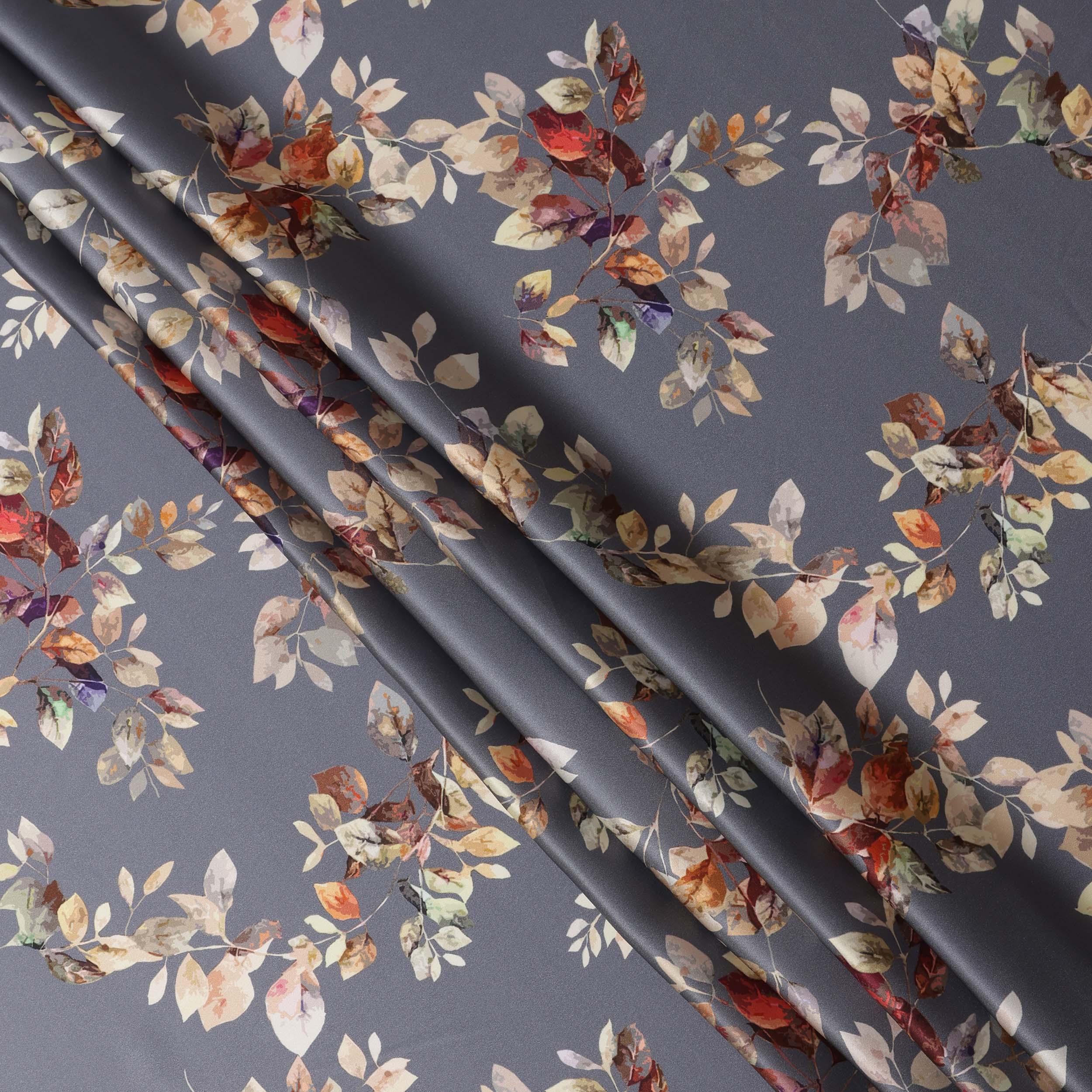 Grey Multicolor Leaf Print Premium Pure Silk Satin Fabric, 110 Cms Width, Made in South Korea-D25946