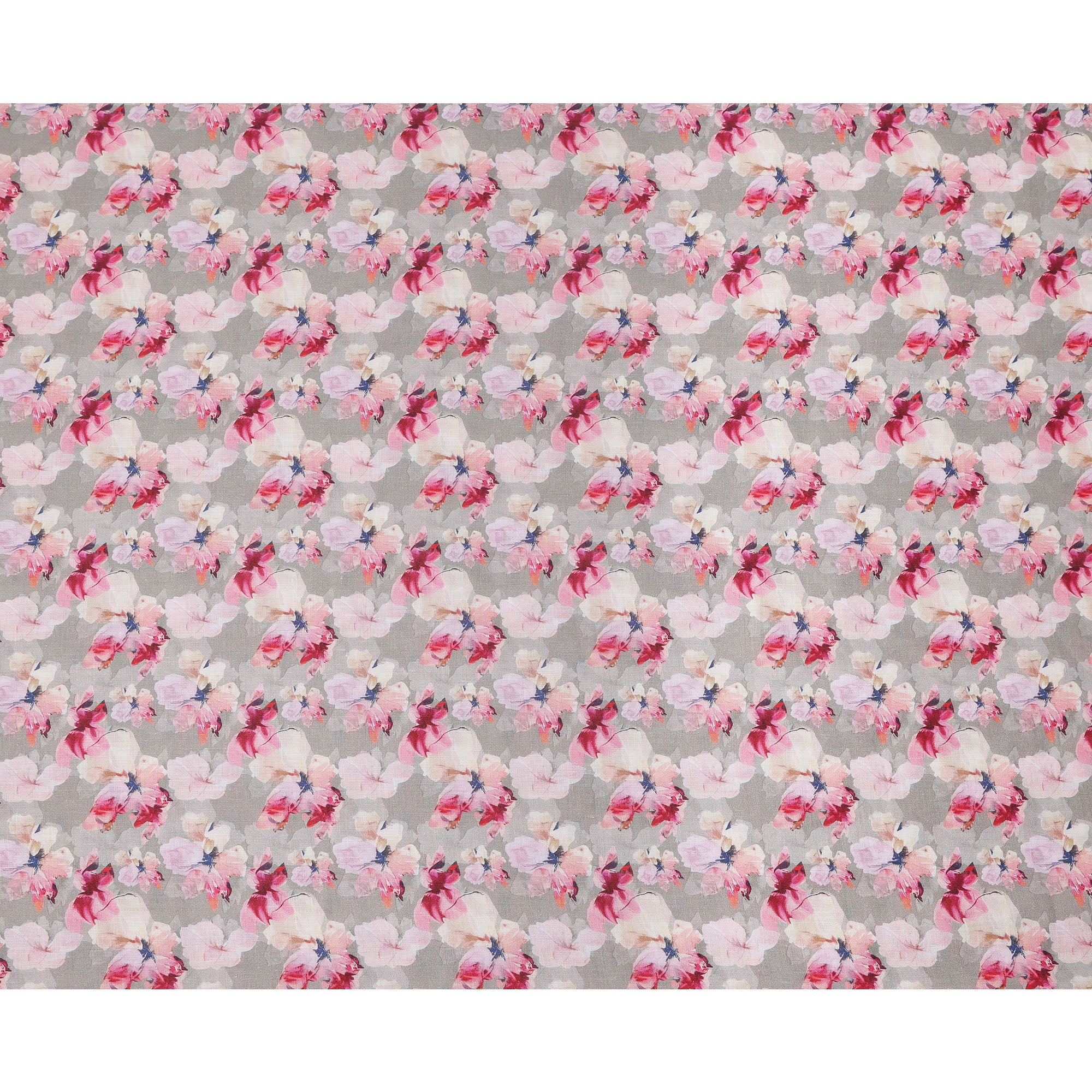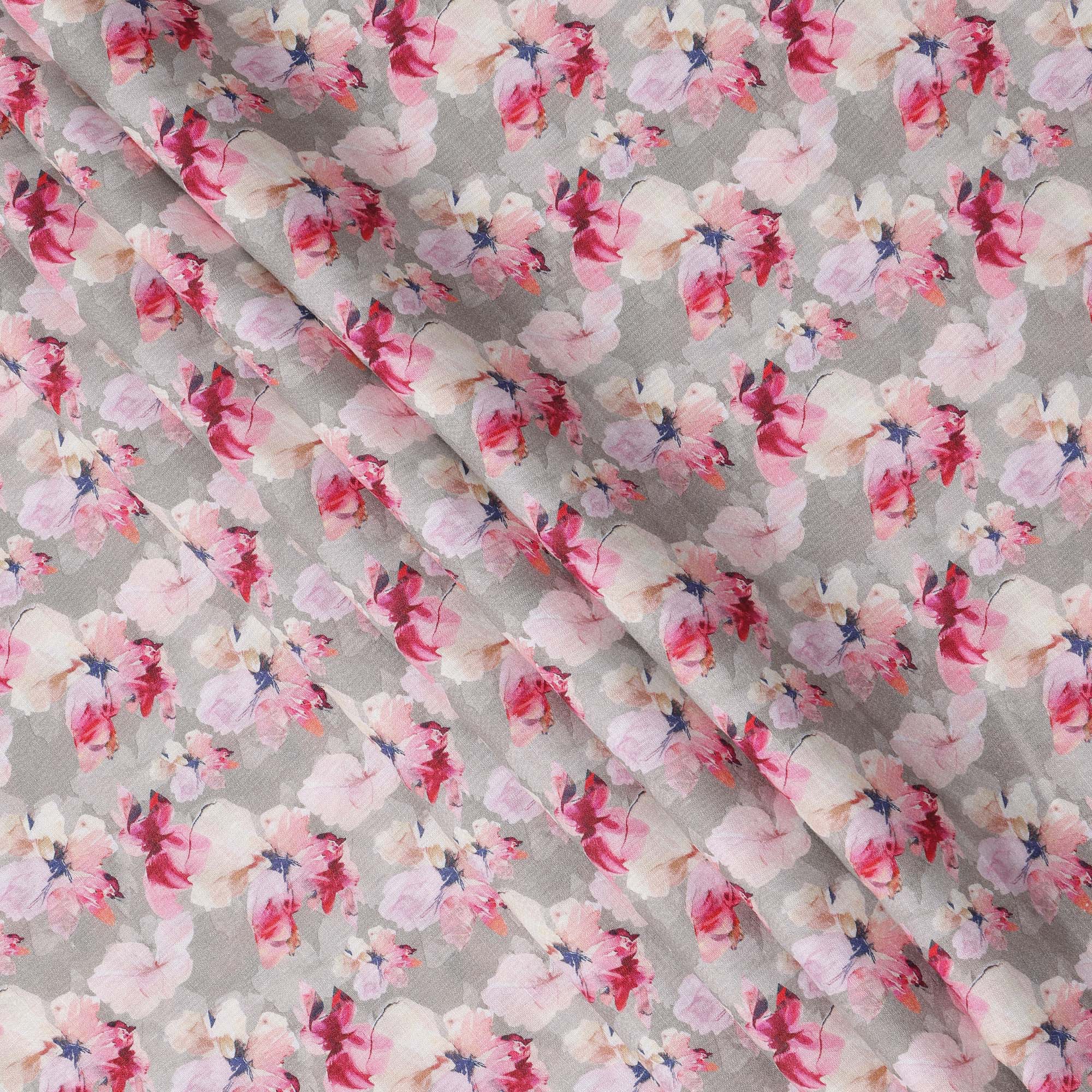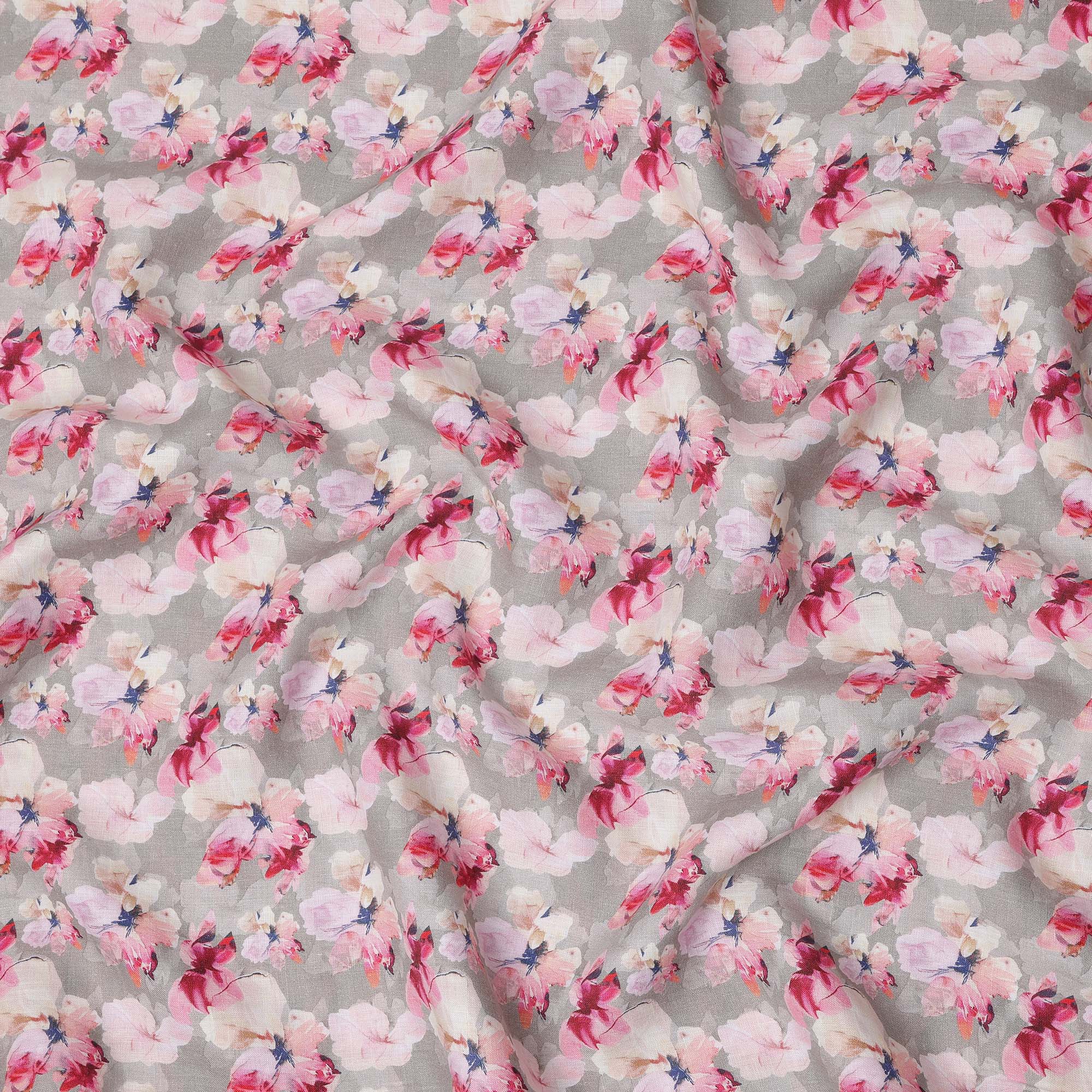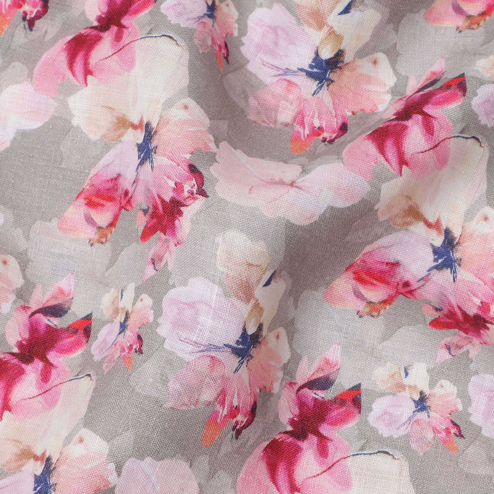 قماش كتان رمادي نقي مطبوع عليه زهور بتصميم زهور وردية وبيضاء، عرض 140 سم، صنع في الهند - D25069