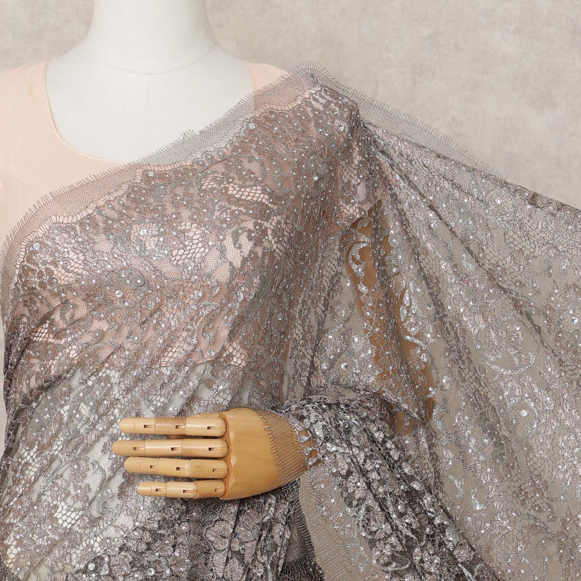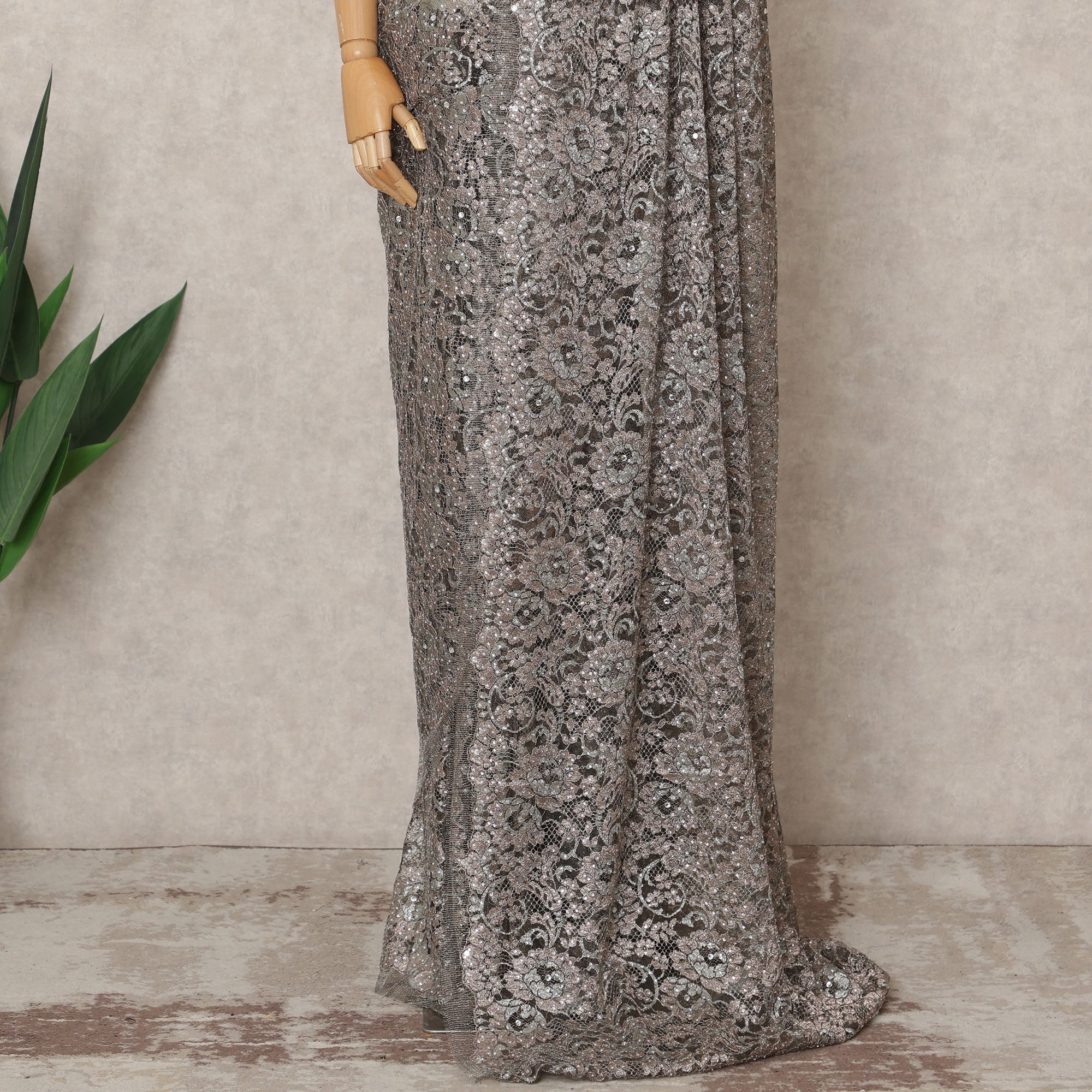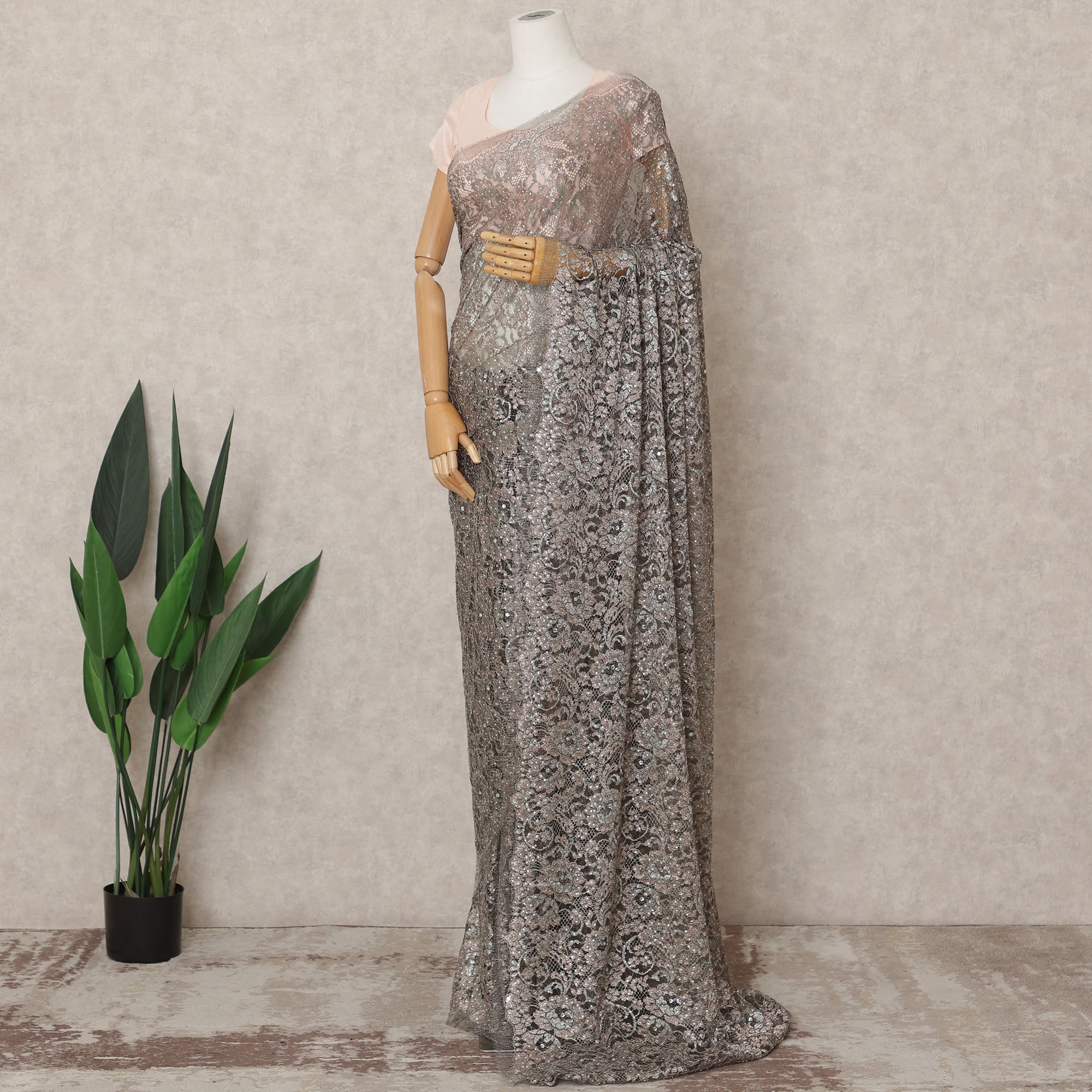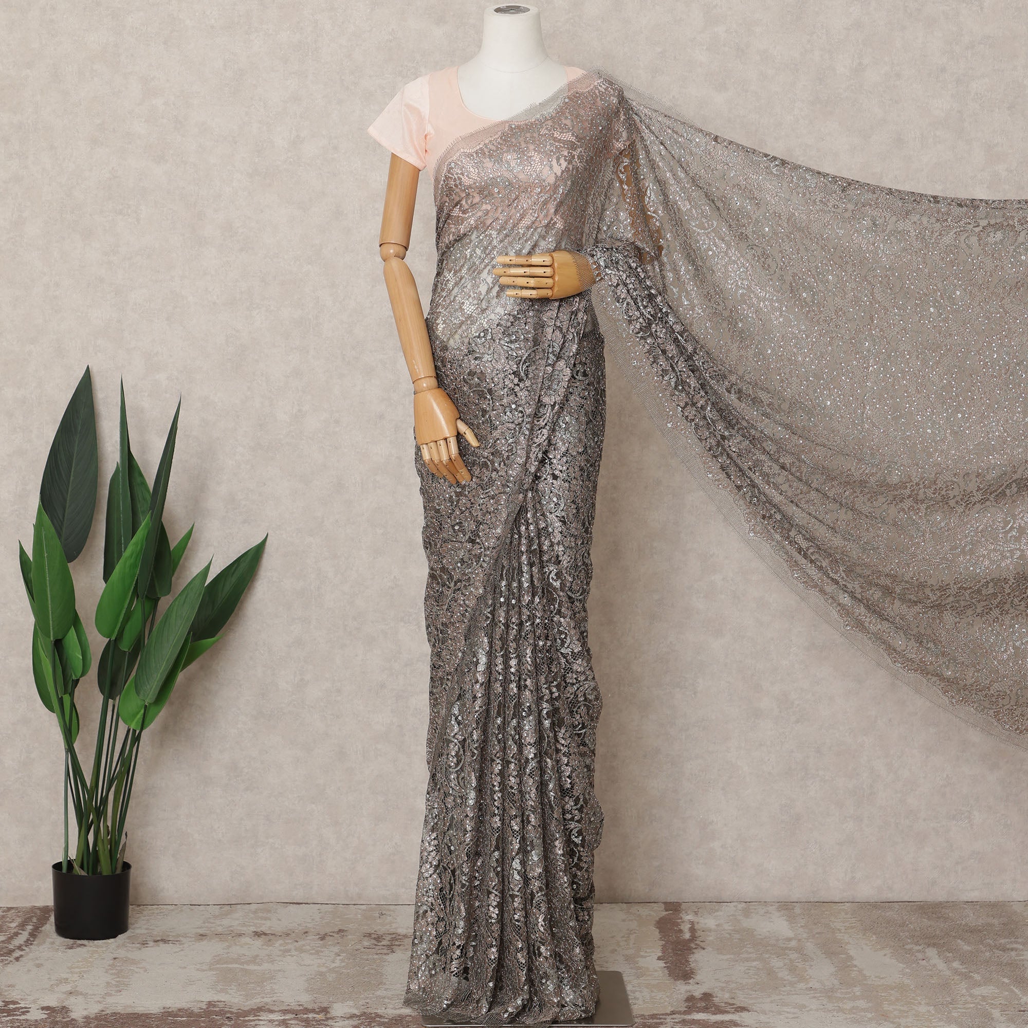 ساري فاخر من الدانتيل الشانتيلي المعدني باللون الرمادي الداكن مع تطريز حجري، بطول 5.5 متر، وعرض 110 سم، صنع في فرنسا - D23883