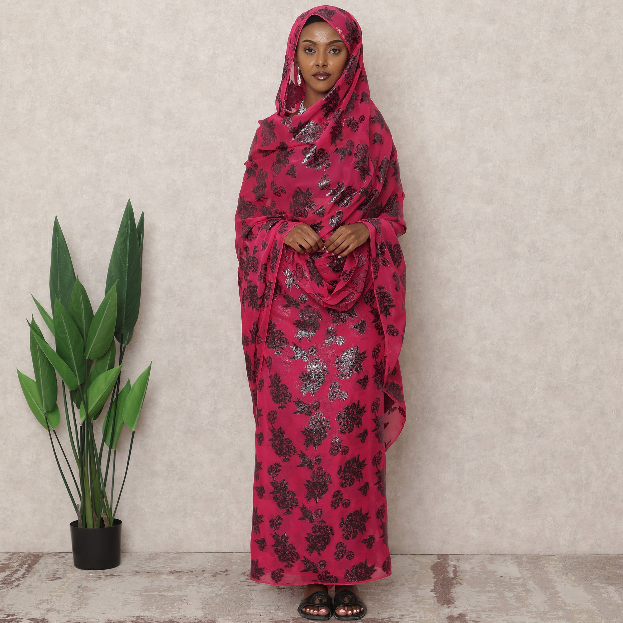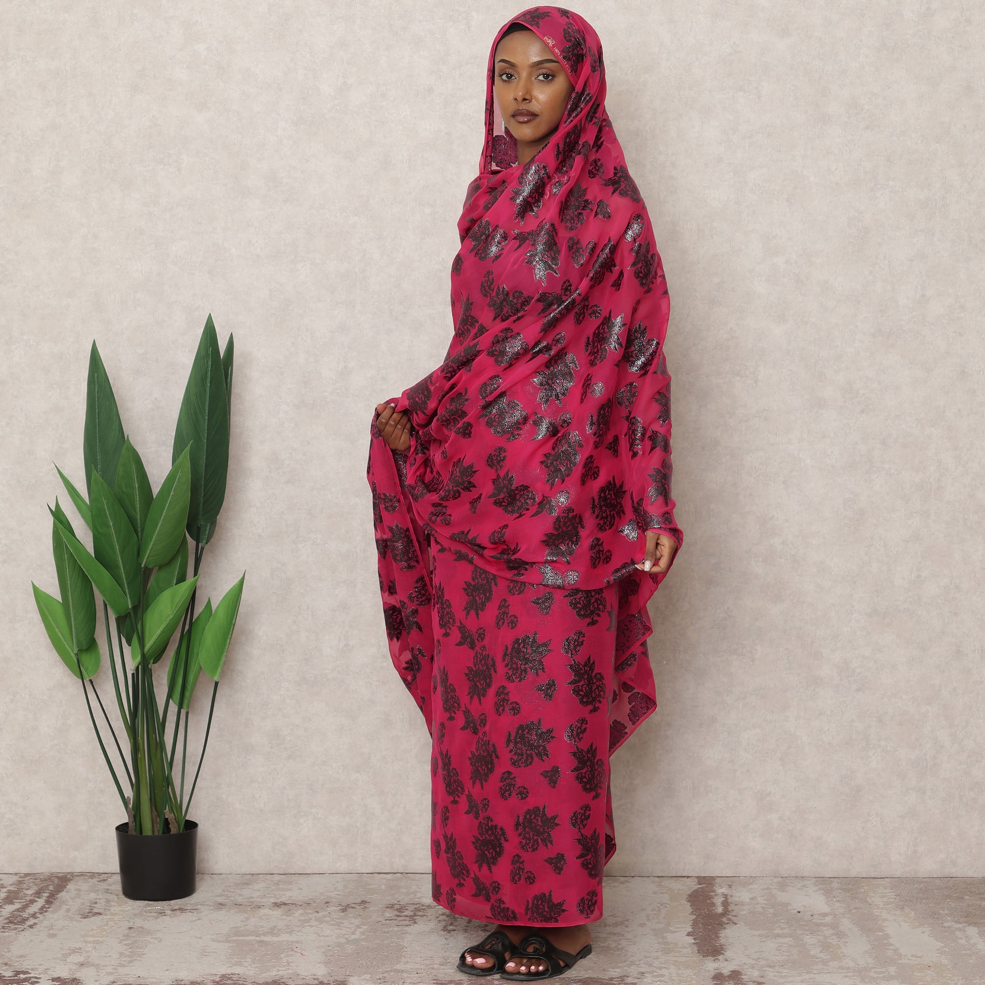 ثوب سوداني تقليدي وردي فاقع، مصنوع من قماش شيفون حرير نقي بطول 4.5 متر وقماش لوركس معدني، عرض 140 سم، صنع في كوريا الجنوبية - D24491