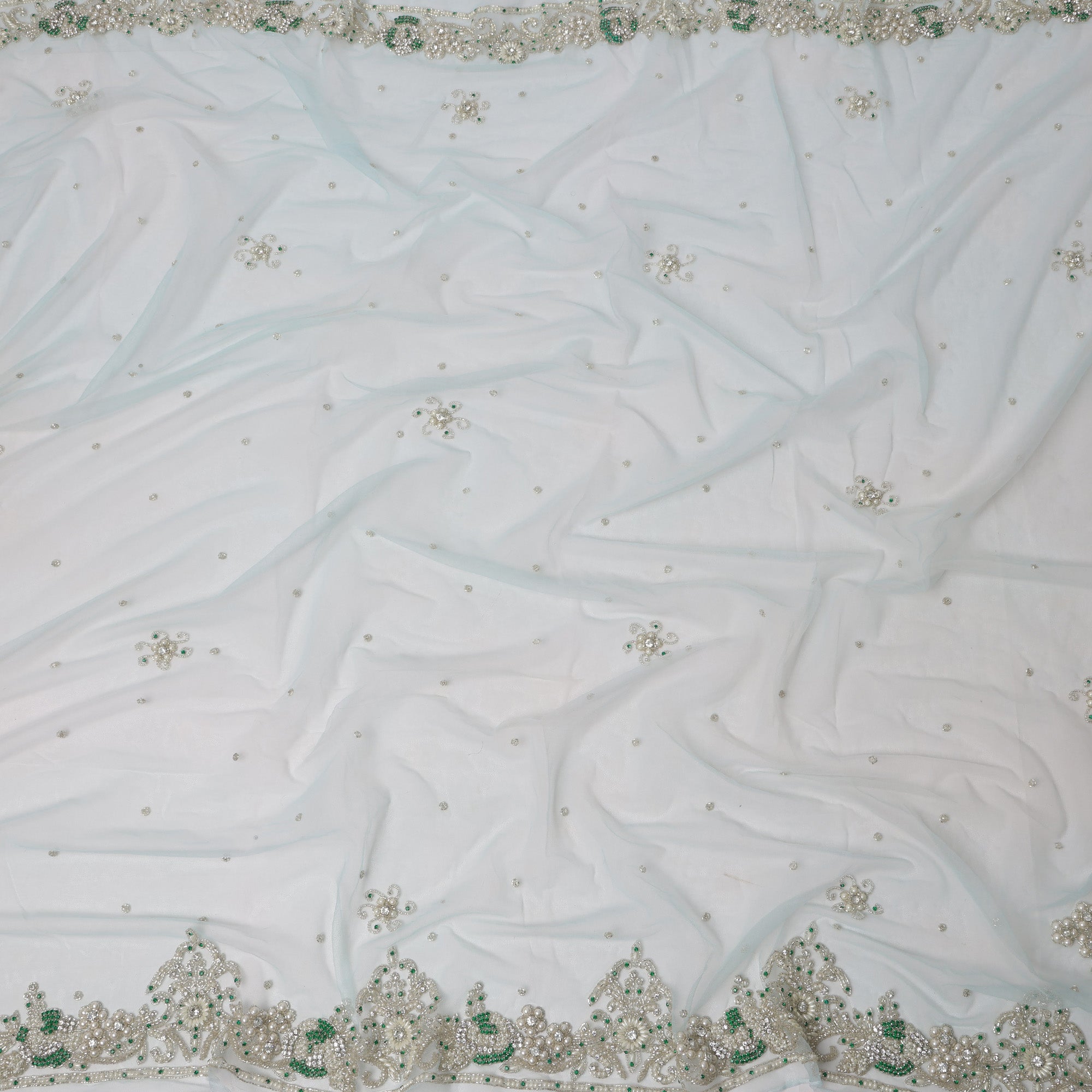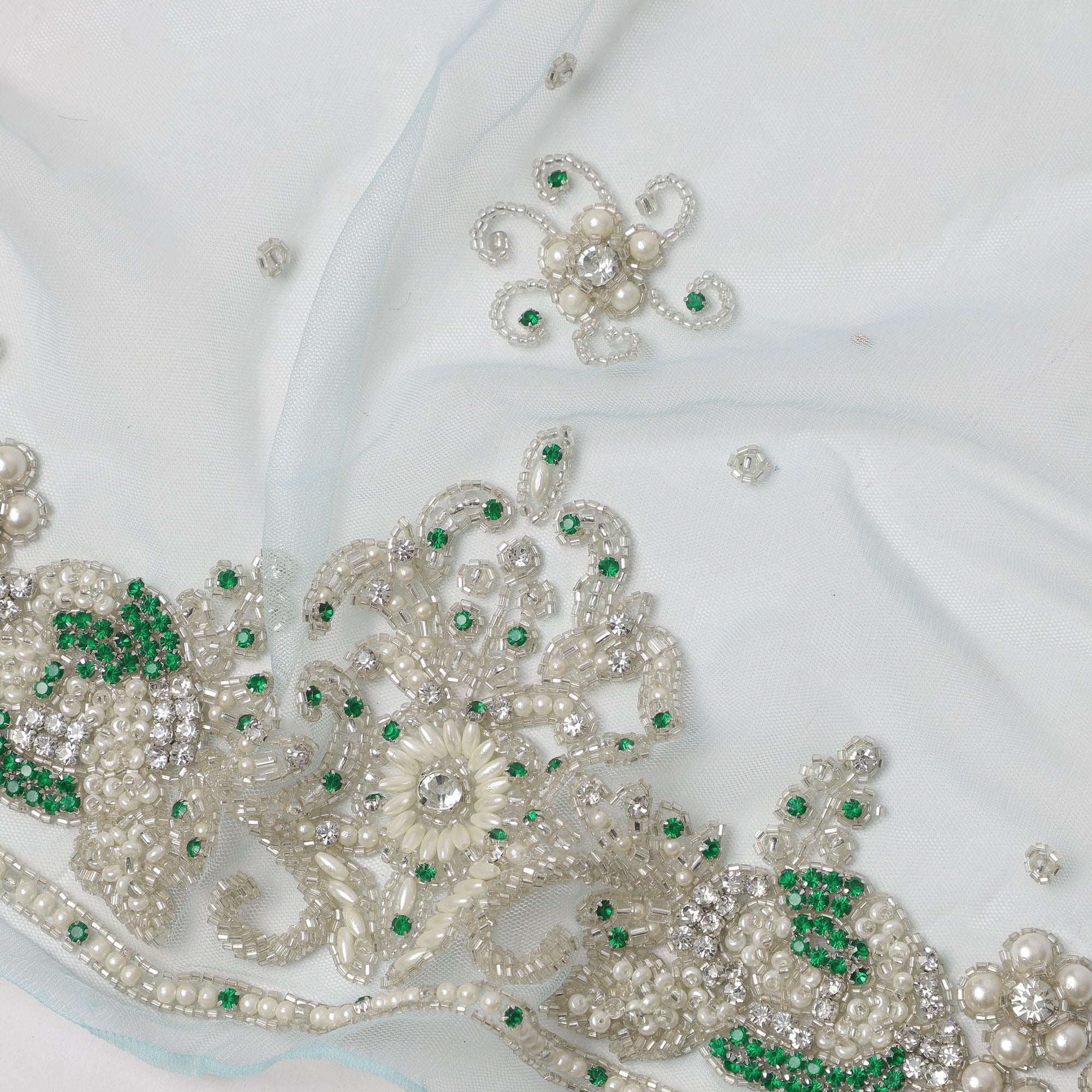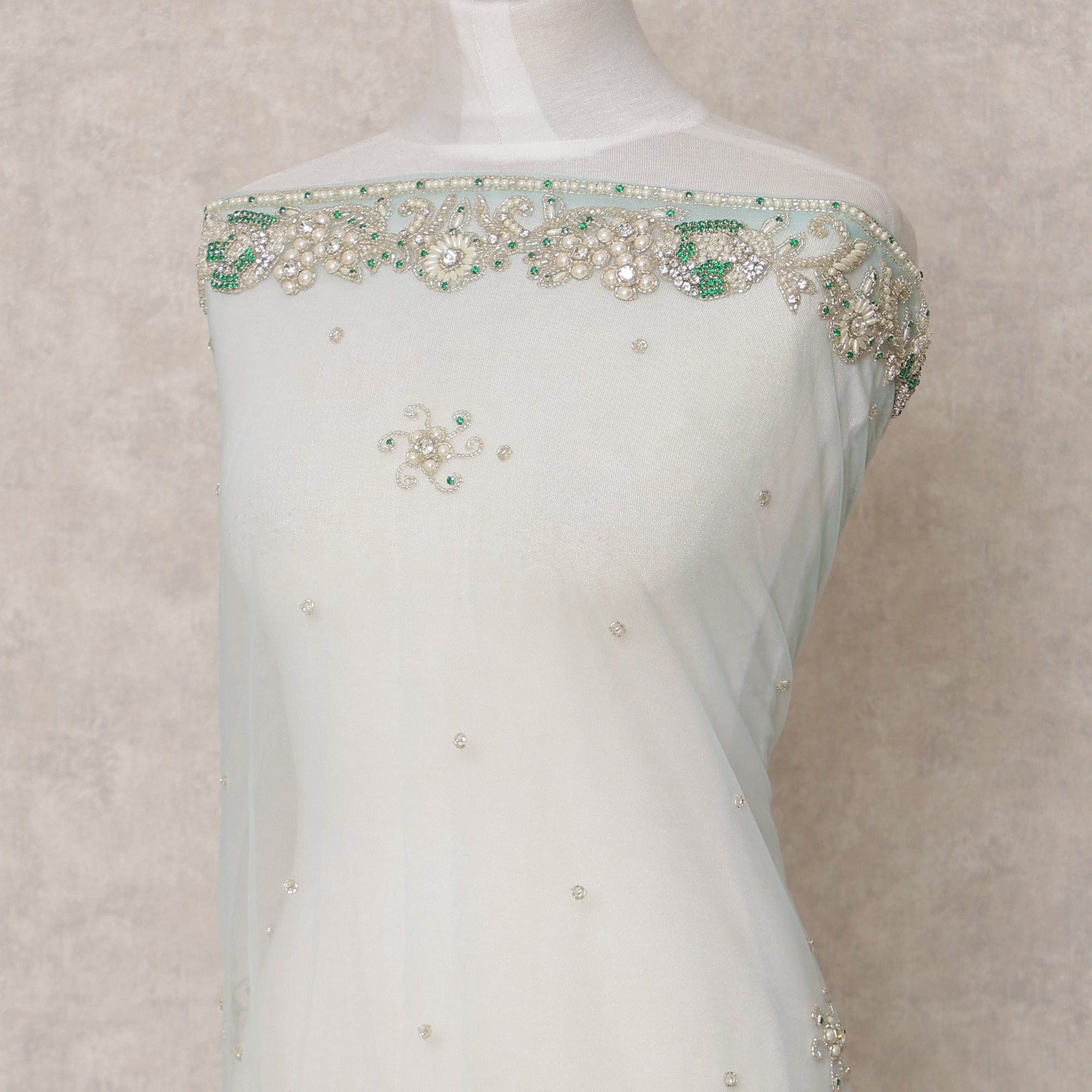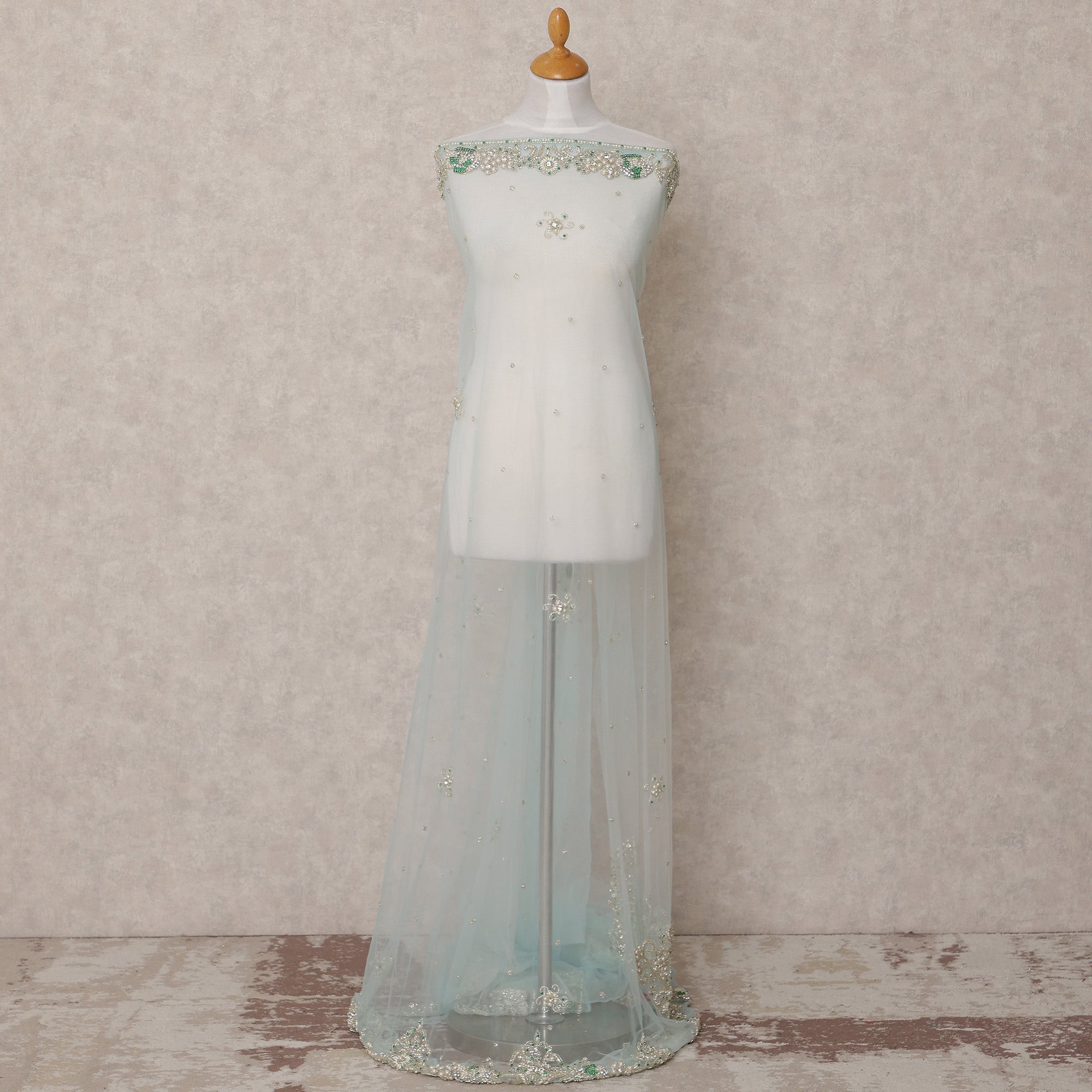 • قماش تول نايلون أزرق ثلجي مطرز مع زخارف نباتية مطرزة باللؤلؤ وحواف فضية خضراء، عرض 140 سم، صنع في الهند - D23491