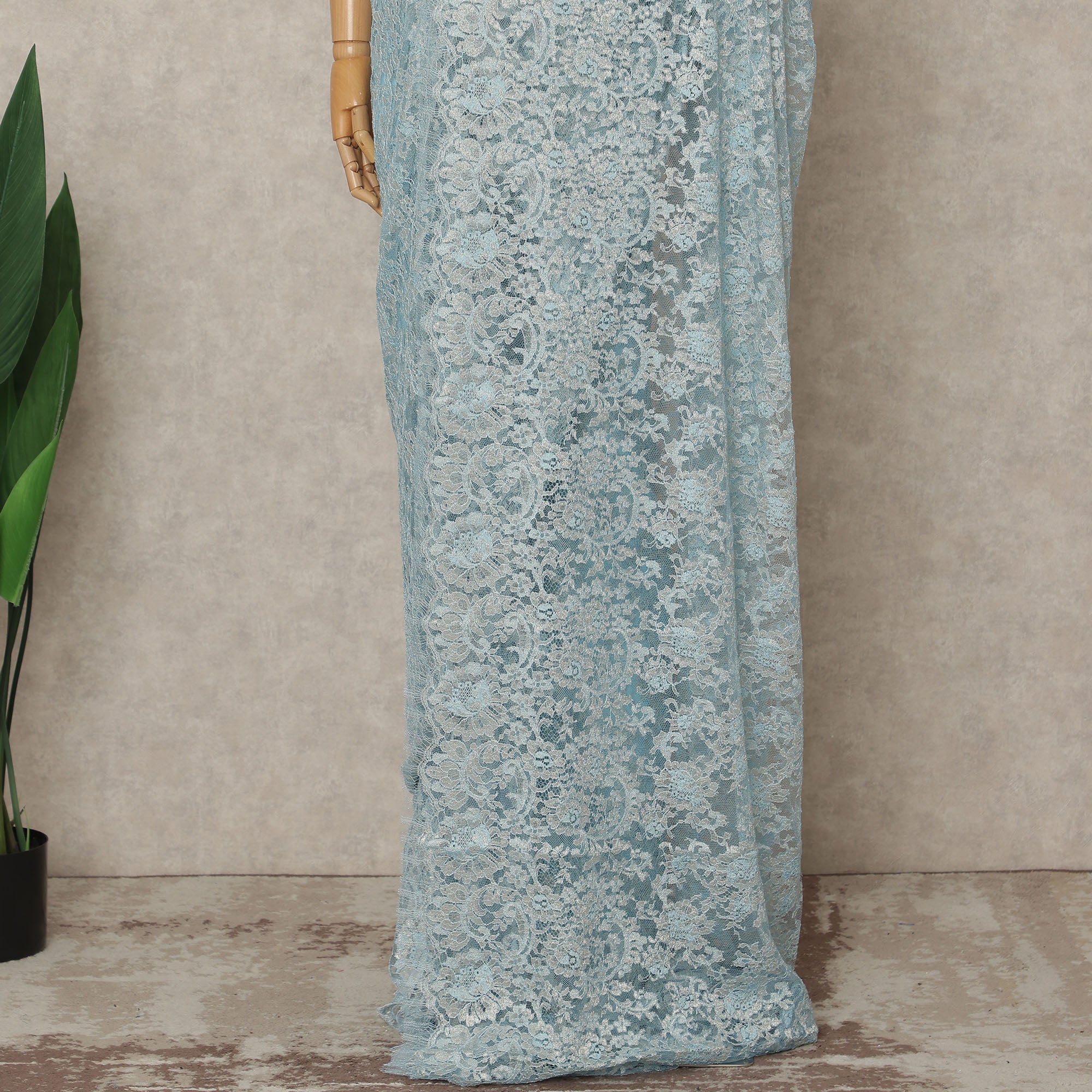 Ice Blue Premium French Metallic Chantilly Lace Saree Fabric, 5.5 Mtrs Length, 110 Cms Width, Crafted in France – Soft Pastel Blue Shimmer Lace, Blouse Not Included-D26436