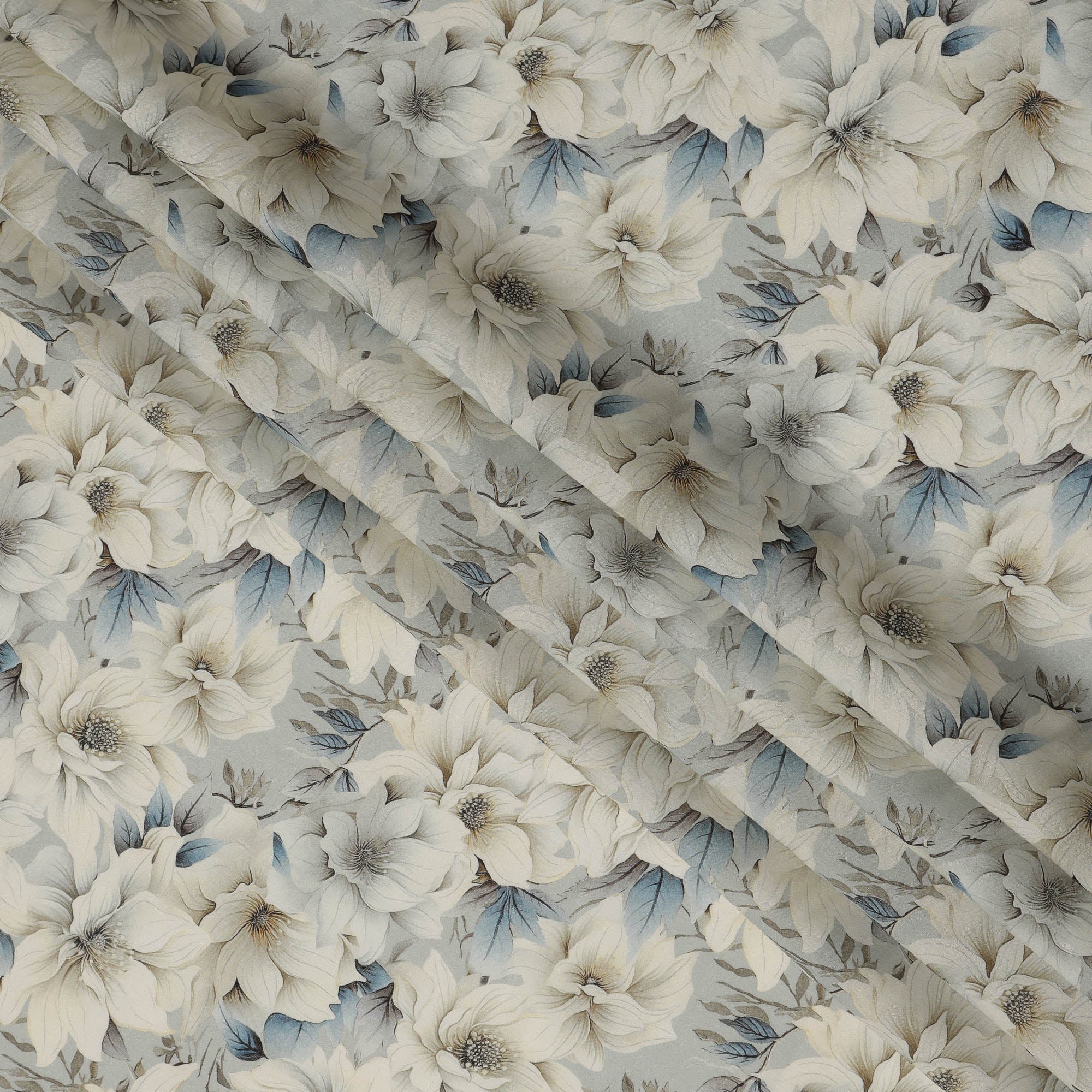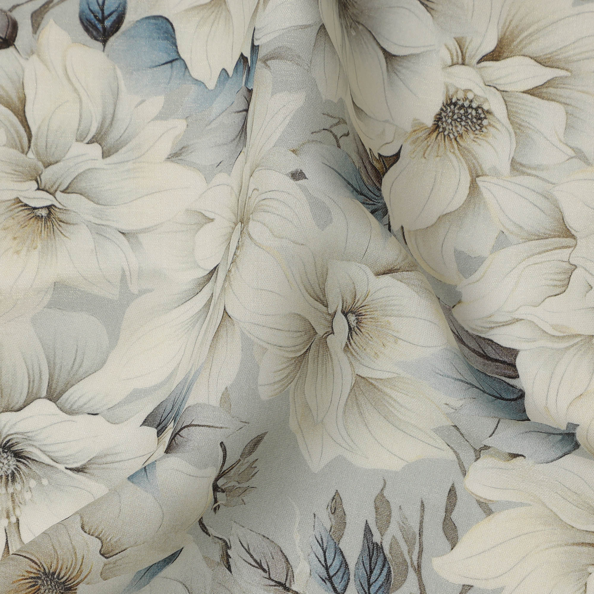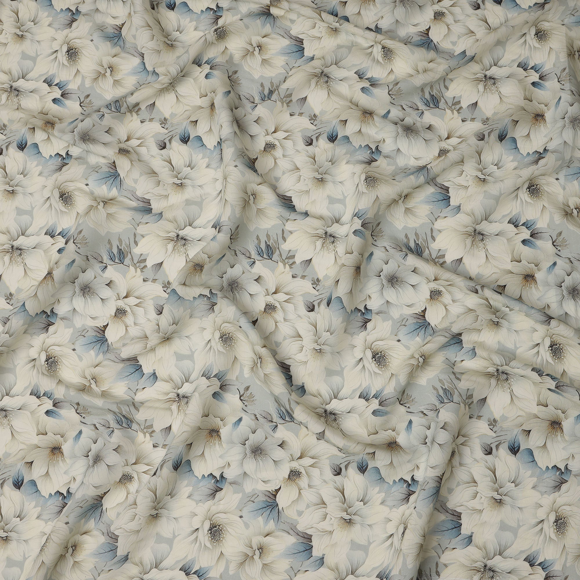 قماش كريب فيسكوز أزرق جليدي كبير الحجم مطبوع عليه زهور عاجي مع تفاصيل أوراق شجر مظللة، عرض 110 سم، صنع في الهند - D23399