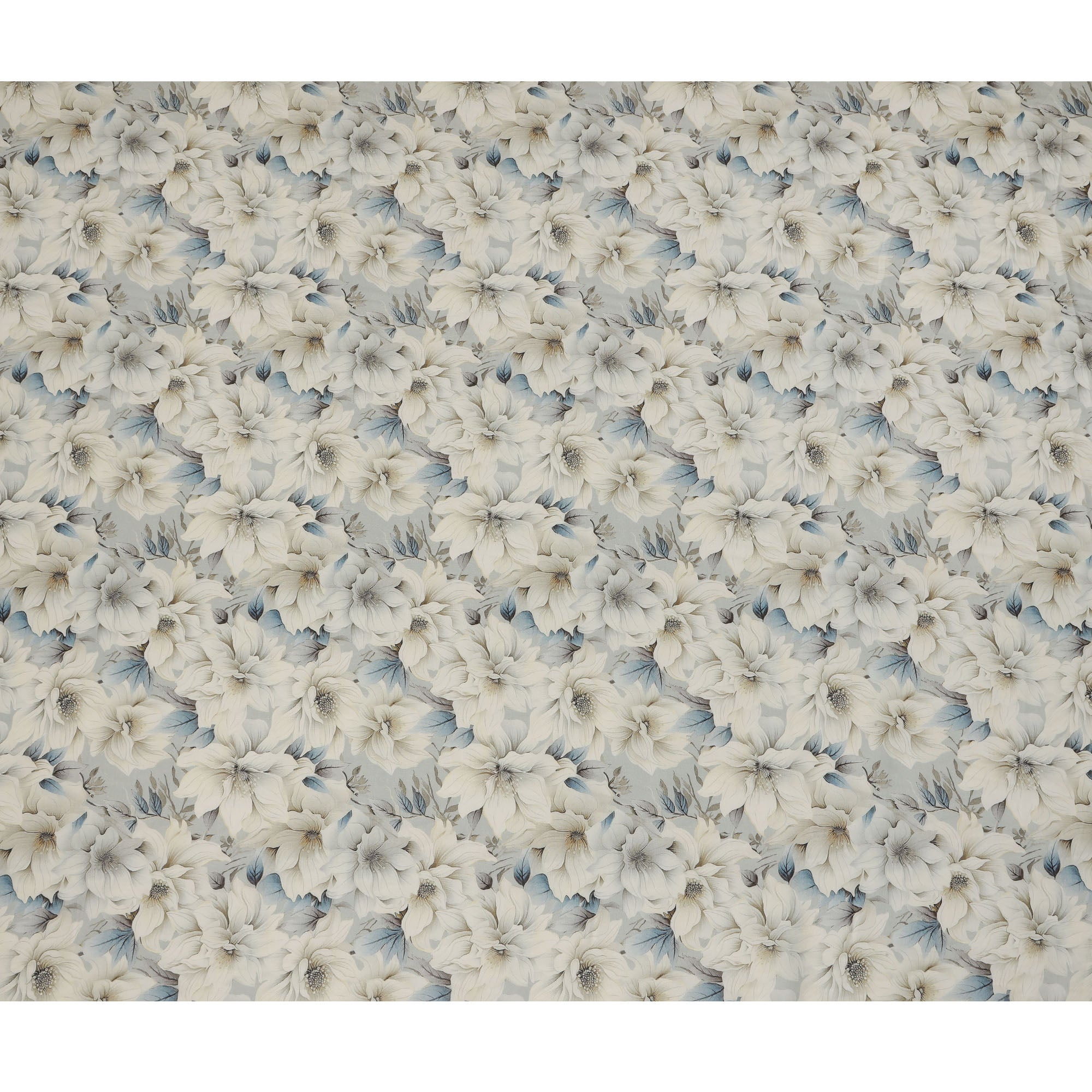 خلفية زرقاء جليدية مع طباعة زهور عاجية كبيرة الحجم وأوراق شجر رمادية زرقاء