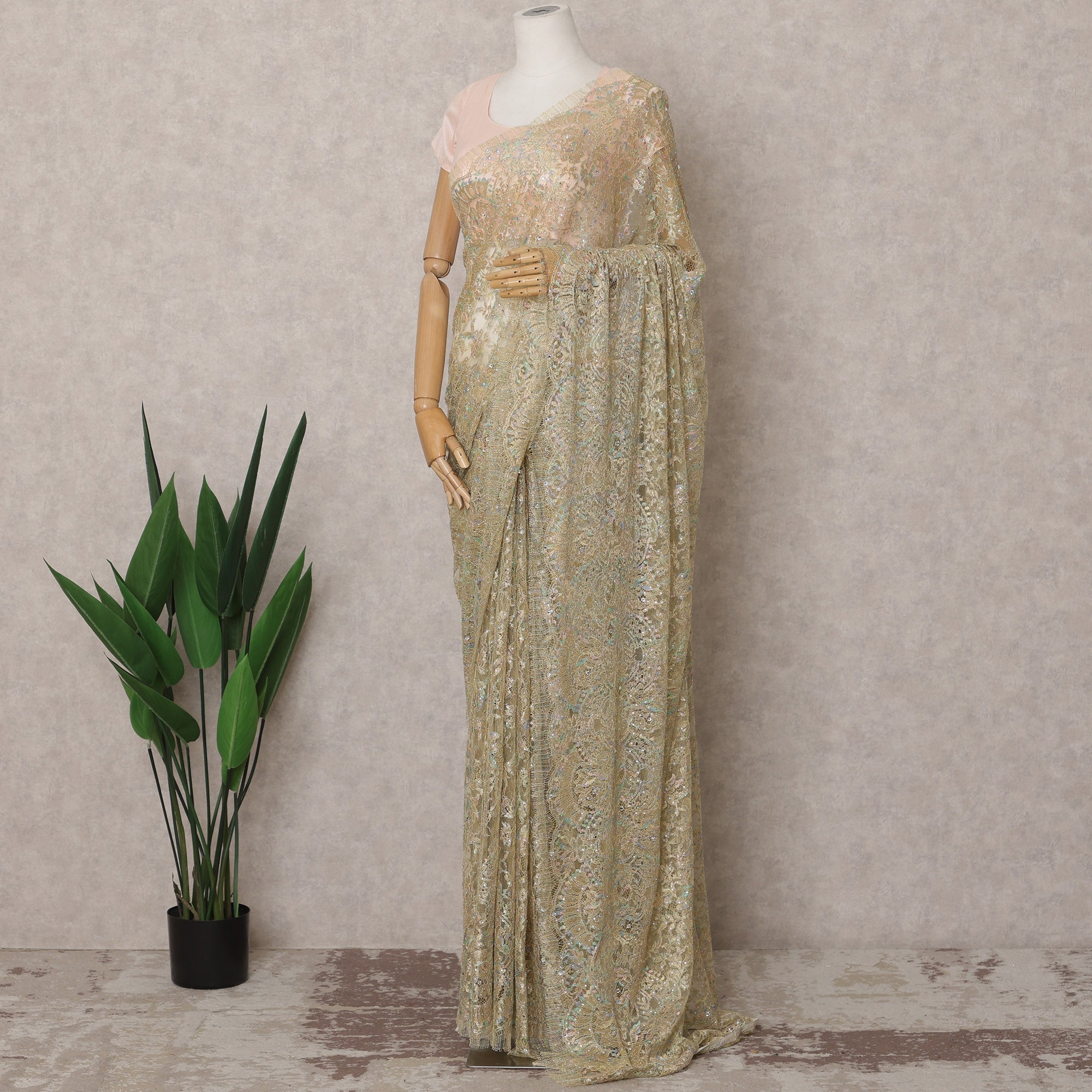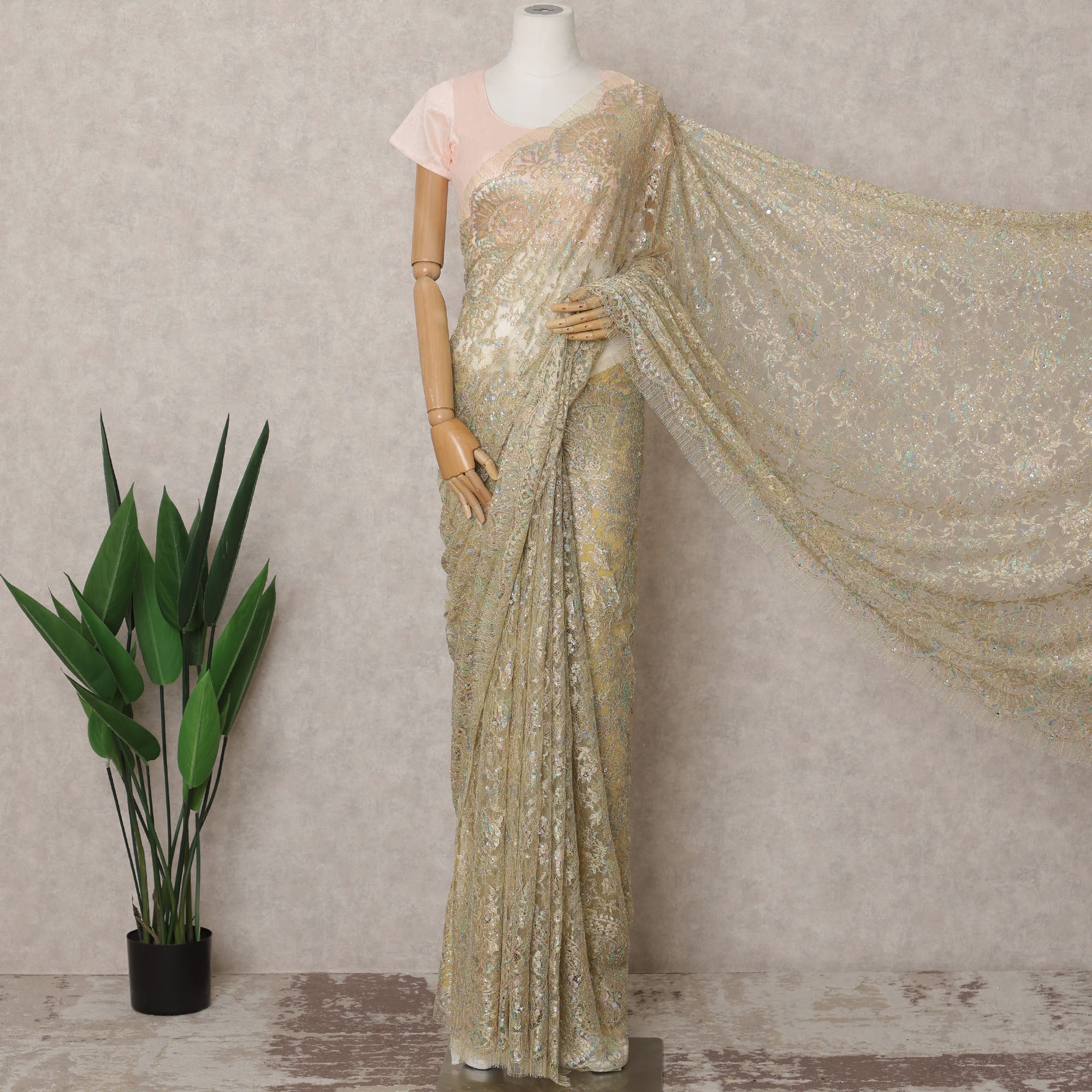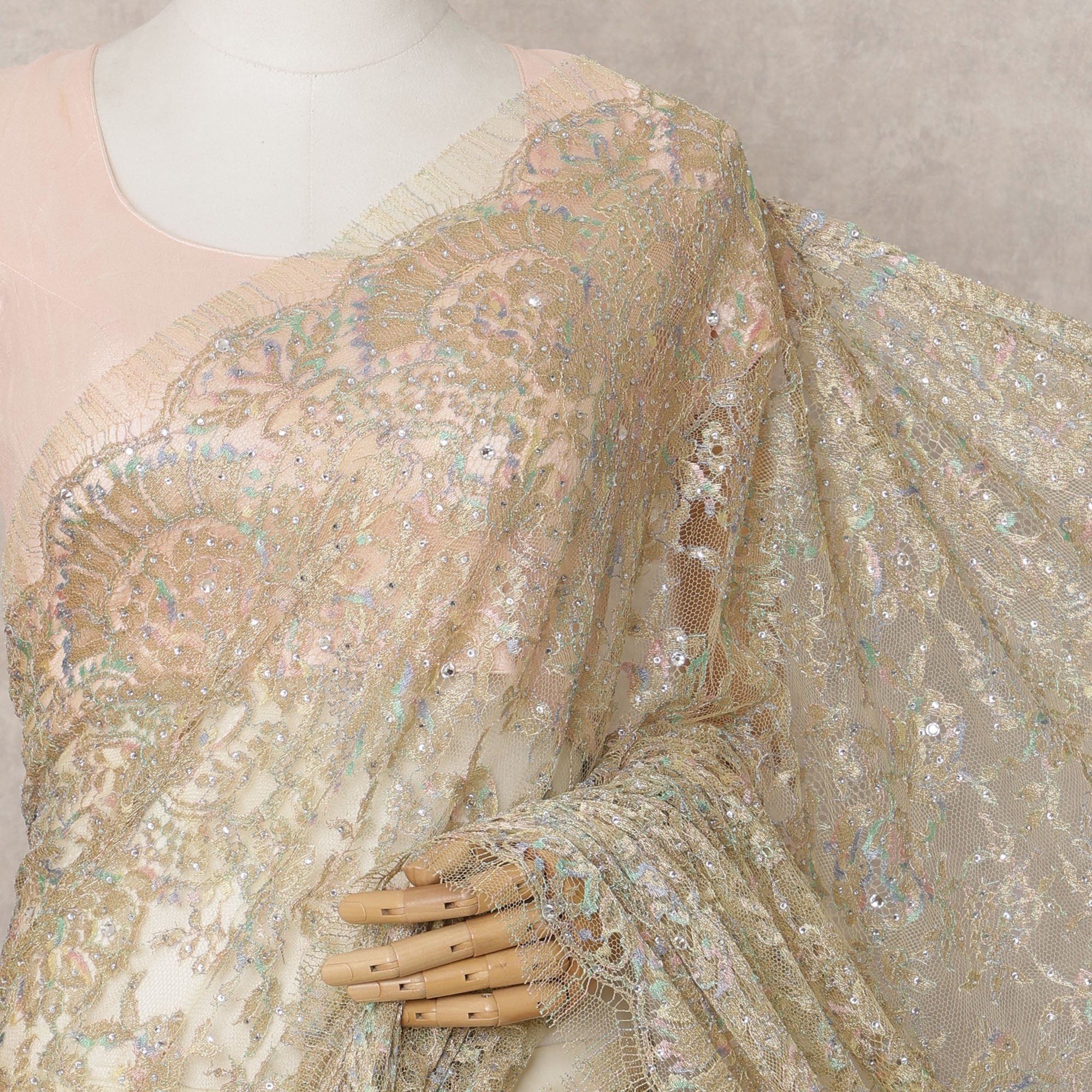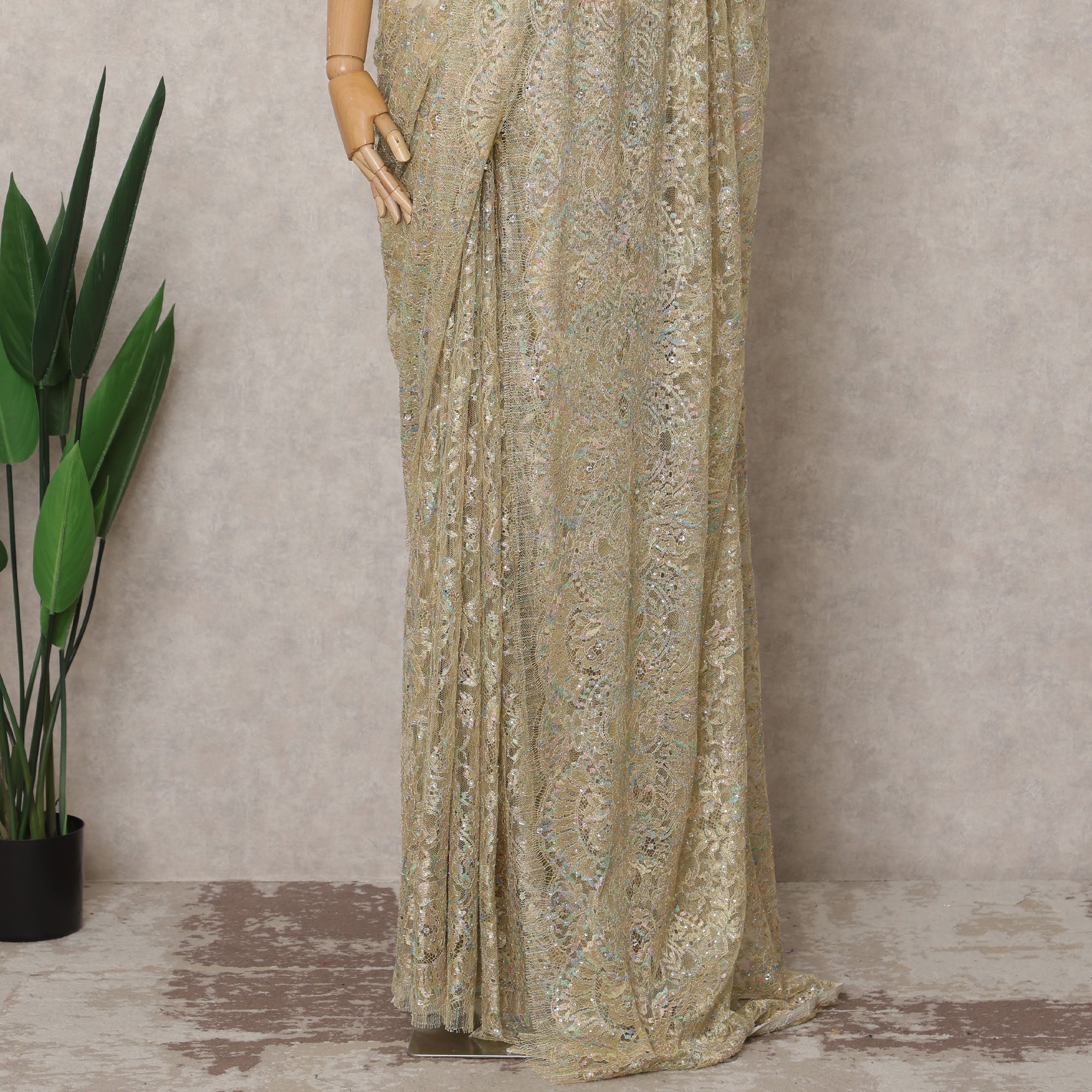 قماش ساري فرنسي فاخر من الدانتيل الشانتيلي المعدني باللون الذهبي اللامع مع تطريز حجري - طول 5.5 متر وعرض 110 سم - مستورد من فرنسا - D22936