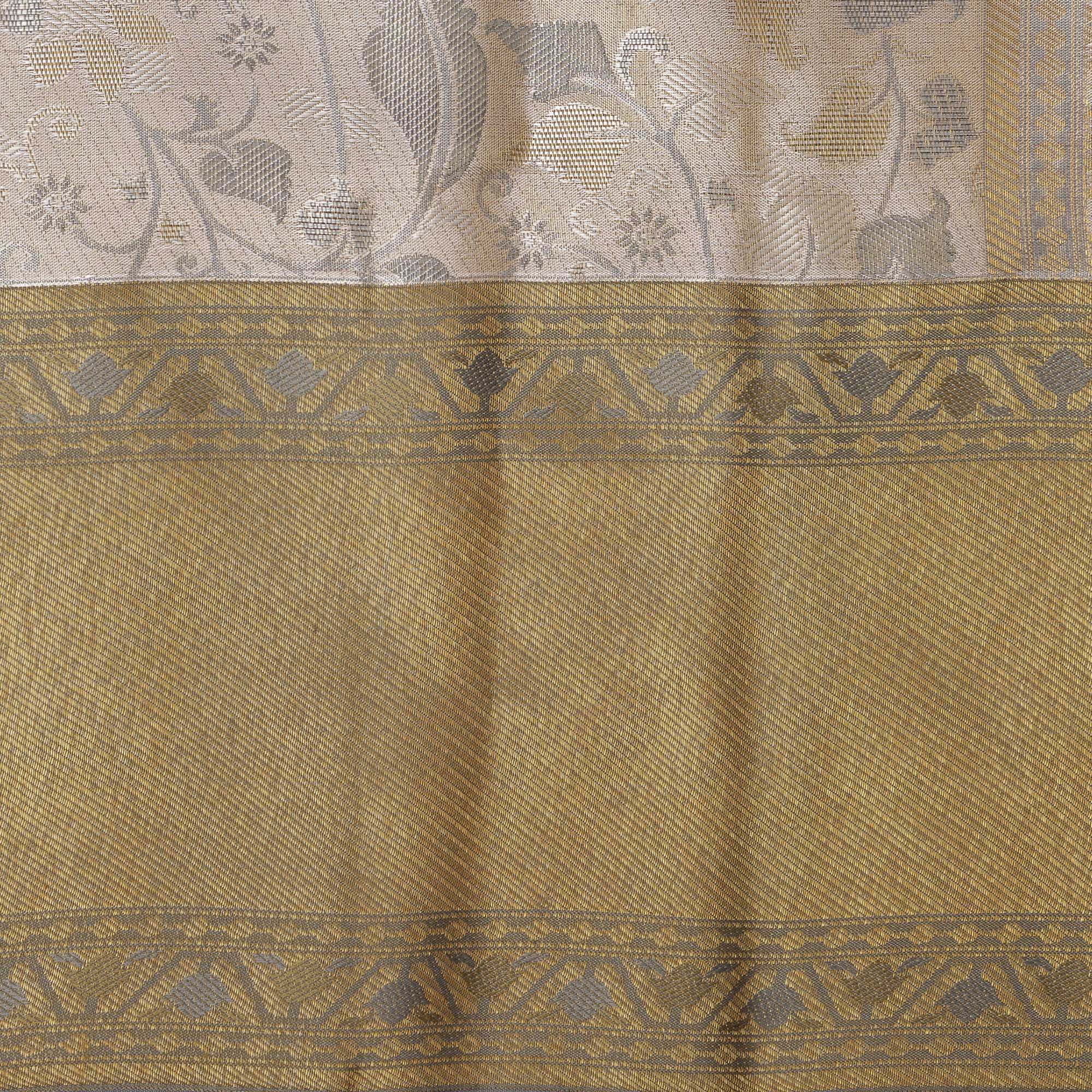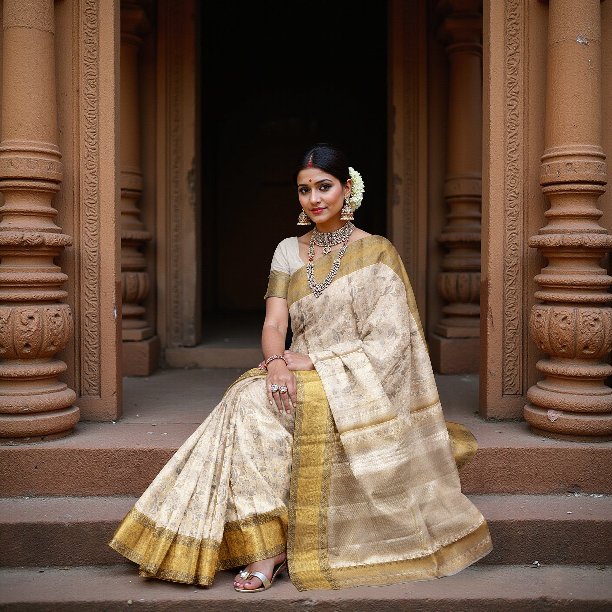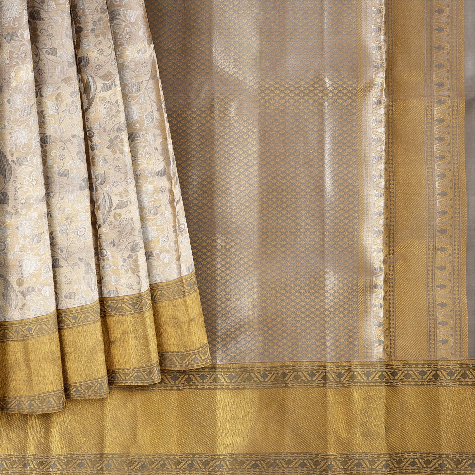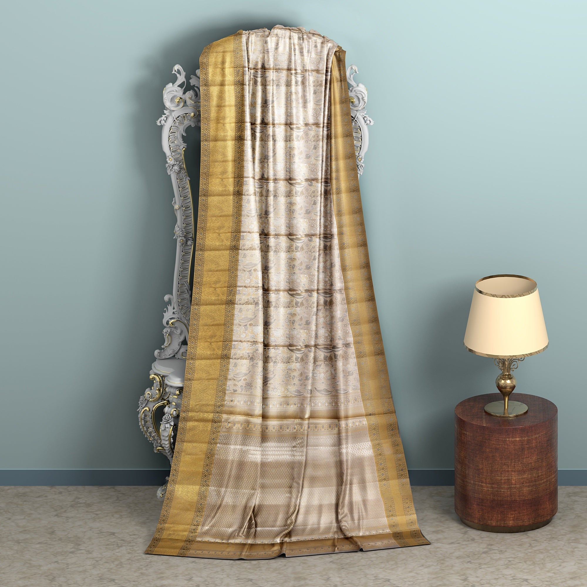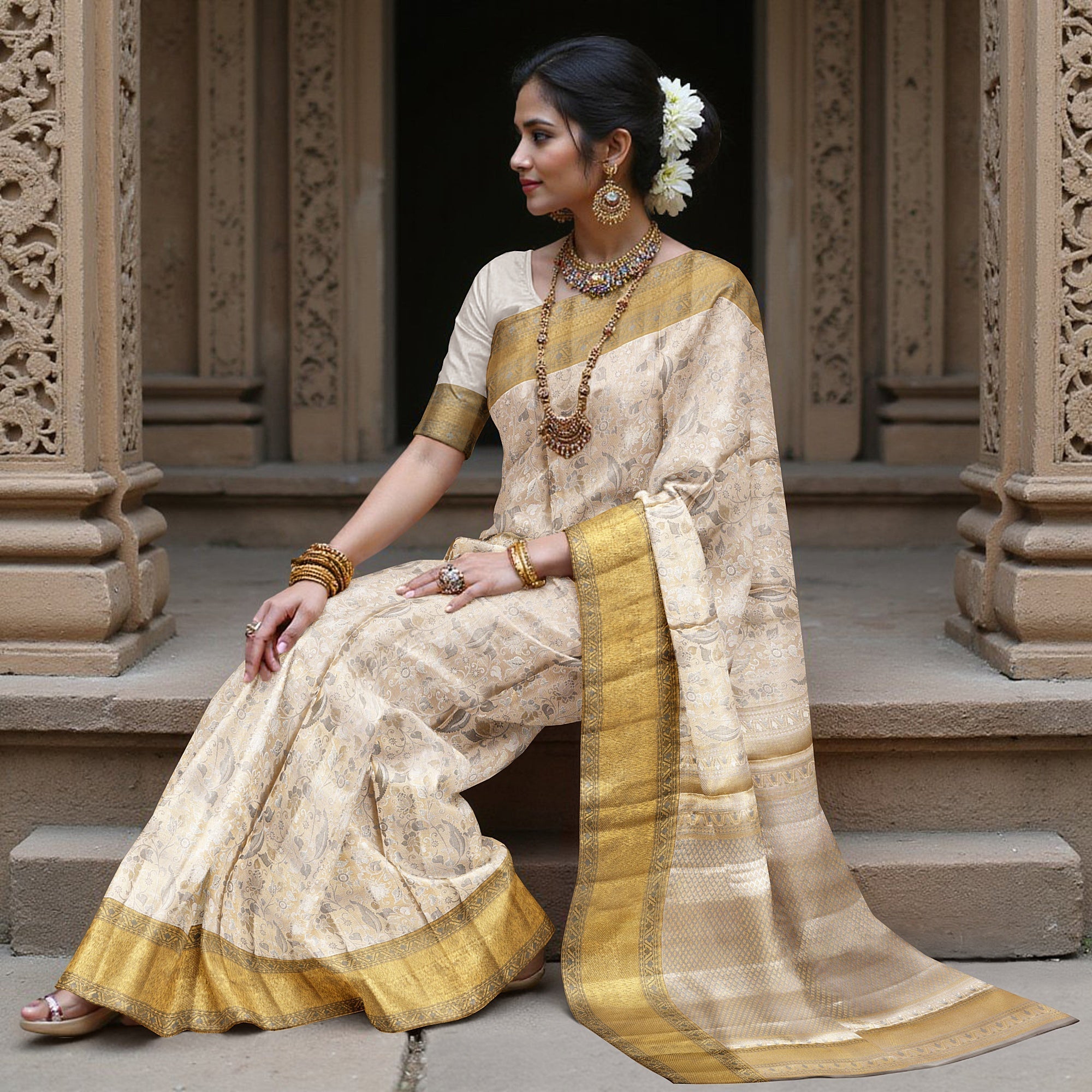 ساري كانجيفارام من الحرير الخالص باللونين العاجي والذهبي، مزين بنقوش زهرية وهندسية منسوجة يدويًا، بطول 5.5 متر مع بلوزة، من أصل هندي - D22674