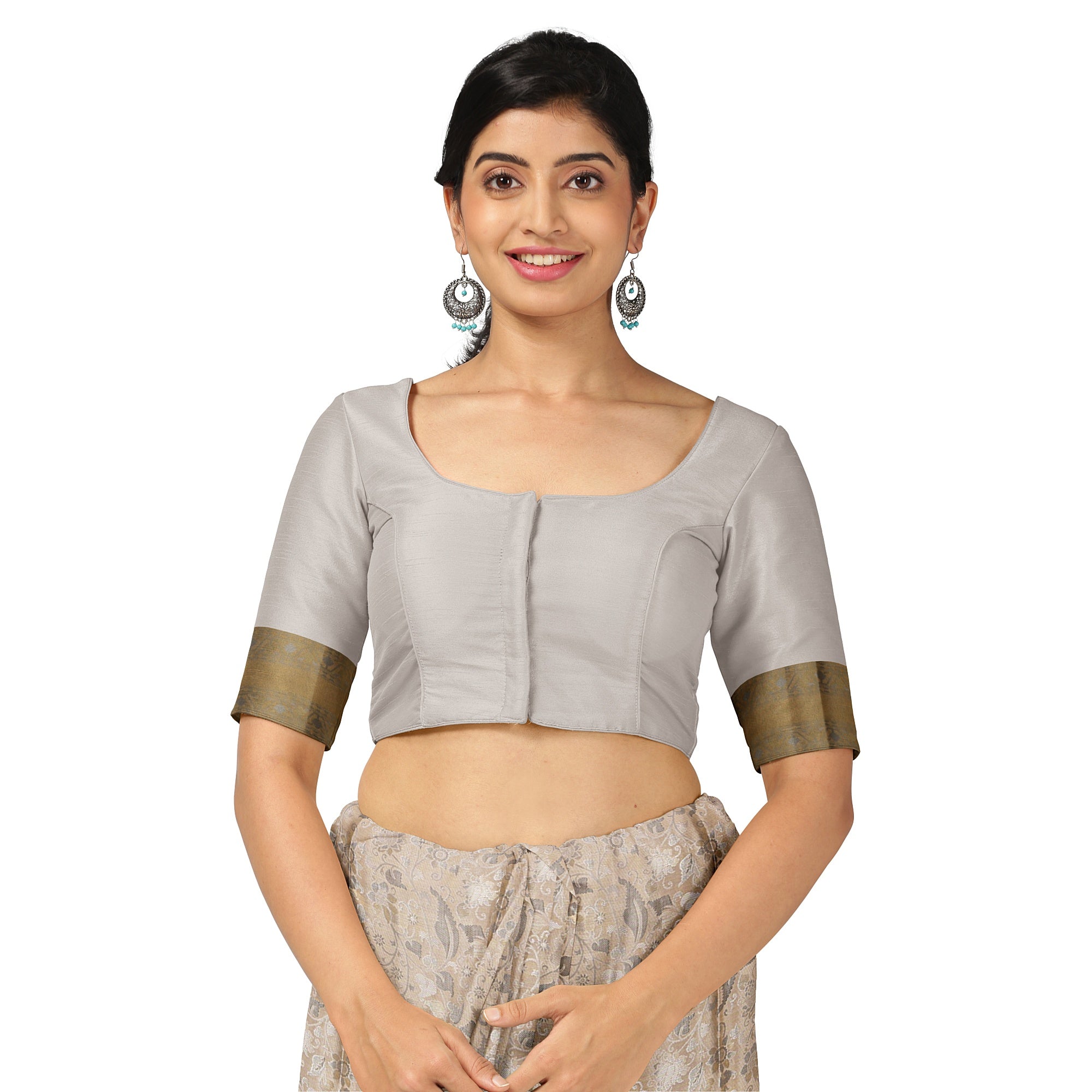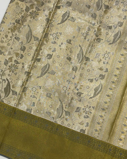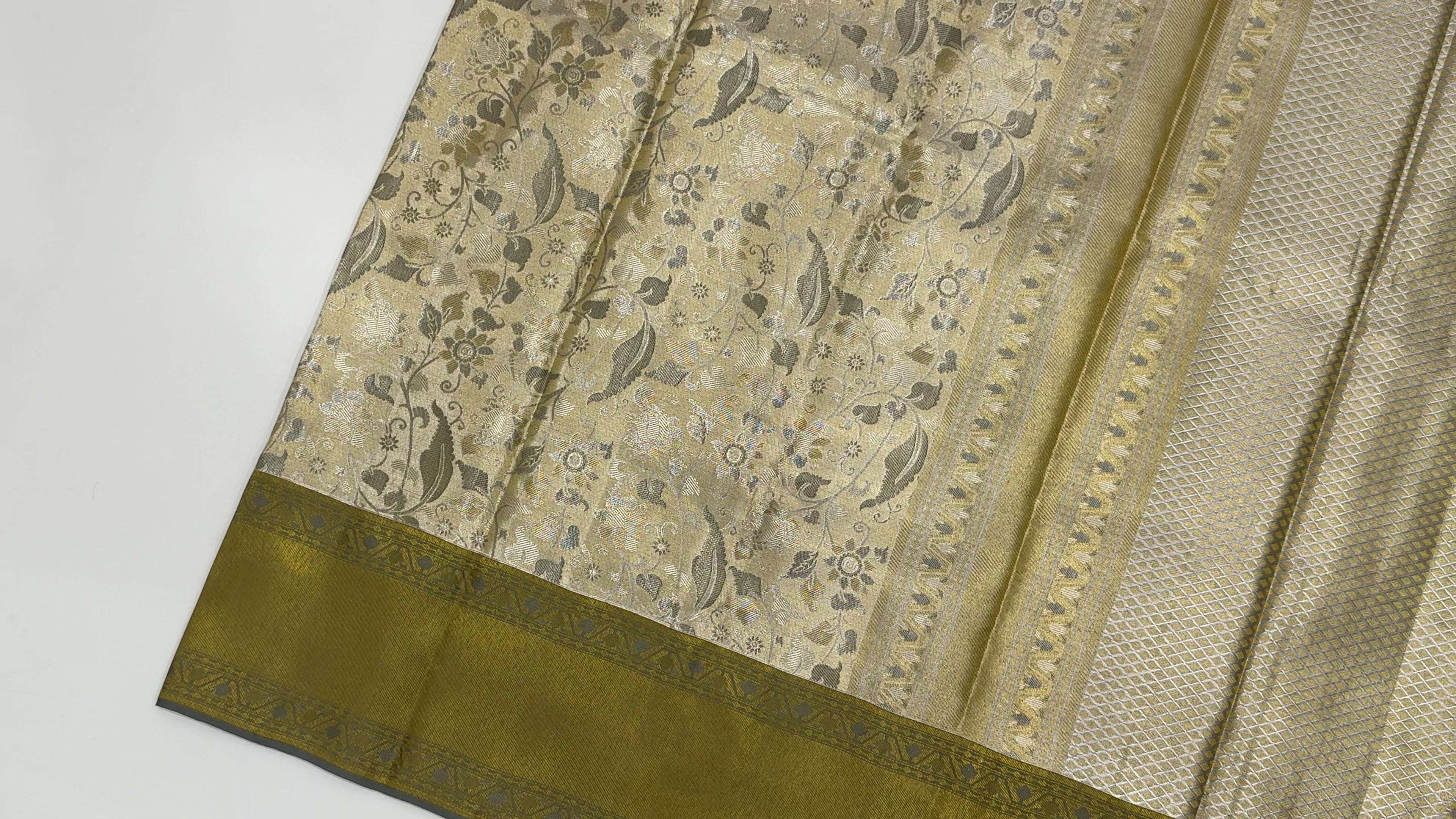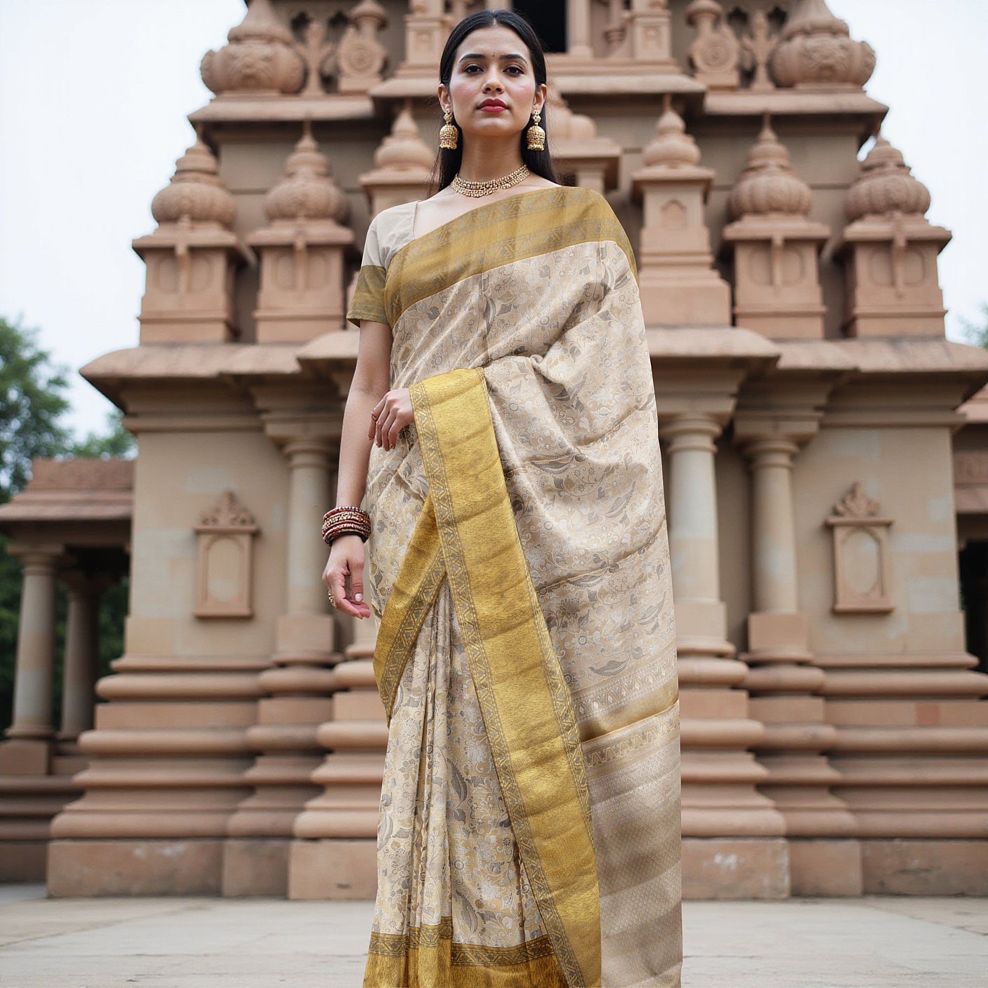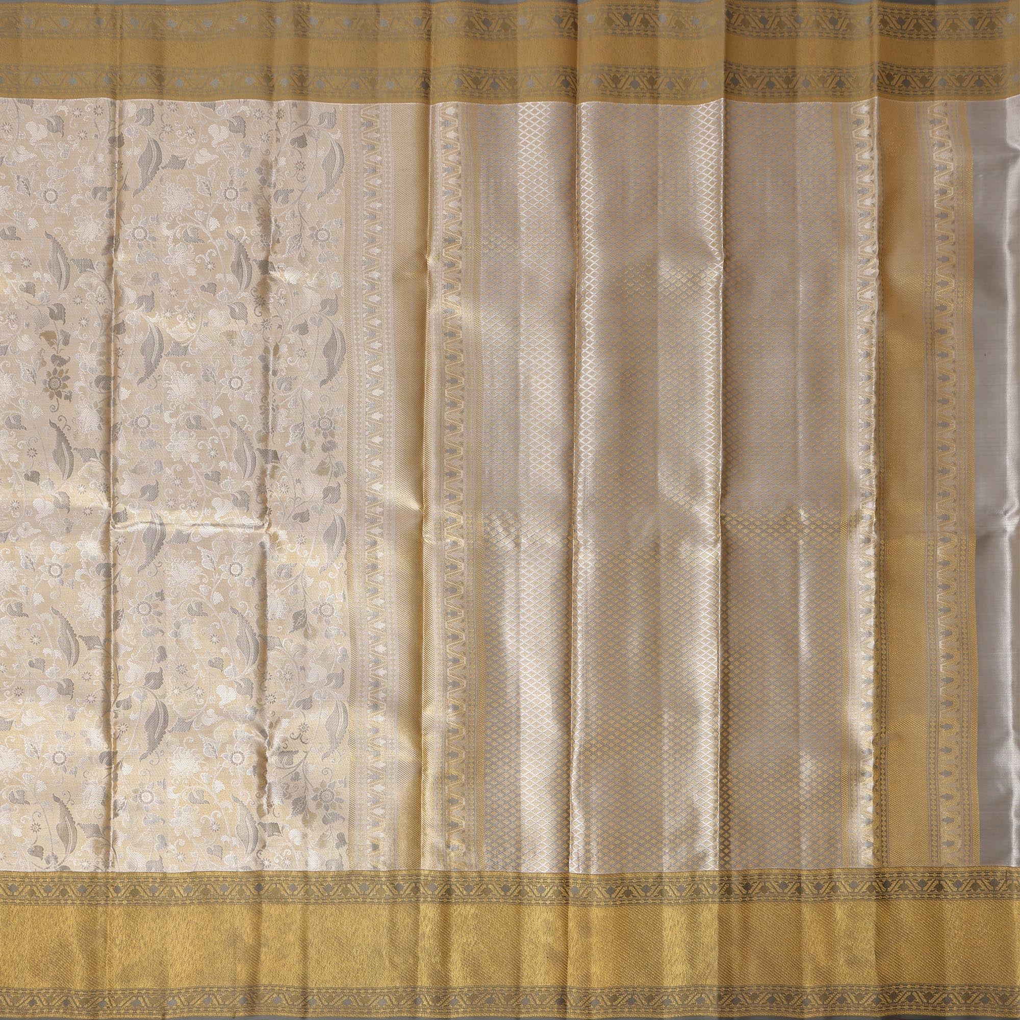 ساري كانجيفارام من الحرير الخالص باللونين العاجي والذهبي، مزين بنقوش زهرية وهندسية منسوجة يدويًا، بطول 5.5 متر مع بلوزة، من أصل هندي - D22674