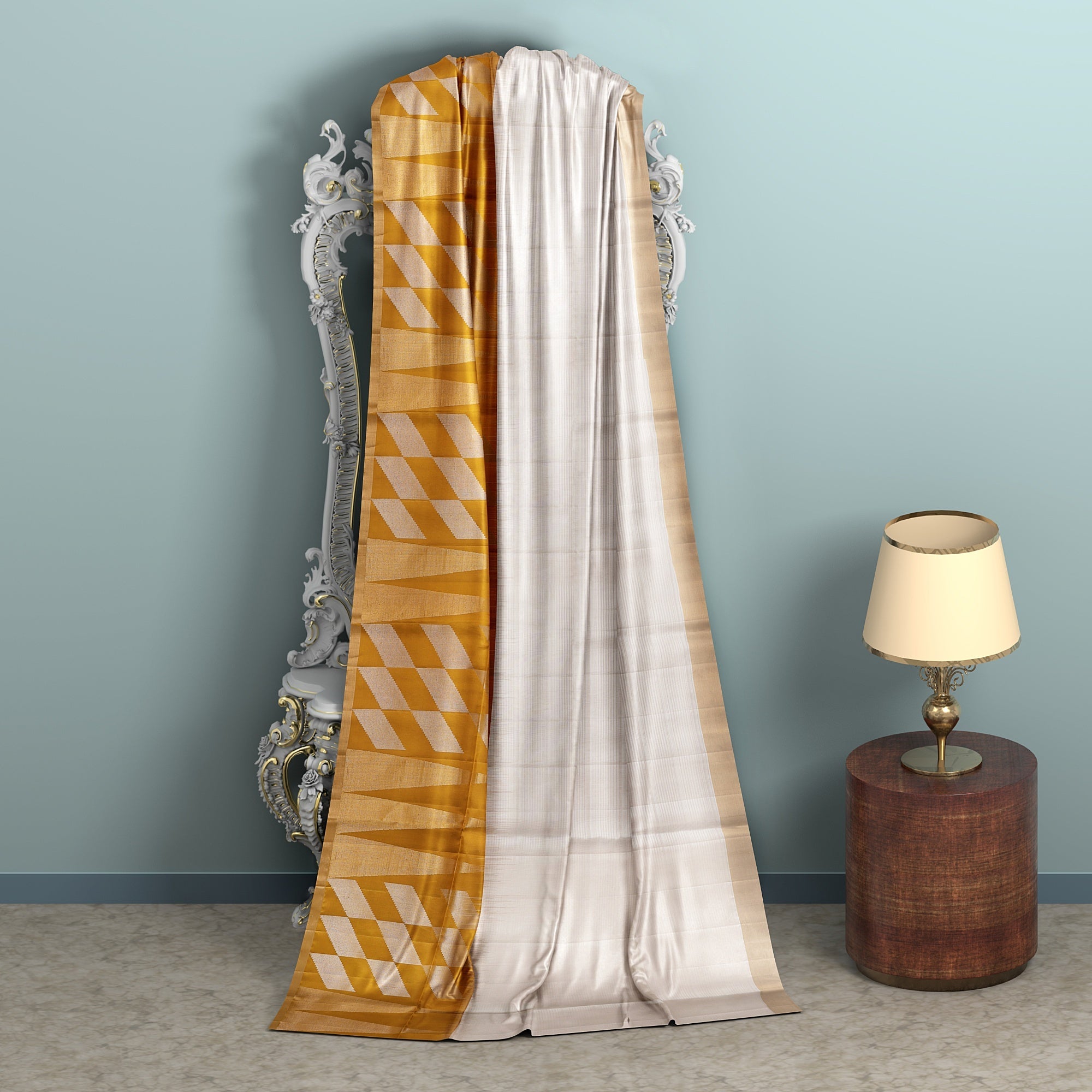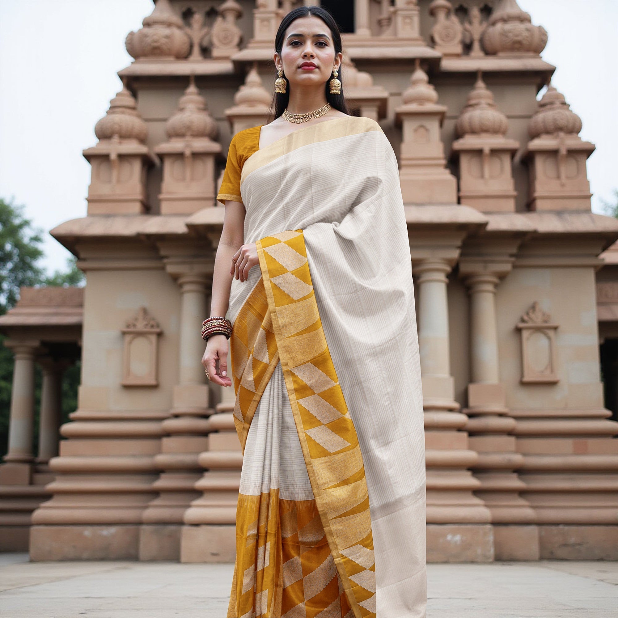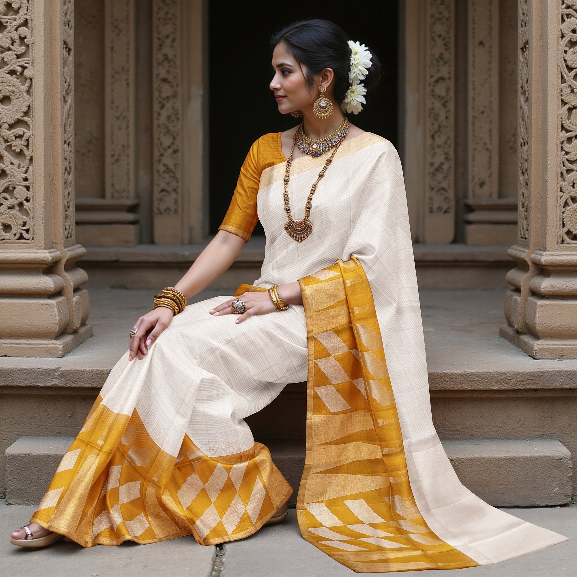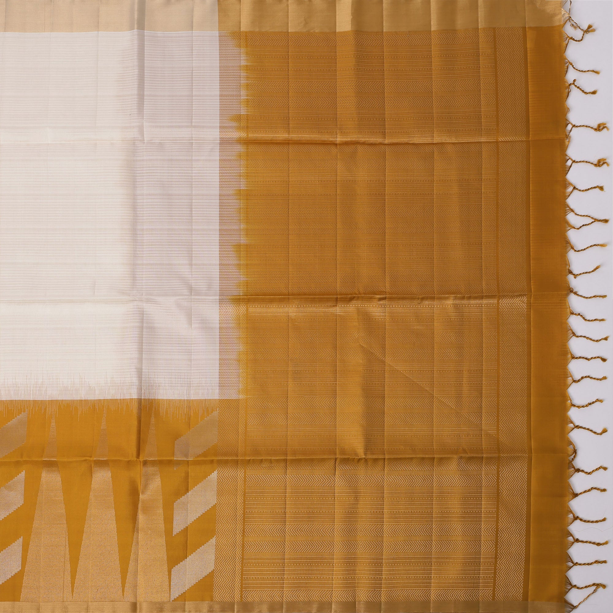 ساري زاري بالو الهندسي باللون العاجي والخردلي من الحرير الخالص الناعم مع حافة ذهبية، 5.5 متر مع قطعة بلوزة، أصله من الهند - D22683