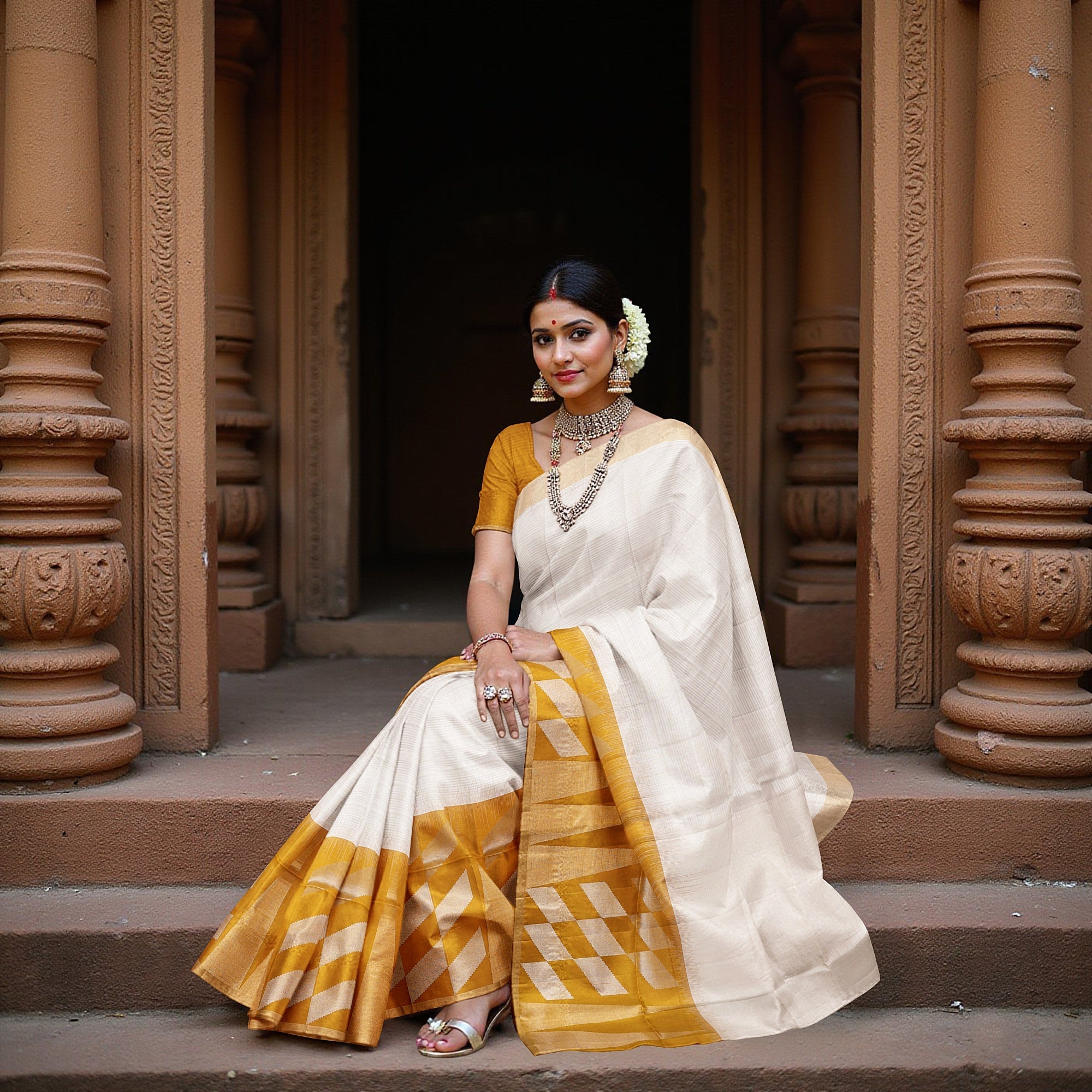 مستوحى من تدرجات الفجر الذهبية التي تتسلل عبر أعمدة المعابد القديمة، يروي هذا الساري الحريري الناعم العاجي والخردلي قصة من الأناقة والبراعة الفنية. يُضفي الجسم العاجي المضيء، المنسوج بخيوط حريرية نقية، لمسةً هادئةً تتناقض ببراعة مع قماش بالو الخردلي الغني المزين بنقوش زاري هندسية جريئة. كل خط تصميم هو شهادة على 36 ساعة من الحياكة اليدوية الدقيقة على يد حرفيين مهرة، تحافظ حرفتهم على إرث الأنوال التقليدية. ينساب الحرير الفاخر بسلاسة، ليمنحكِ إطلالةً ملكيةً في كل مناسبة. يأتي هذا الساري مع بلوزة من قماش مطابق، مما يجعله مثاليًا لحفلات الزفاف والمهرجانات والاحتفالات الأنيقة. تسوقي عبر الإنترنت الآن لتتألقي بحرف جنوب الهند الخالدة.