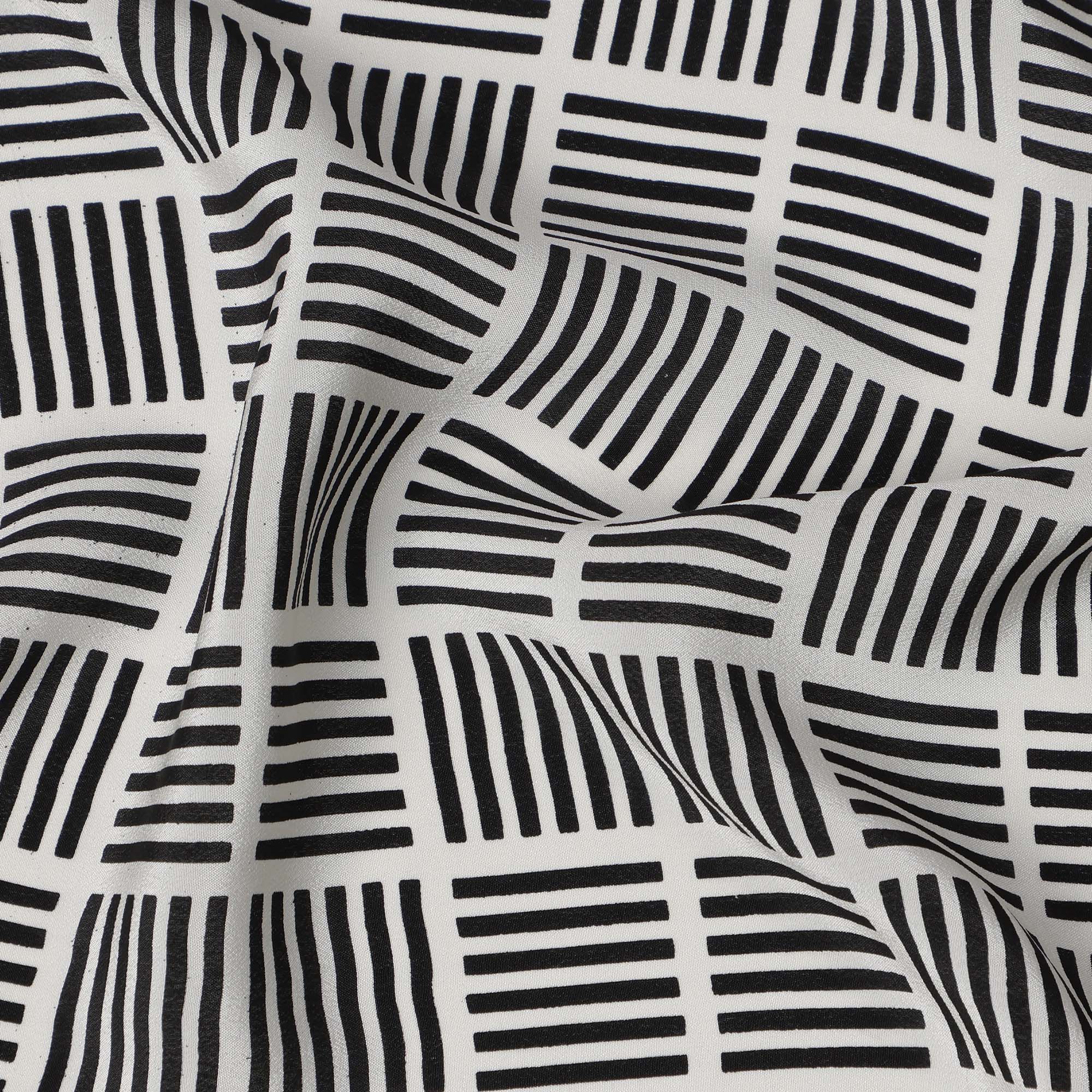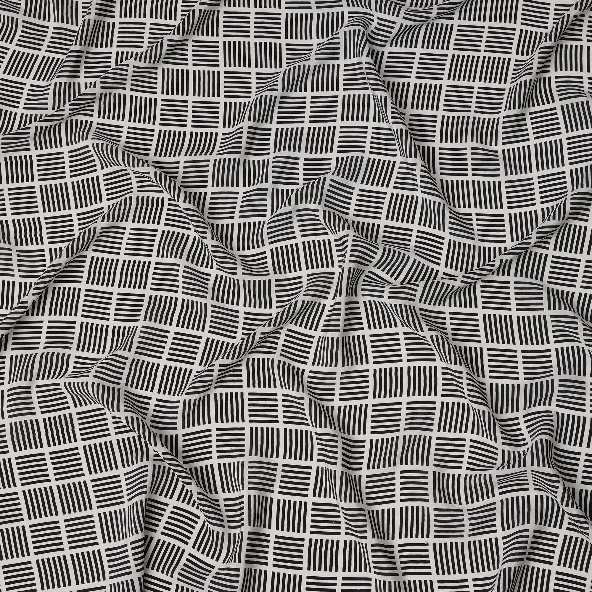 قماش كريب حريري خالص بطبعة مربعات سوداء، قاعدة عاجية، عرض 110 سم، صنع في الهند - D23167