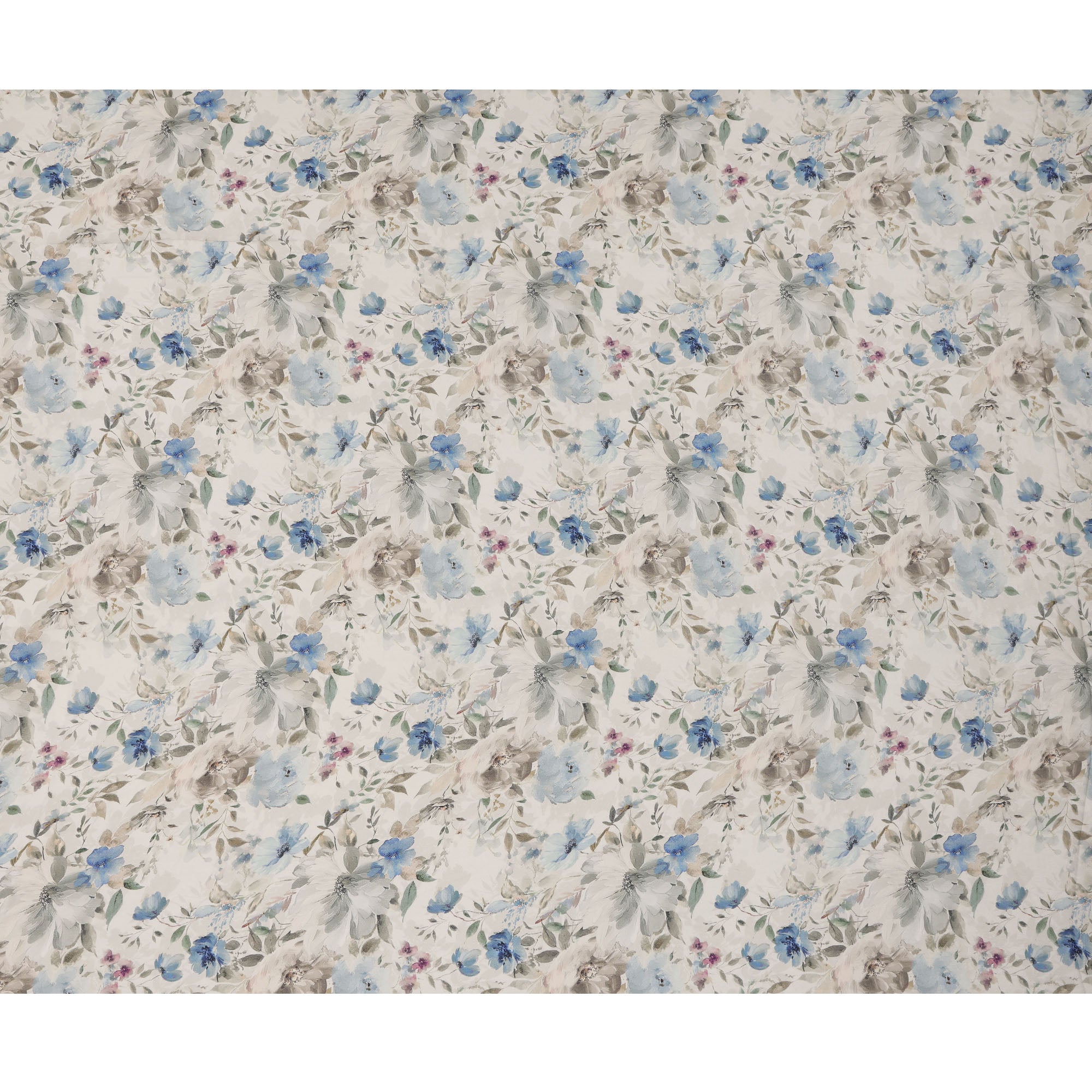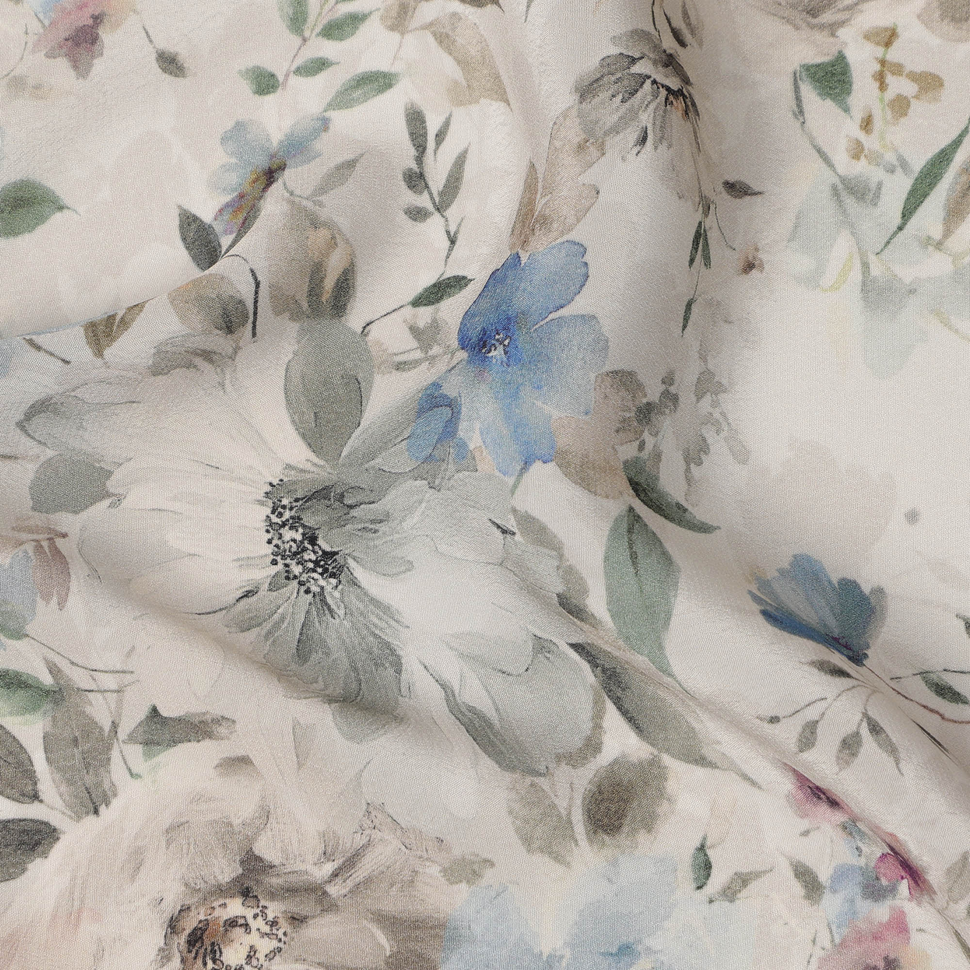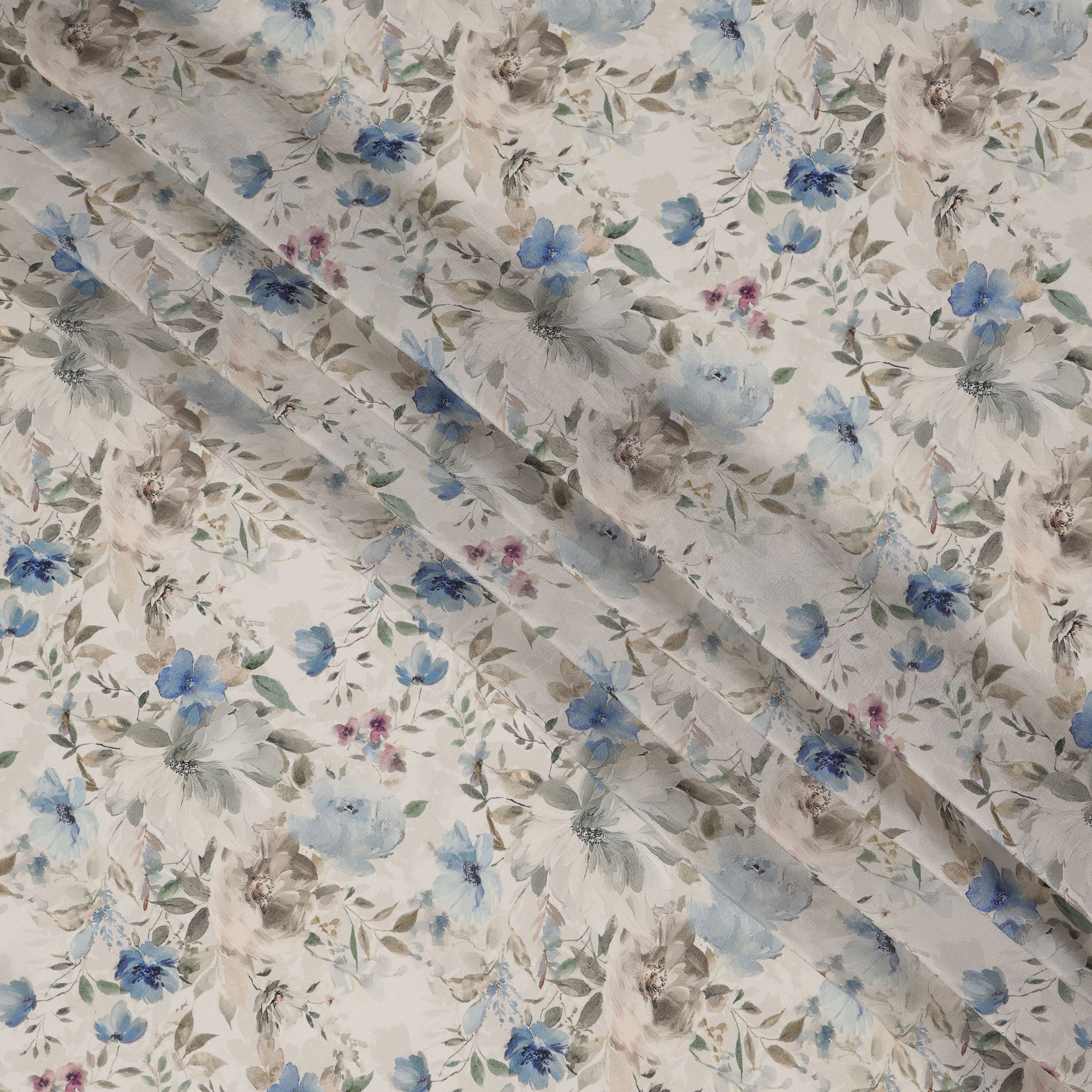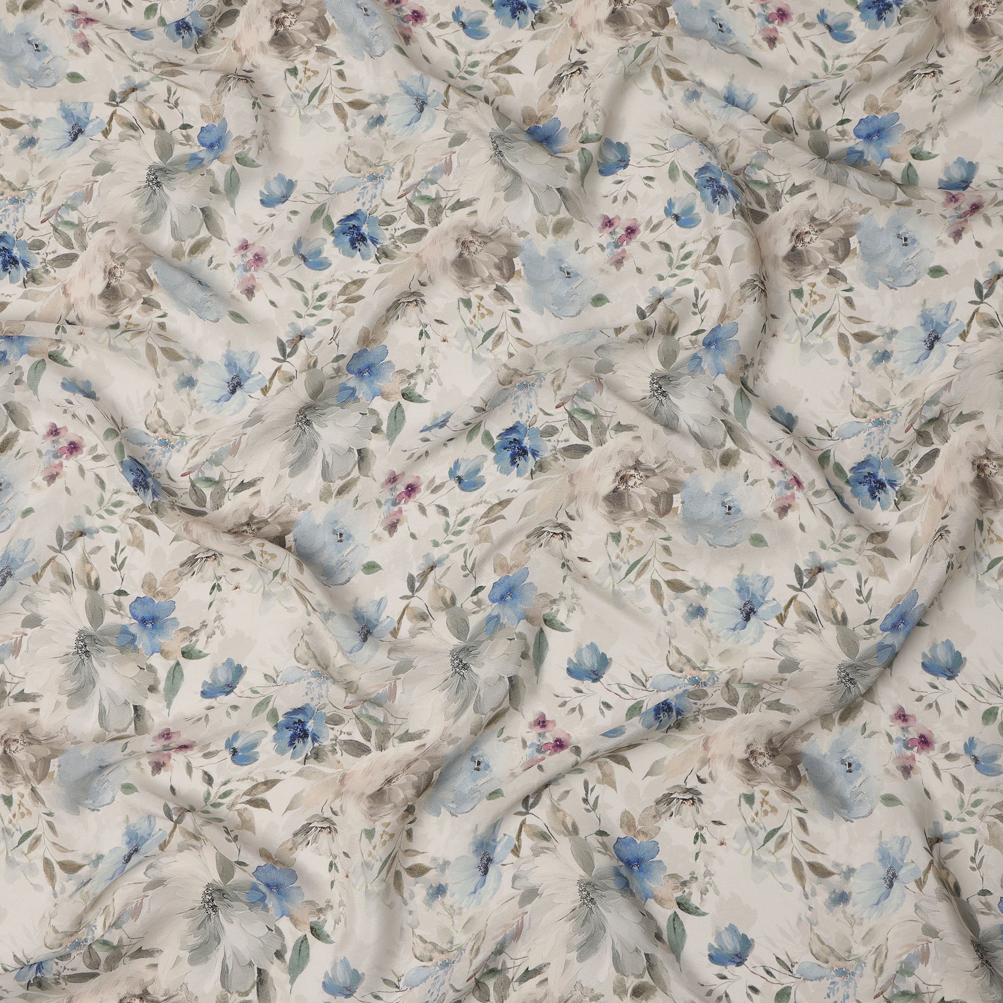 قماش كريب فيسكوز مطبوع عليه زهور باللونين الأزرق والبيج، قاعدة عاجية، مع تفاصيل أوراق بألوان مائية، عرض 110 سم، صنع في الهند - D23411