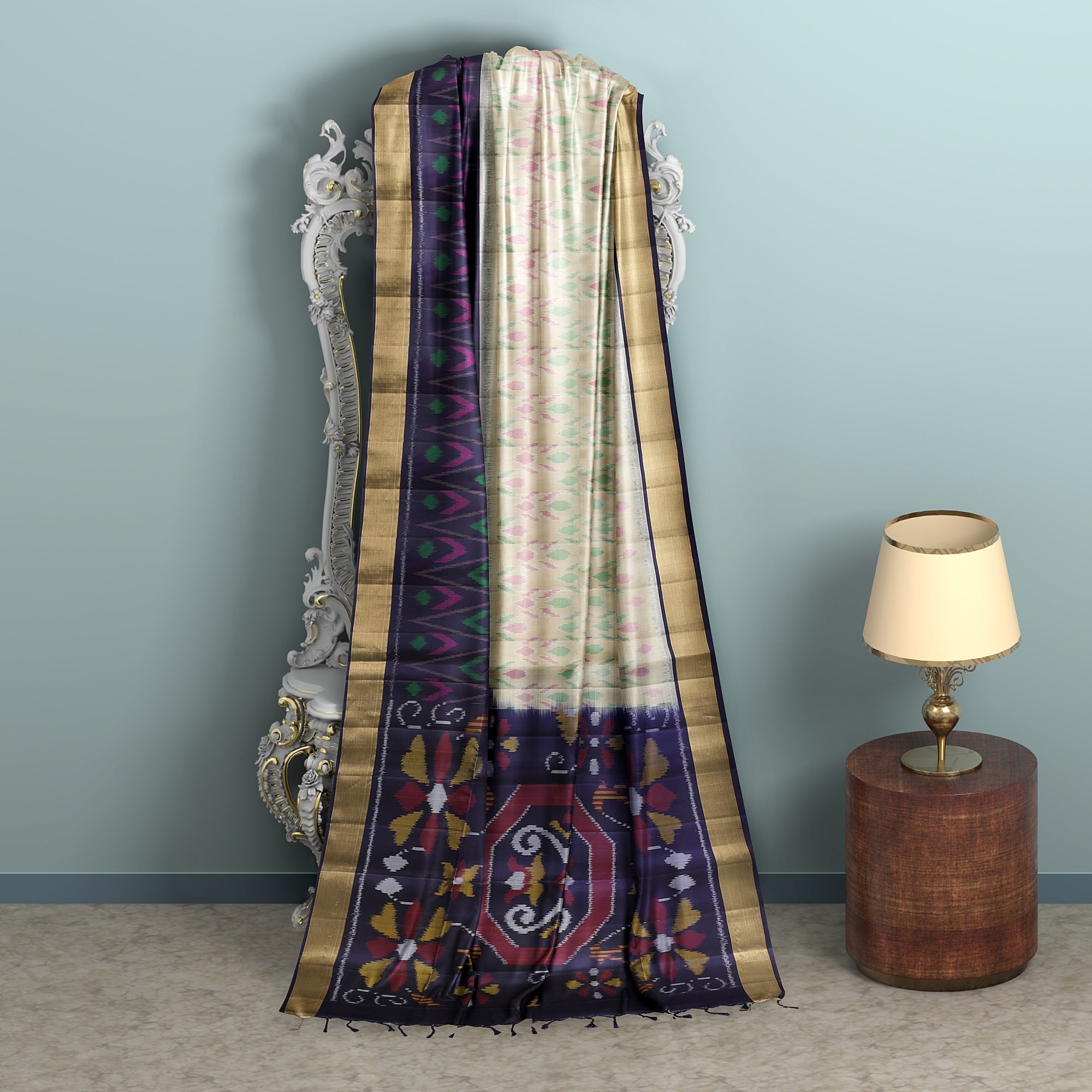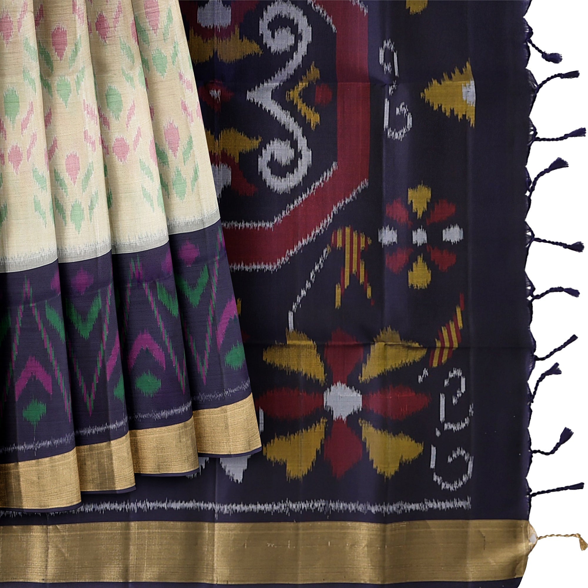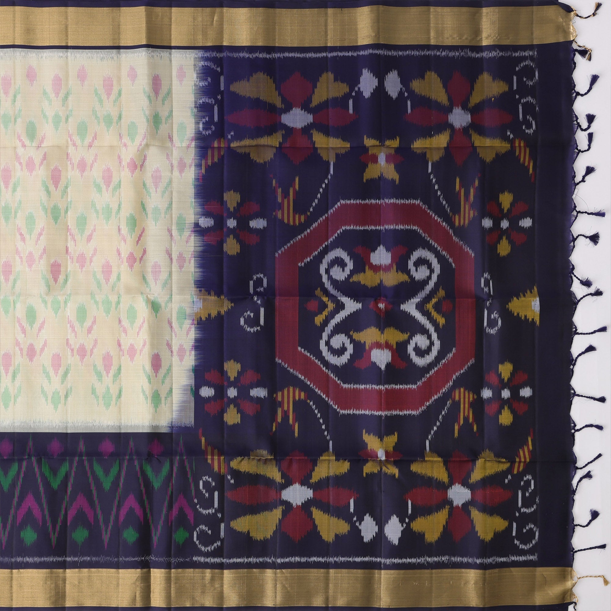 ساري عاجي بودي بطبعة إيكات متعددة الألوان ومطرز بنقشة بالو من الحرير الخالص باللون الأزرق الداكن، بطول 5.5 متر مع بلوزة، منسوج يدويًا من الهند - D22745