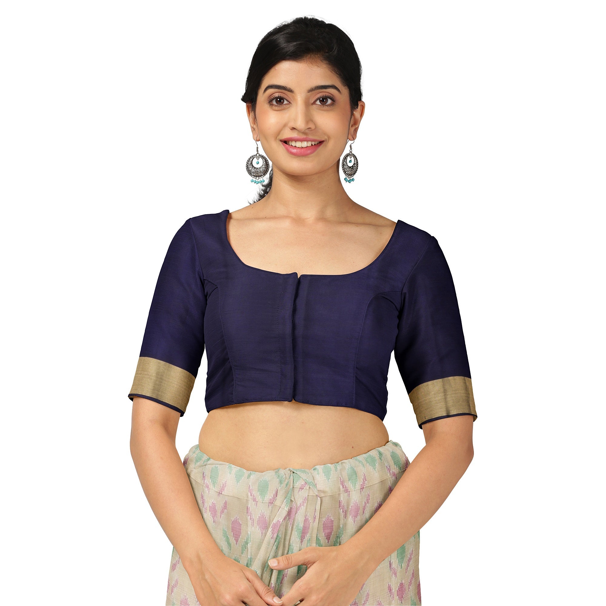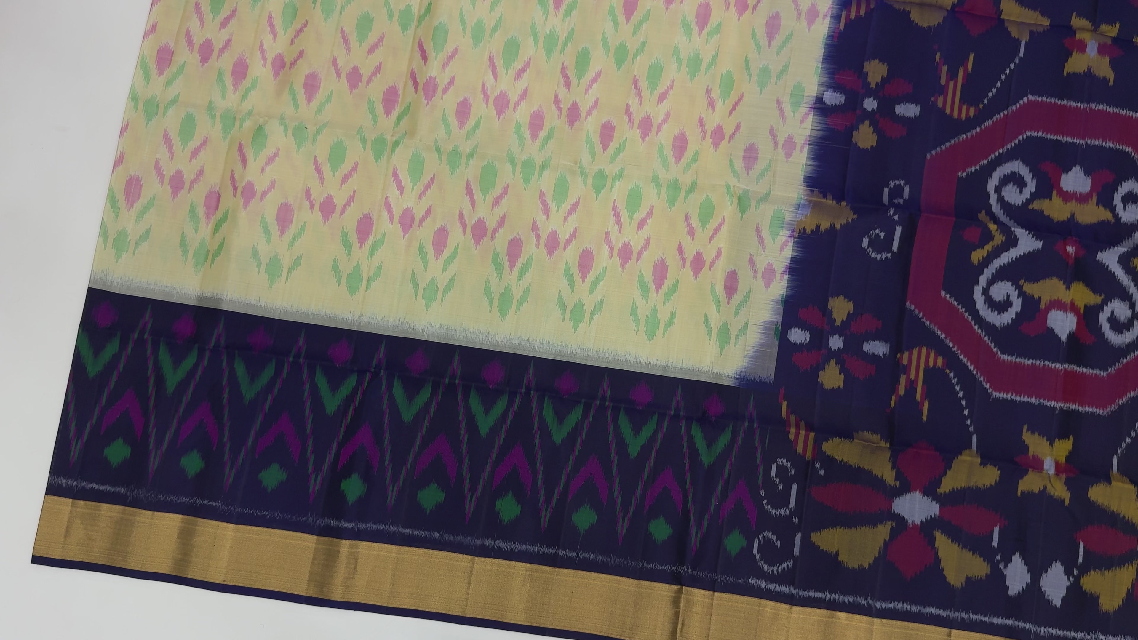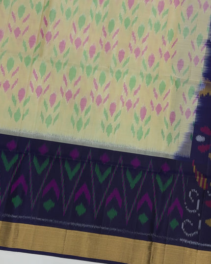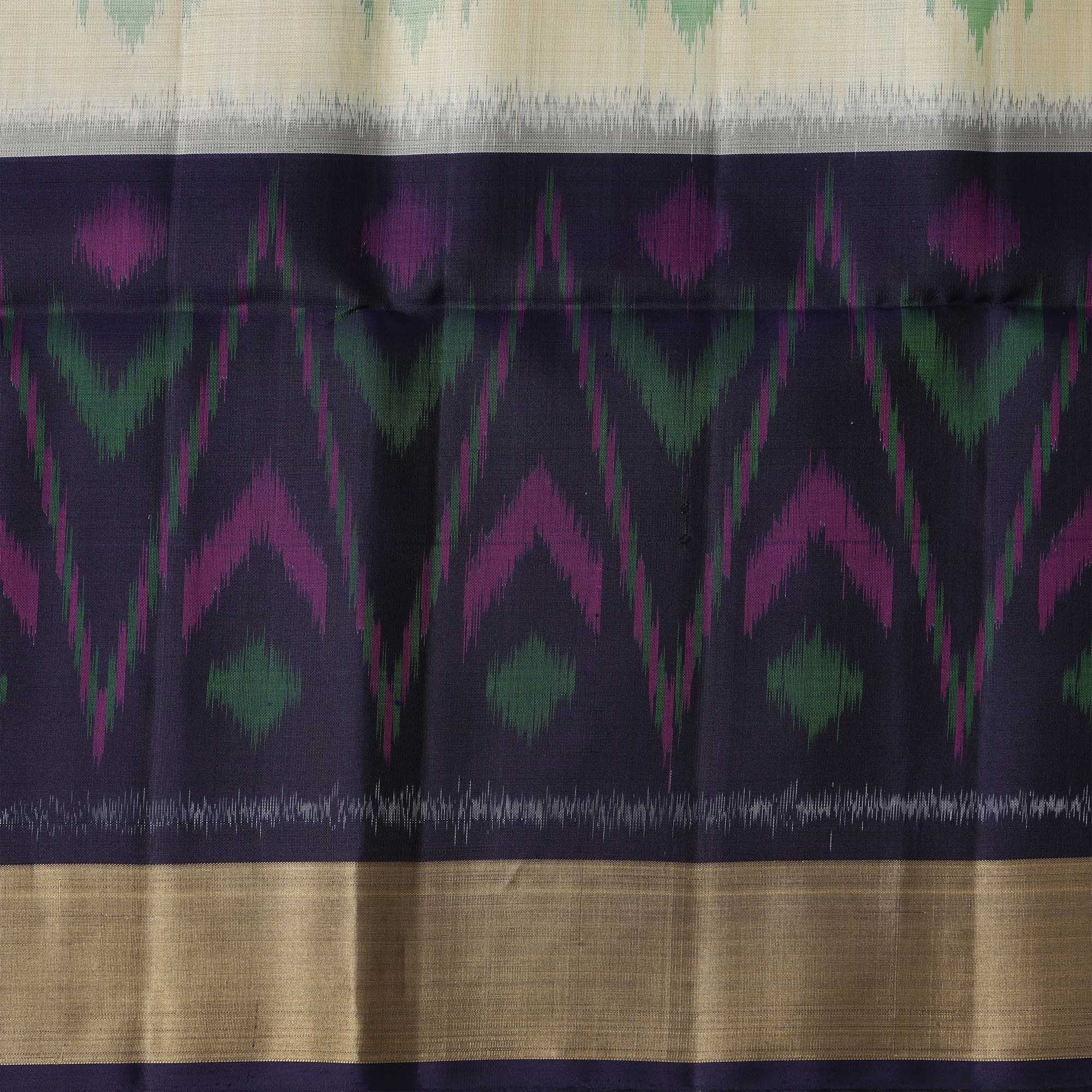 ساري عاجي بودي بطبعة إيكات متعددة الألوان ومطرز بنقشة بالو من الحرير الخالص باللون الأزرق الداكن، بطول 5.5 متر مع بلوزة، منسوج يدويًا من الهند - D22745