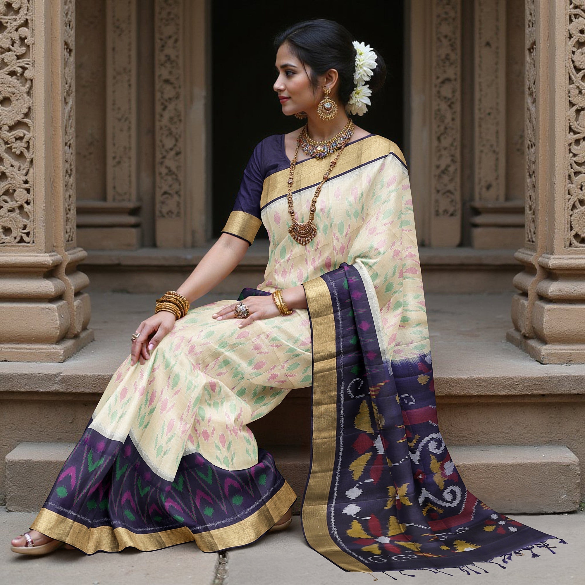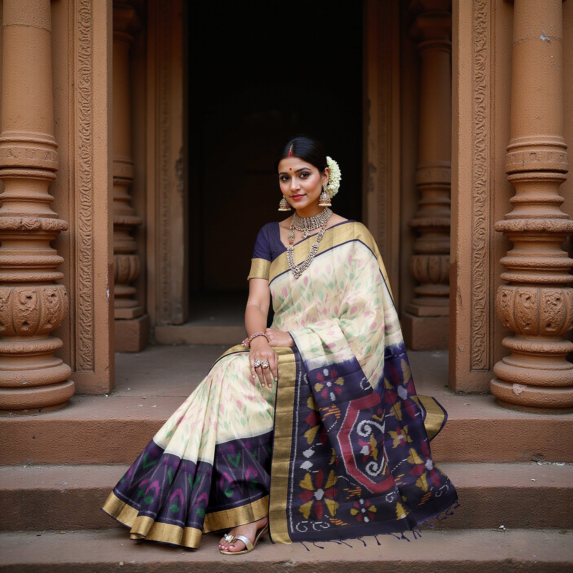 هذا الساري العاجي المصنوع من الحرير الناعم الخالص، والمُغلف بأناقة التقاليد، بزخارفه متعددة الألوان المستوحاة من الإيكات، يرقص كضربات فرشاة على لوحة فنية. يُحيط بالساري الأزرق الداكن الجريء وحوافه، المزينة بتصاميم مستوحاة من المعابد، الجسم بتباين ملكي، بينما تمتزج درجات اللون الأخضر والوردي واللافندر الرقيقة بنعومة على القاعدة العاجية. هذا الساري ثمرة 36 ​​ساعة من الحرفية الدقيقة، حيث نسج كل خيط يدويًا على يد نساجين ماهرين. إنه ليس مجرد ساري؛ إنه فنٌّ يُلبس - حكاية من الثقافة والألوان والحرير الفاخر الذي ينساب كالهمس. خيارٌ خالدٌ للحظات الاحتفالية، والفعاليات الثقافية، والاحتفالات الكبرى.