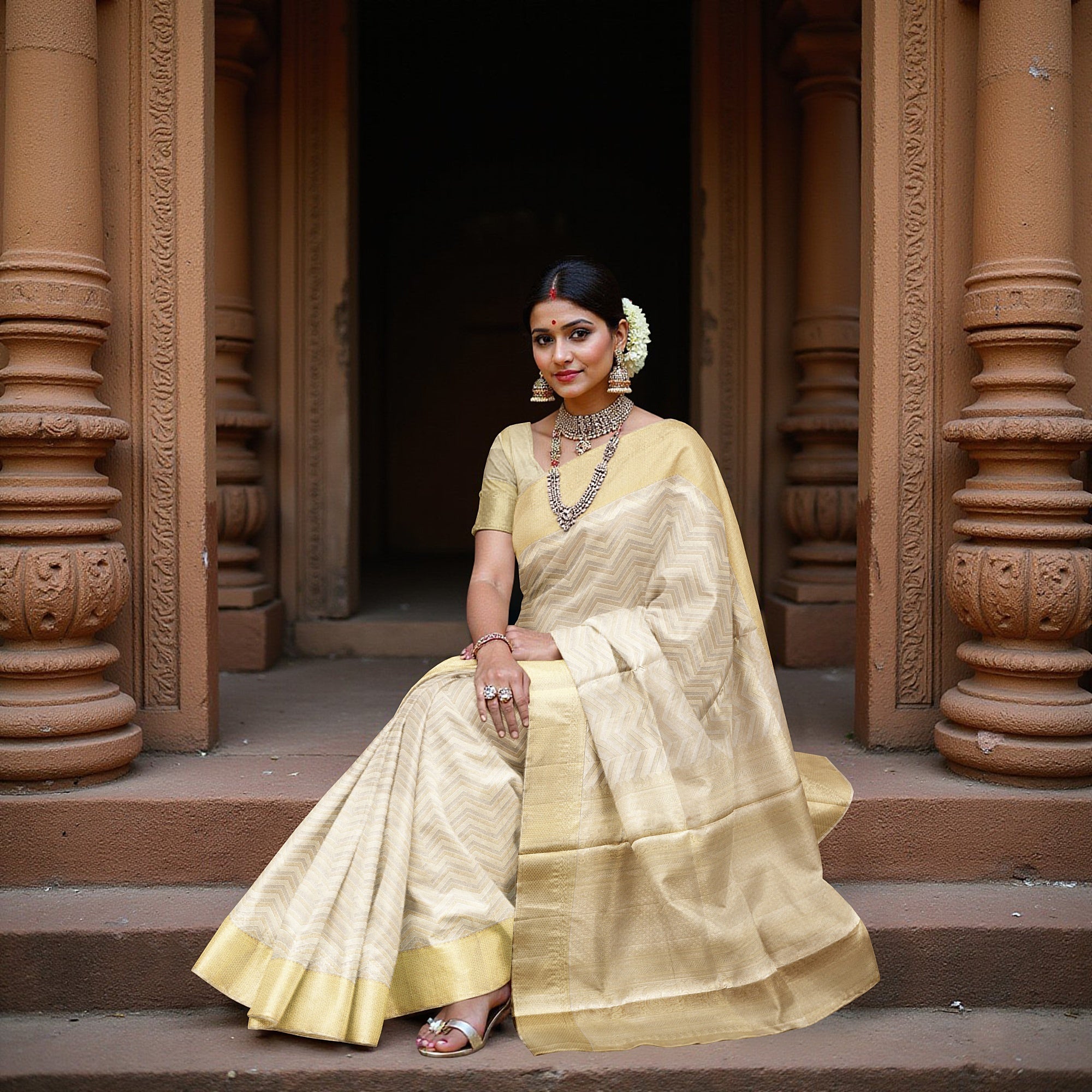 ساري كانجيفارام العاجي الكريمي، المصنوع من الحرير الخالص، يُجسّد نقوش جدران المعابد والمنحوتات الإلهية، ويتألق بأناقة بفضل زخارفه المزخرفة بنمط الزاري المتداخل، والتي تنساب برشاقة على البالو والطيات. يُجسّد قوامه الكريمي اللامع، المُحاط بلمسات ذهبية لامعة، روعة فنون جنوب الهند العريقة. يتطلب كل ساري 48 ساعة من الحياكة اليدوية الدقيقة على يد حرفيين مهرة يتوارثون حرفتهم جيلاً بعد جيل. منسوج من الحرير الفاخر، هذا الساري أكثر من مجرد زي، بل هو إرثٌ يُرتدى. مثالي لحفلات الزفاف والمناسبات الاحتفالية، تسوق عبر الإنترنت لتستمتع بالتقاليد الخالدة في كل قطعة.